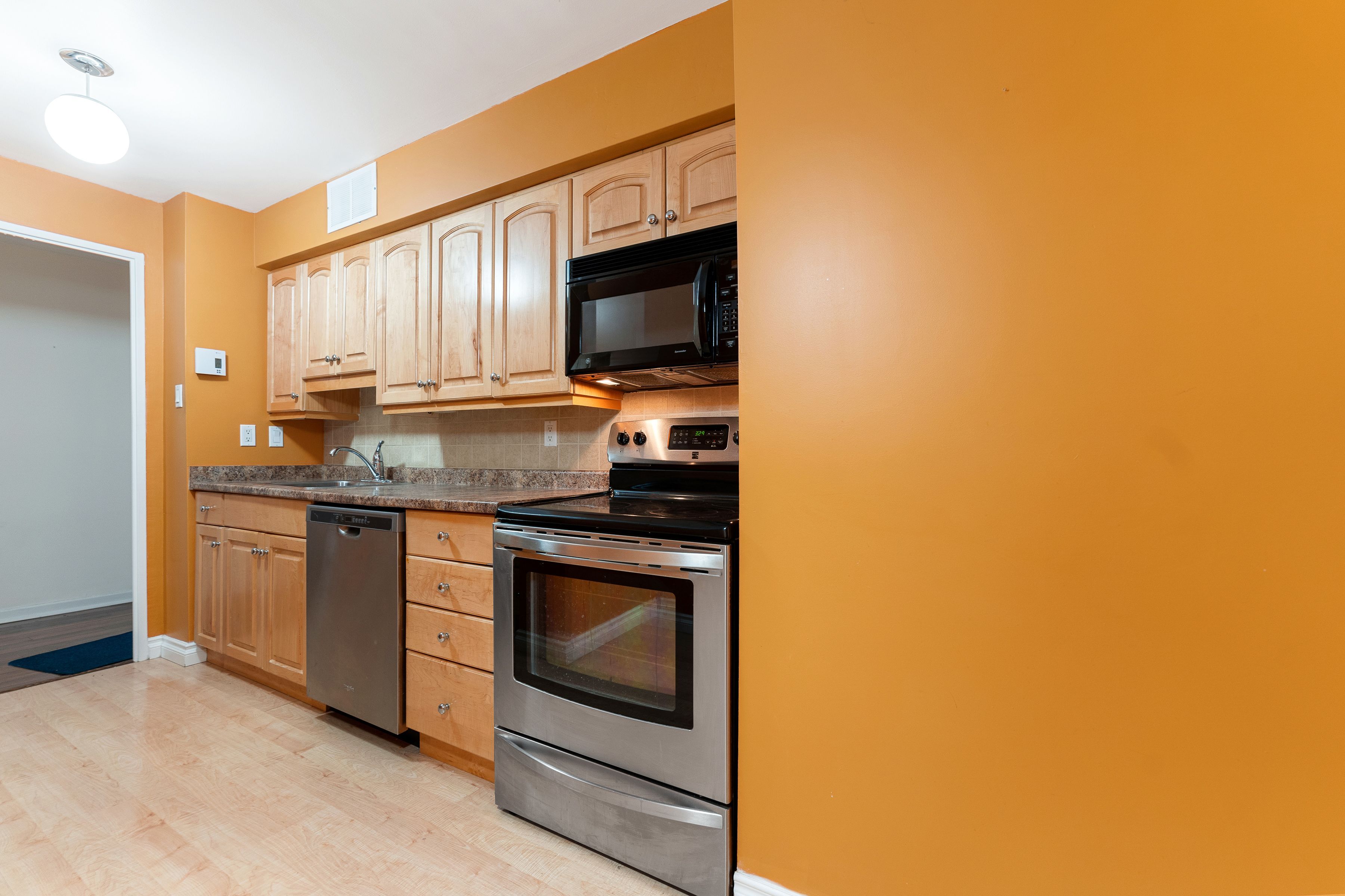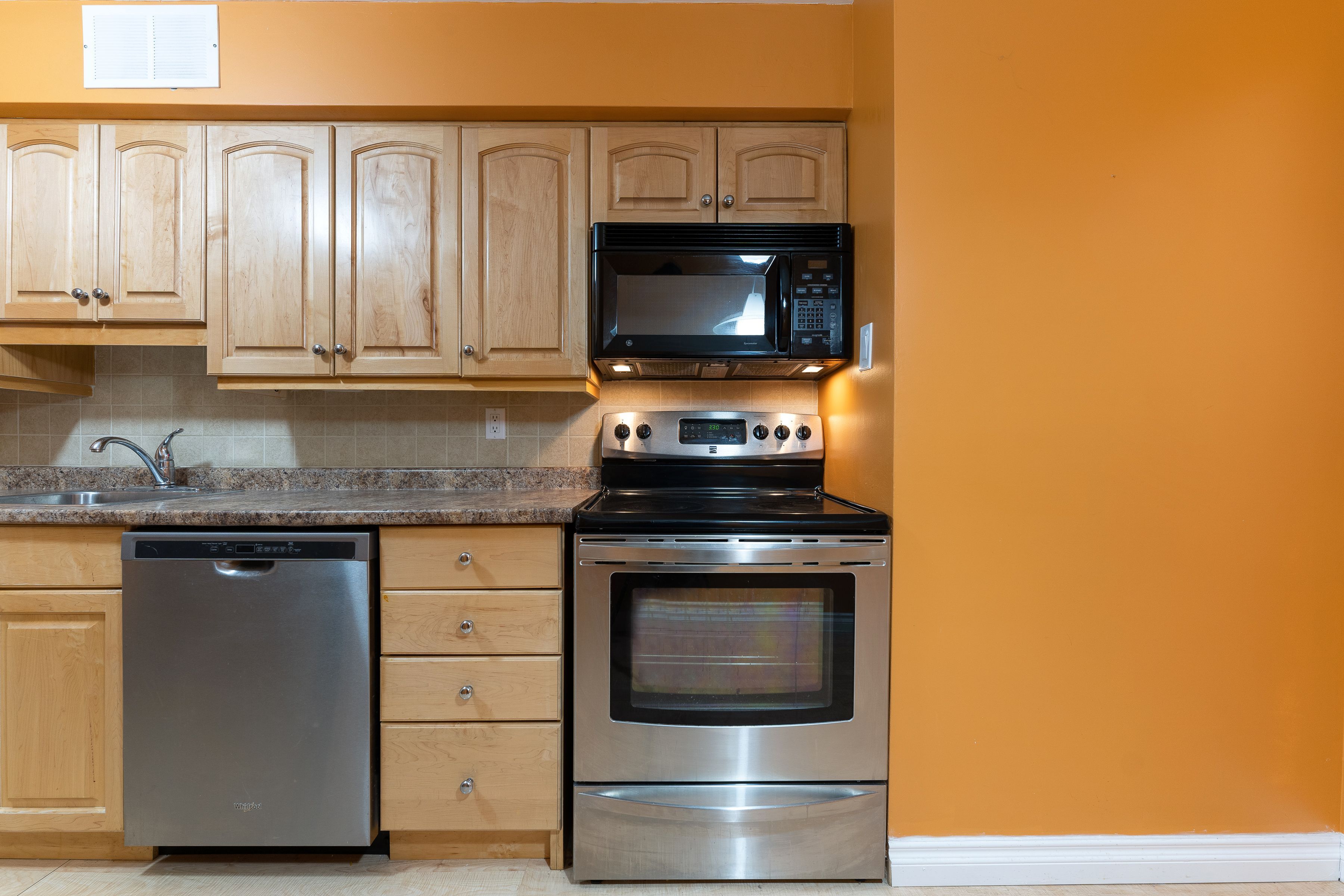 • Custom maple cabinetry and modern stainless steel appliances in the kitchen.