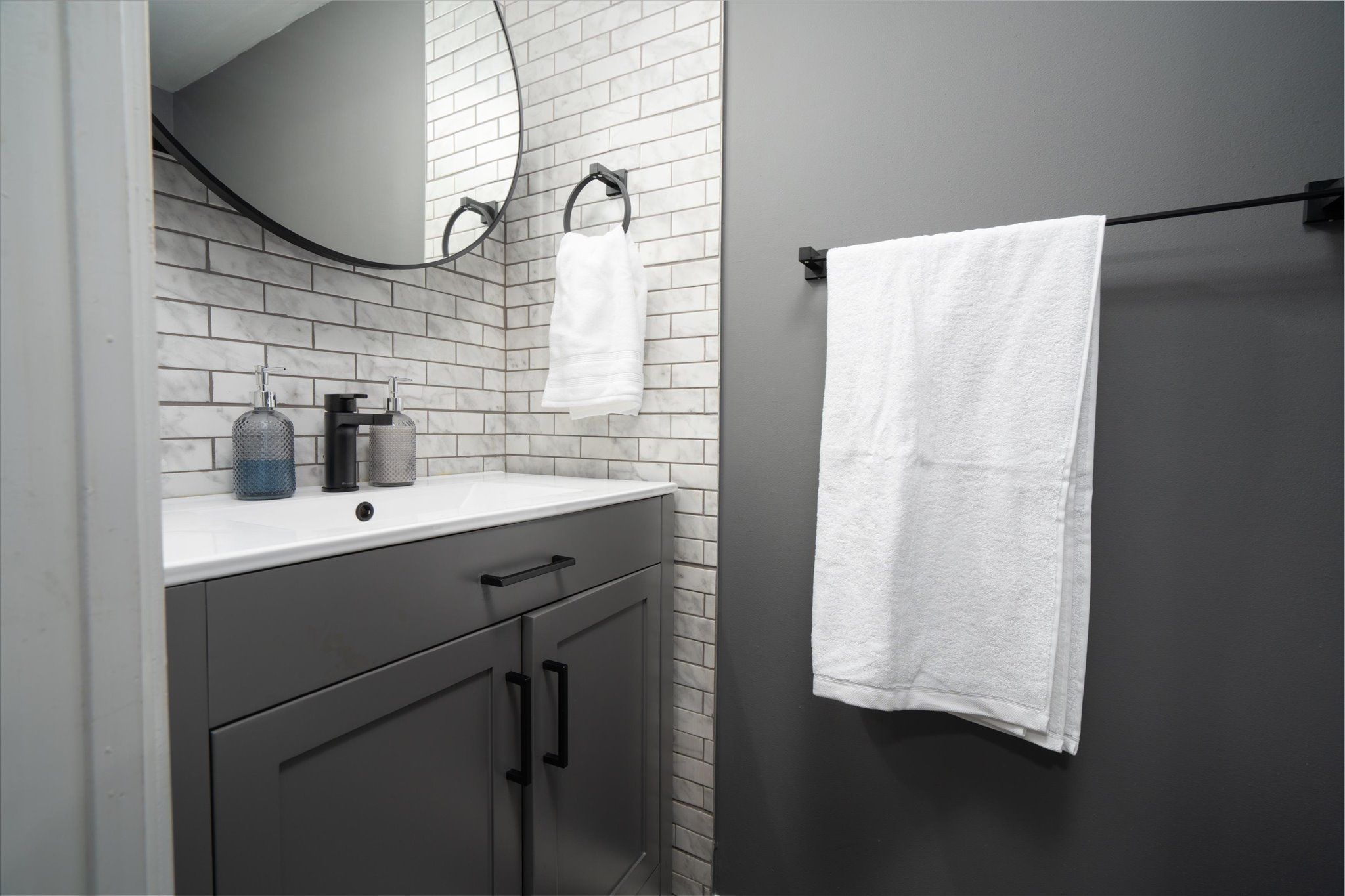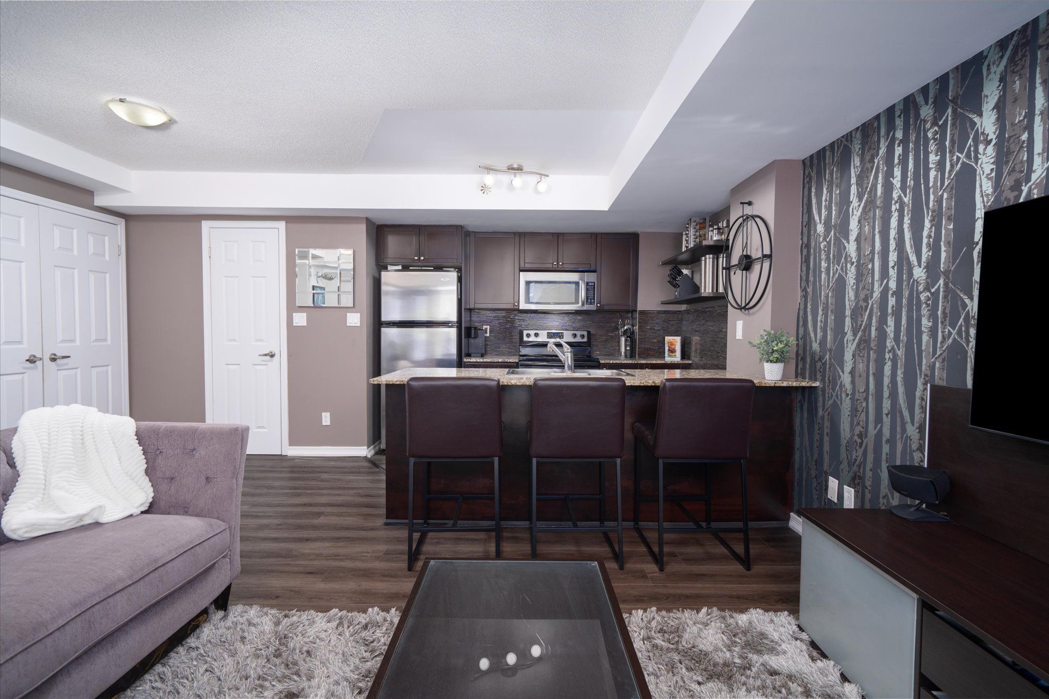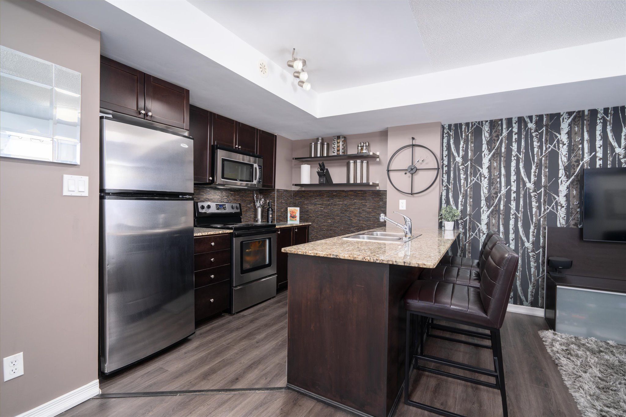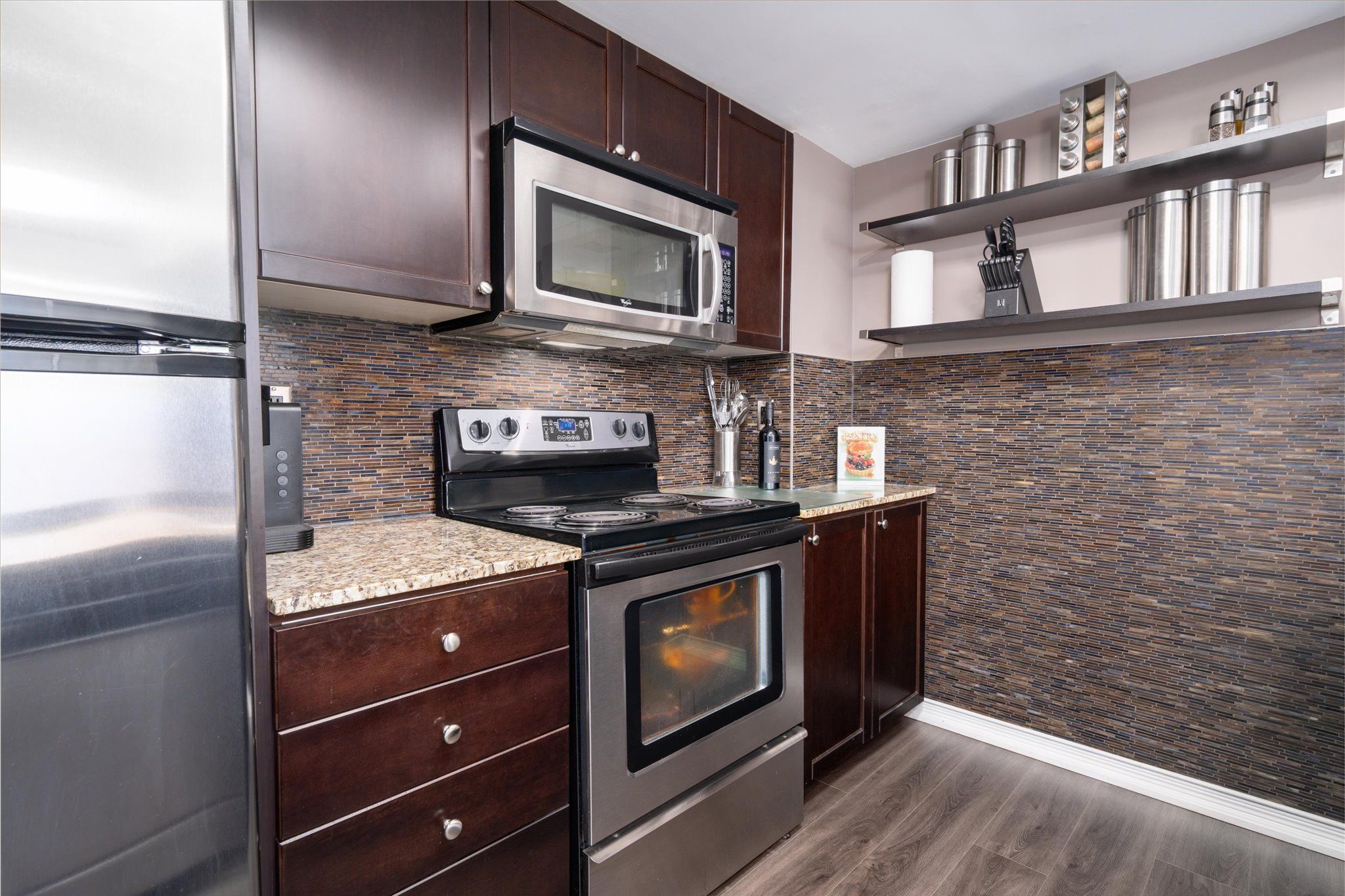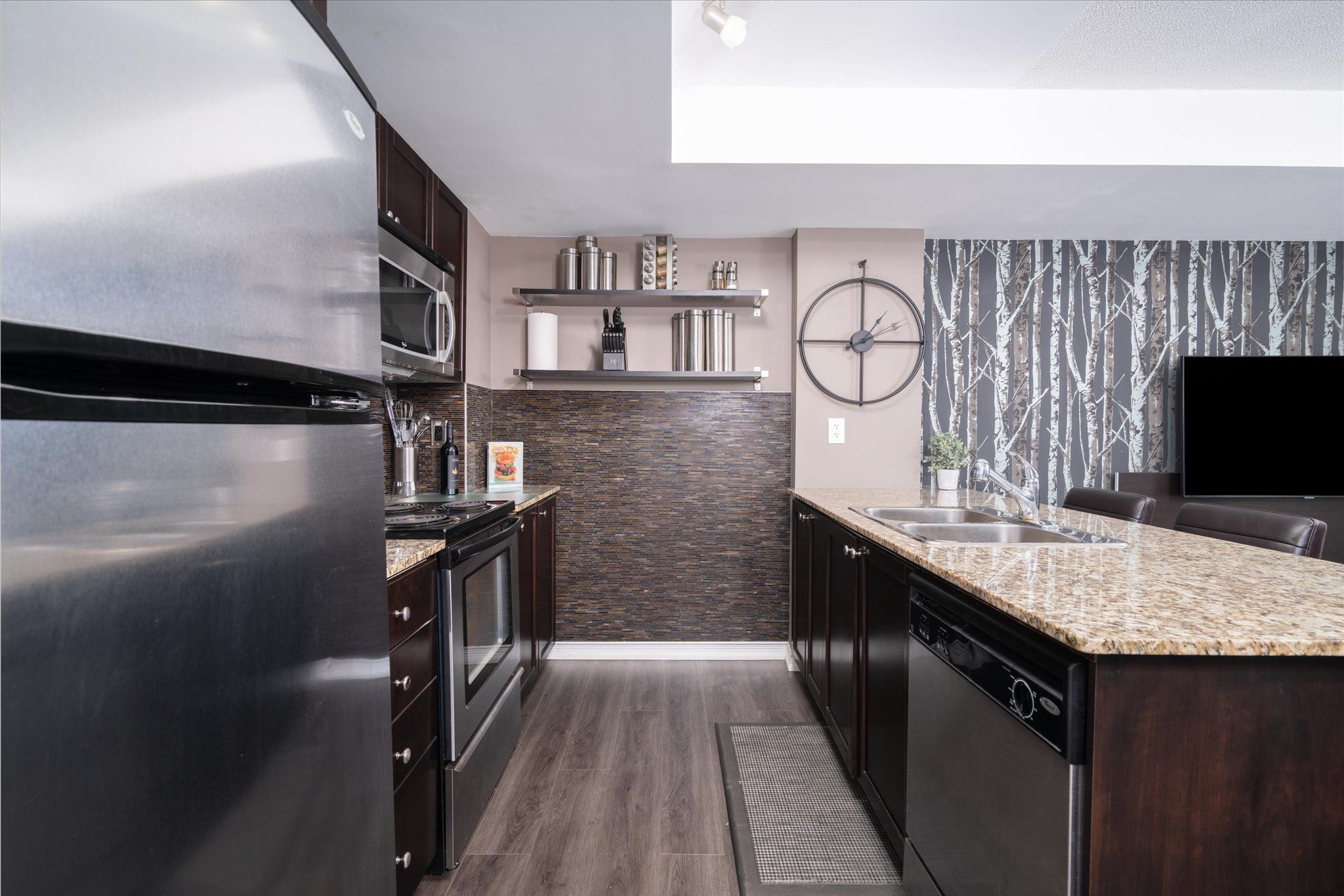 • Modern kitchen features granite countertops and ample cabinetry.