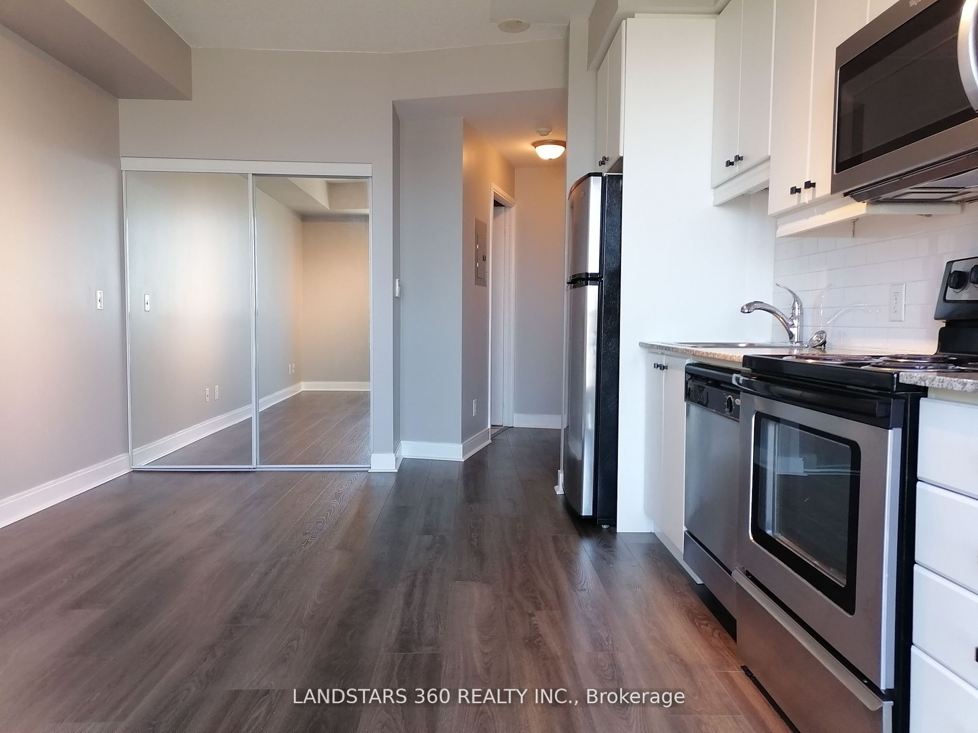 • Studio apartment features 9-foot ceilings and modern stainless steel appliances.