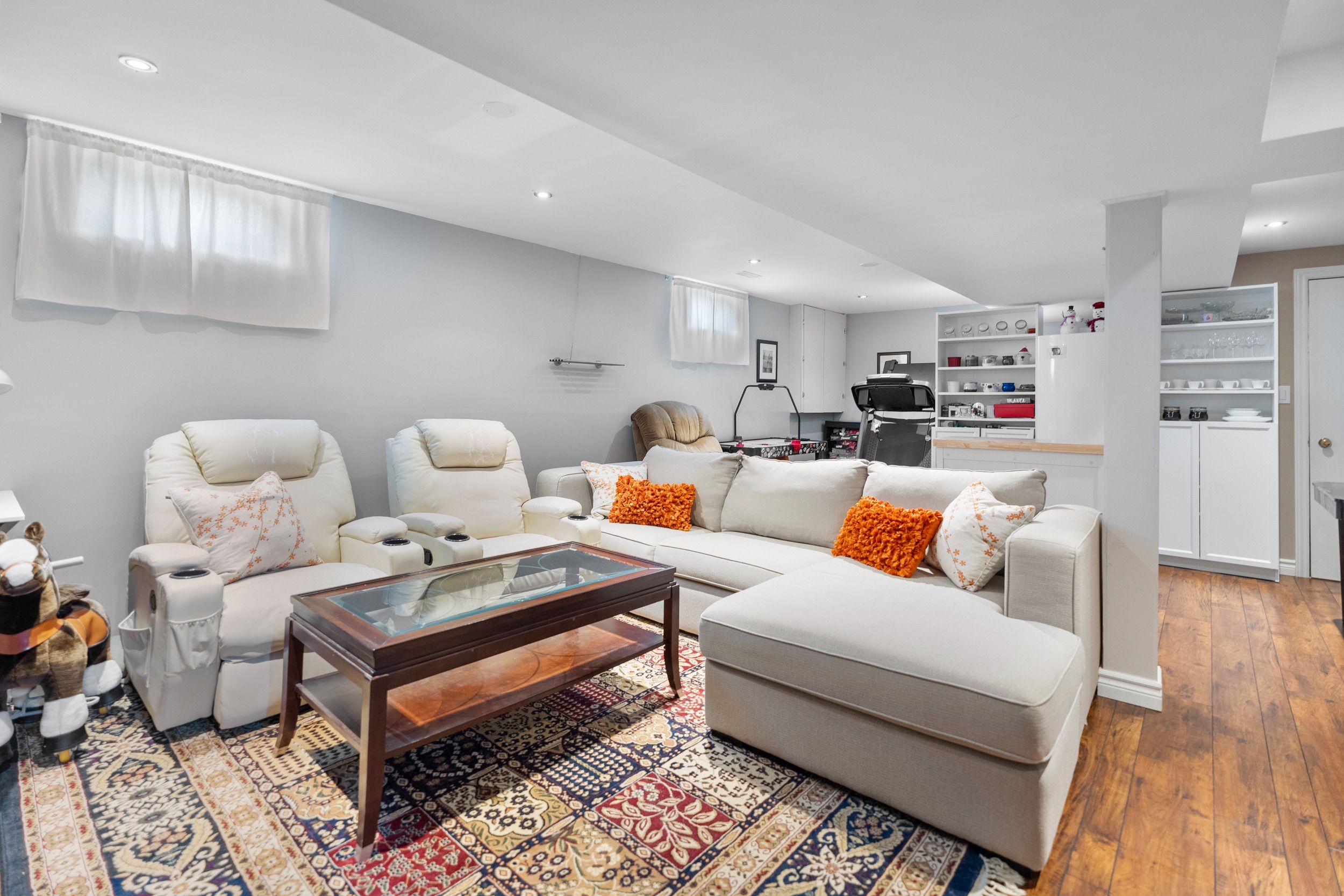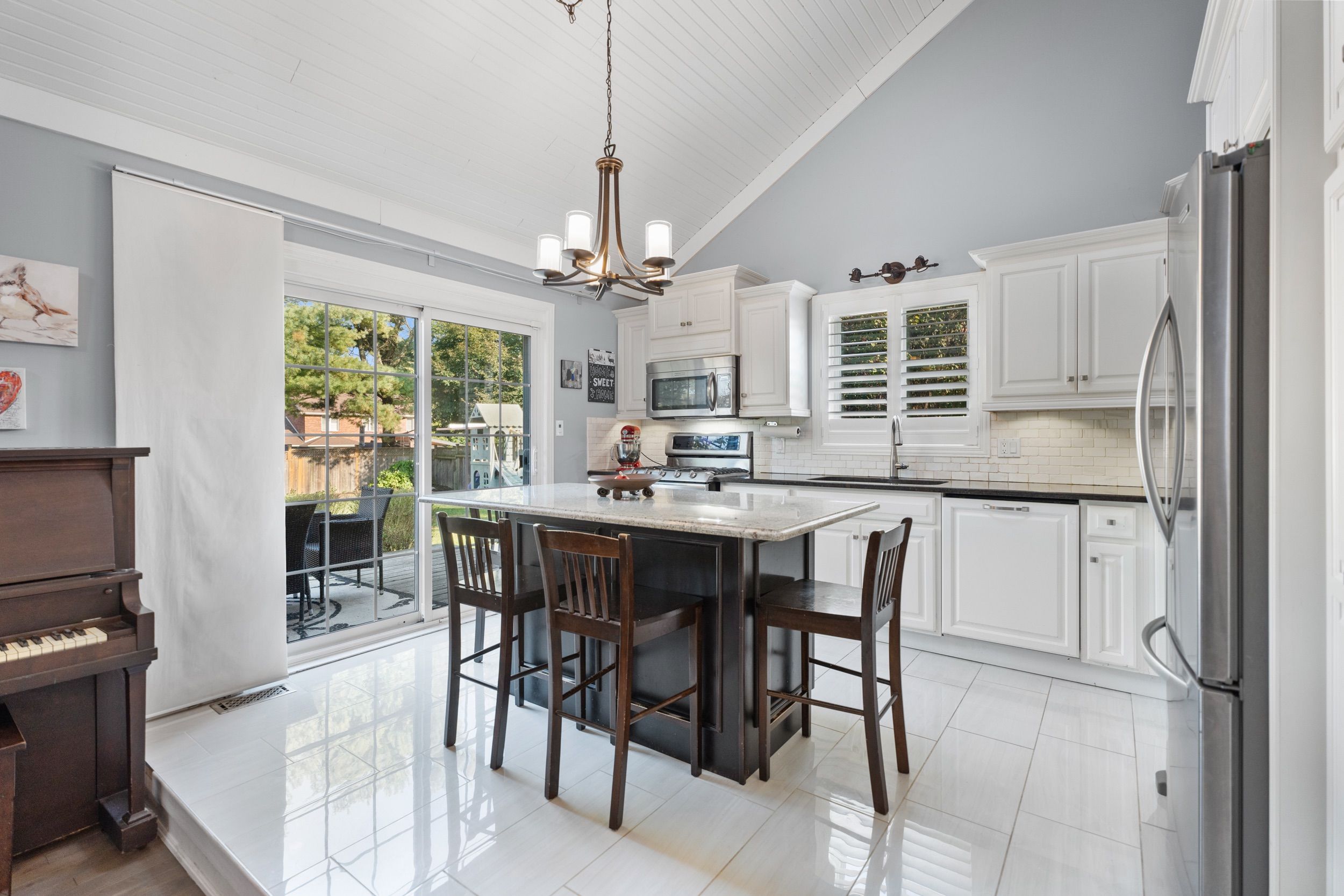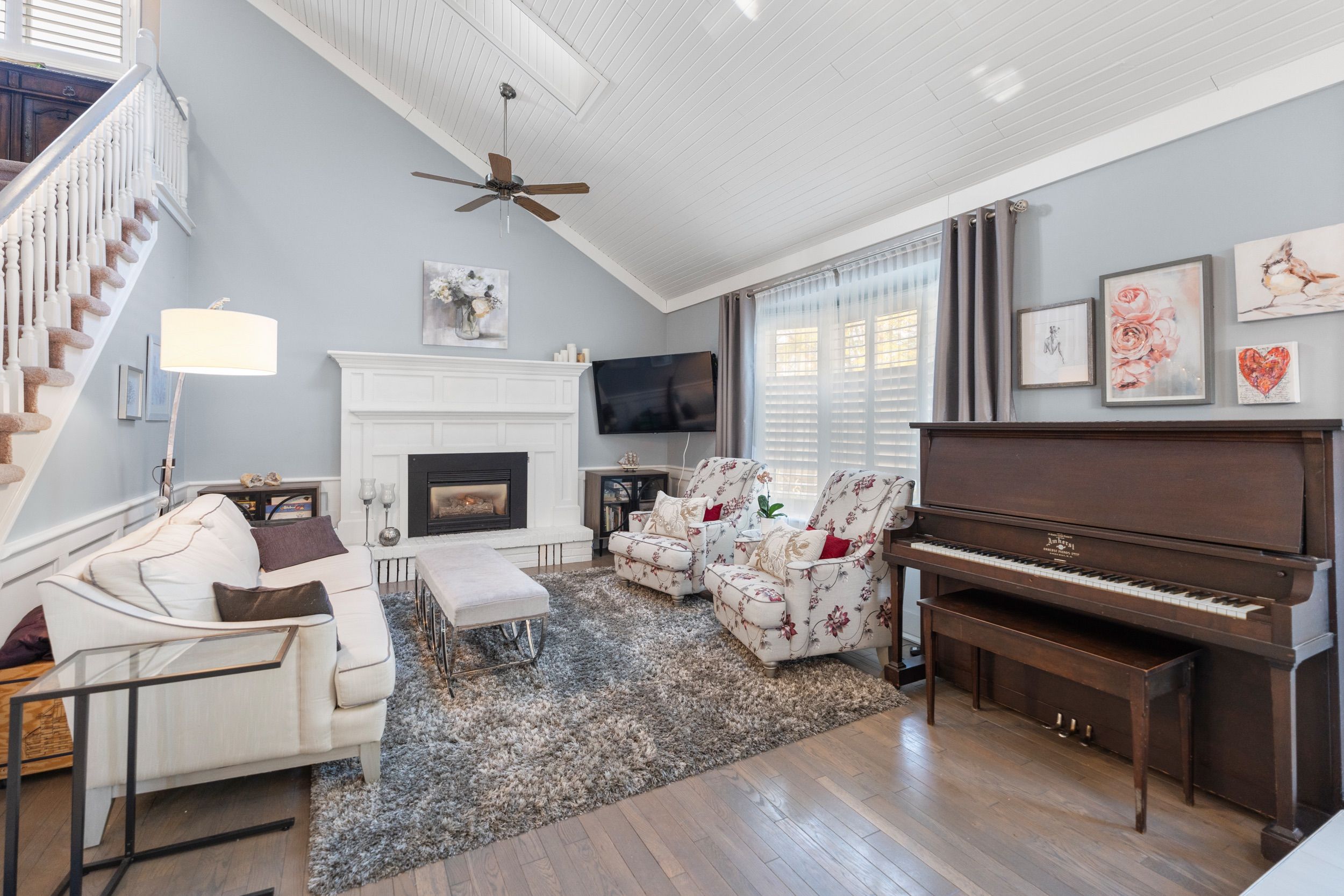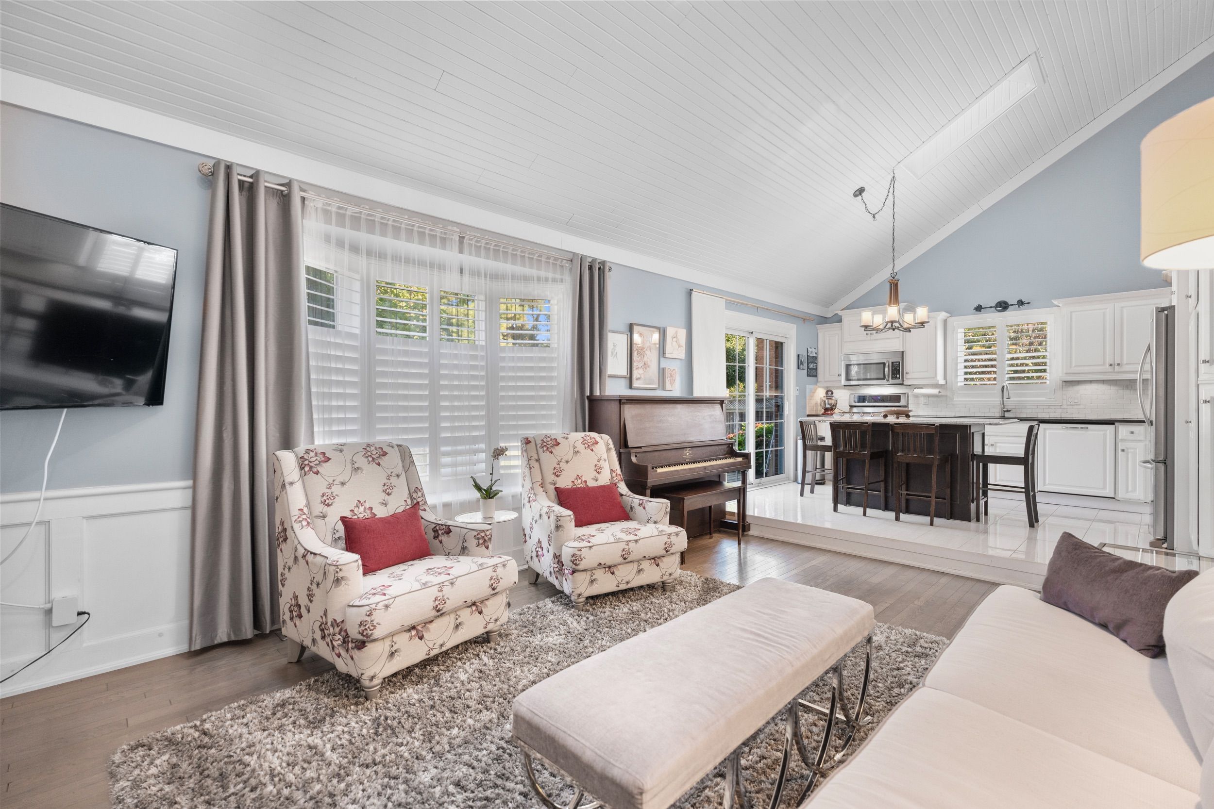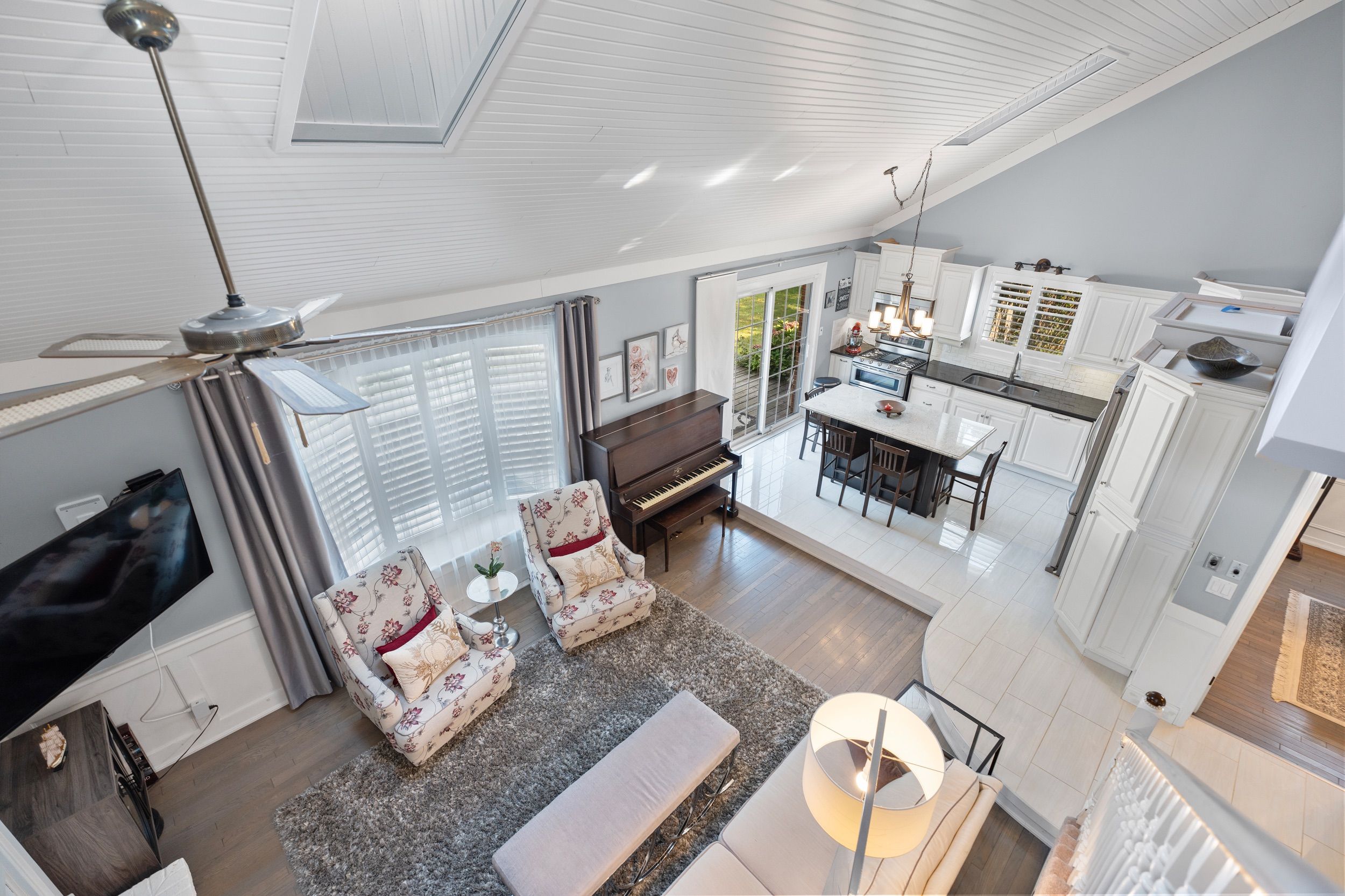 • Bright main floor with vaulted ceilings, skylights, and hardwood flooring.