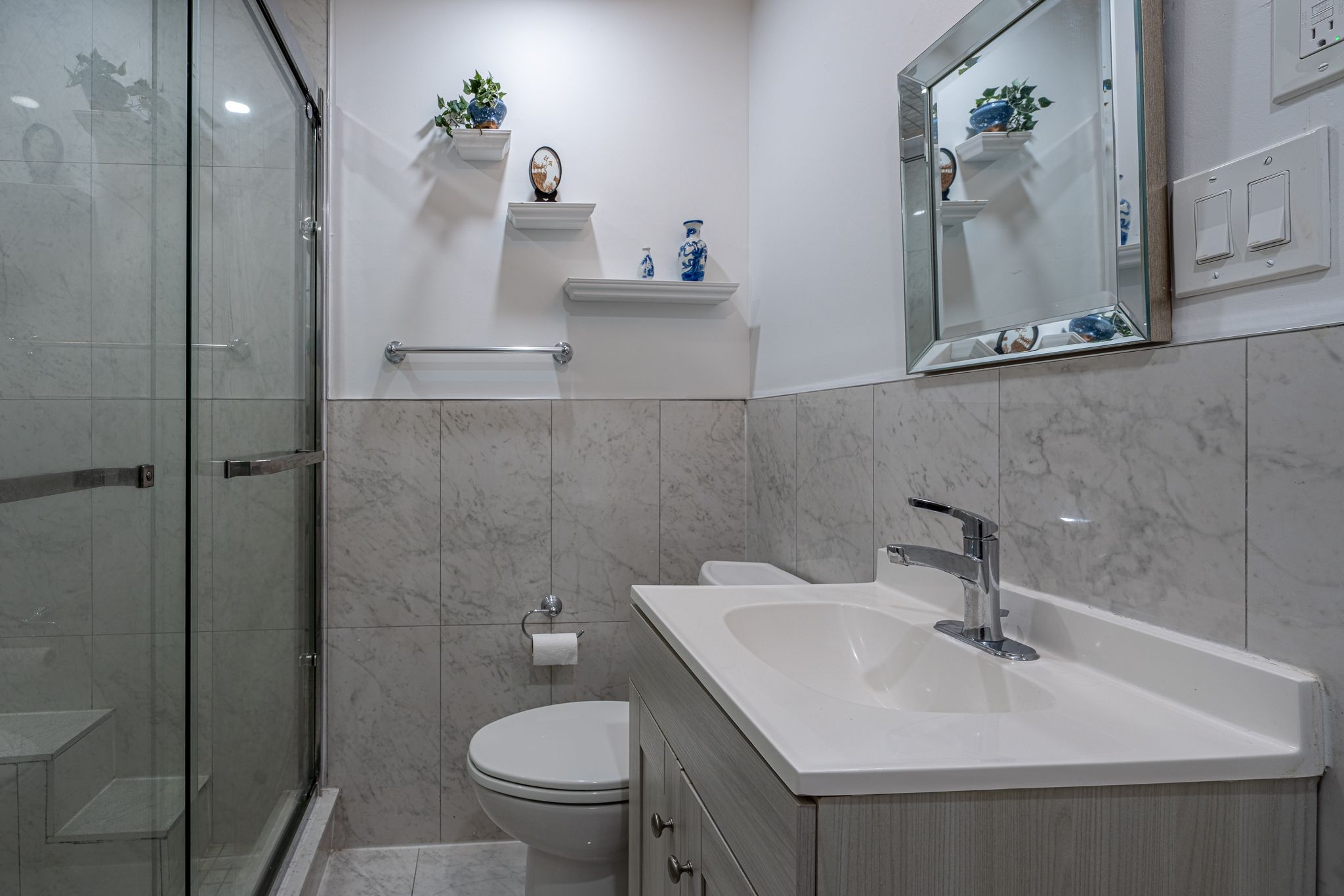 • Modern kitchen features quartz countertops and stainless steel appliances.