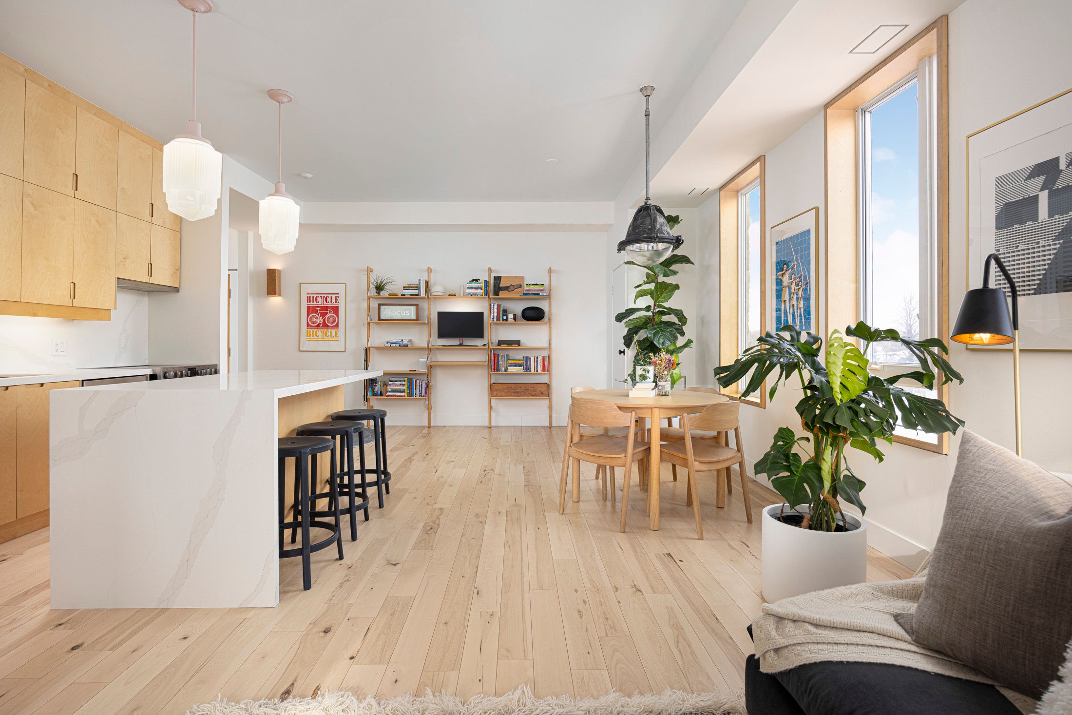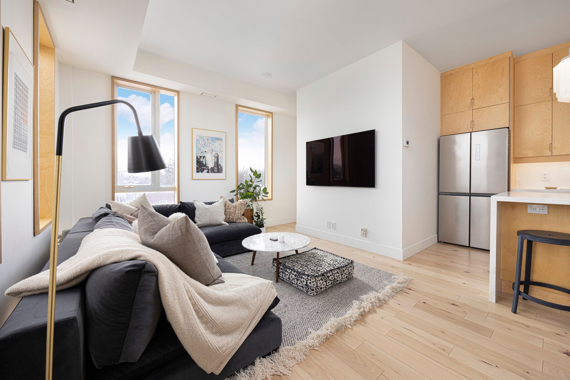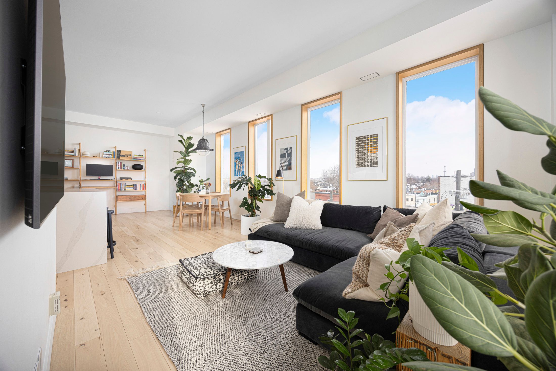 • Bright living space with corner windows and high ceilings for natural light.
