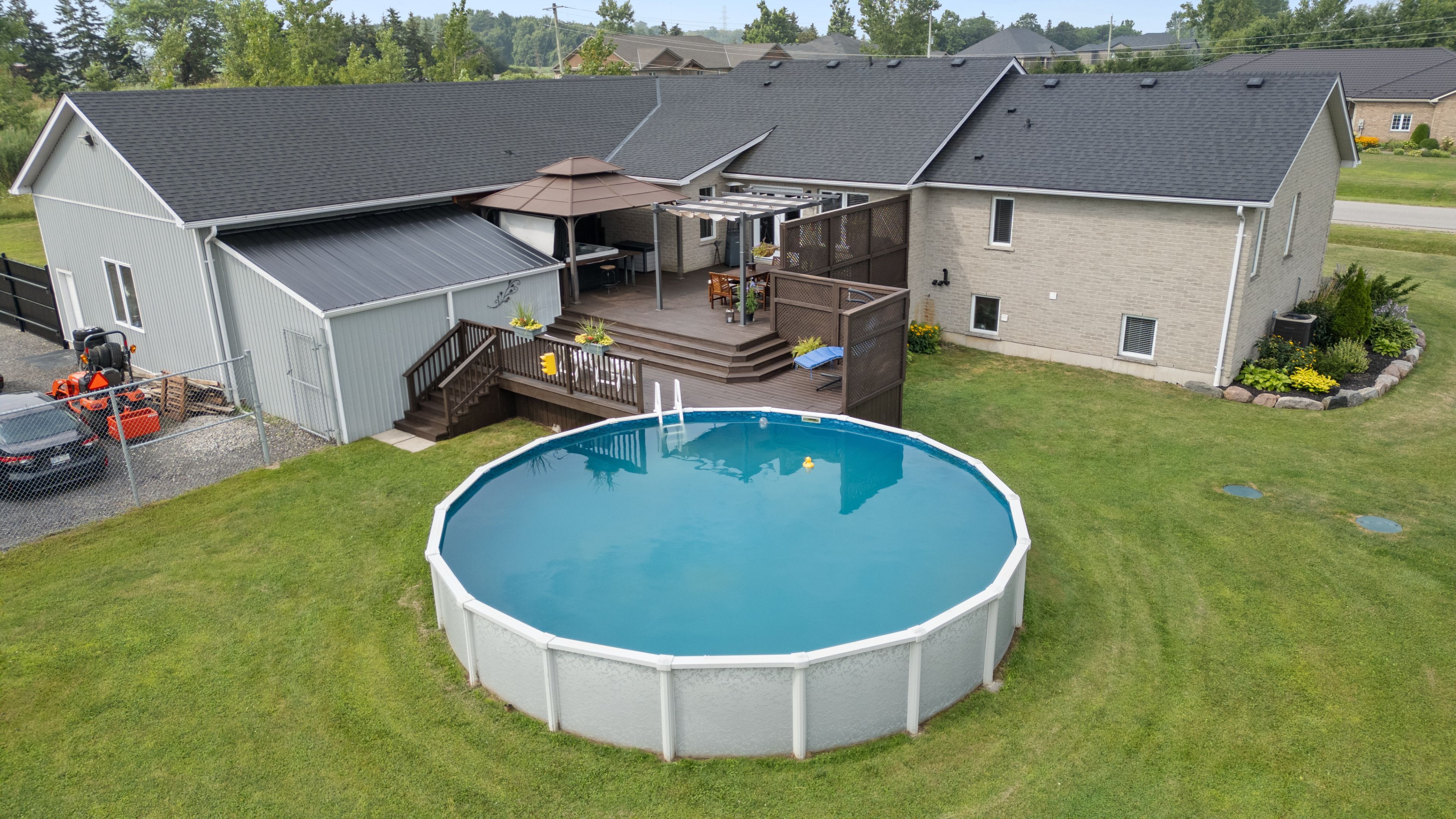 • Large outdoor patio with pool, hot tub, and gazebo for entertaining.
