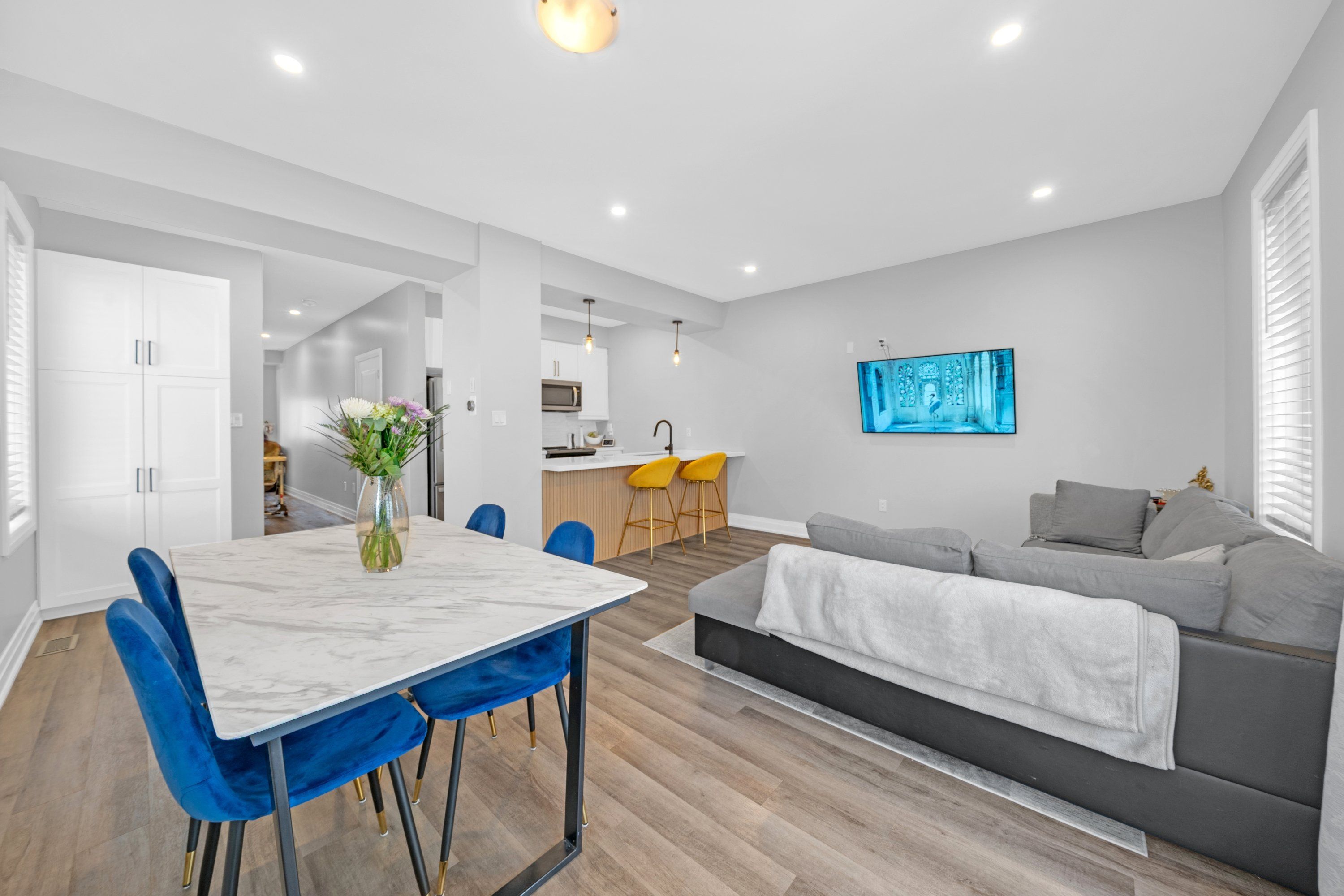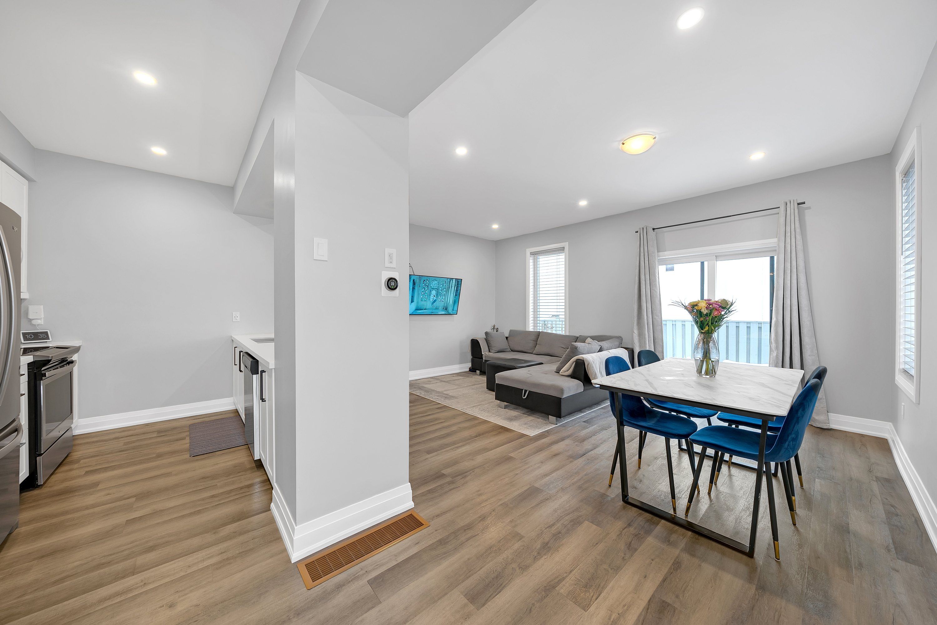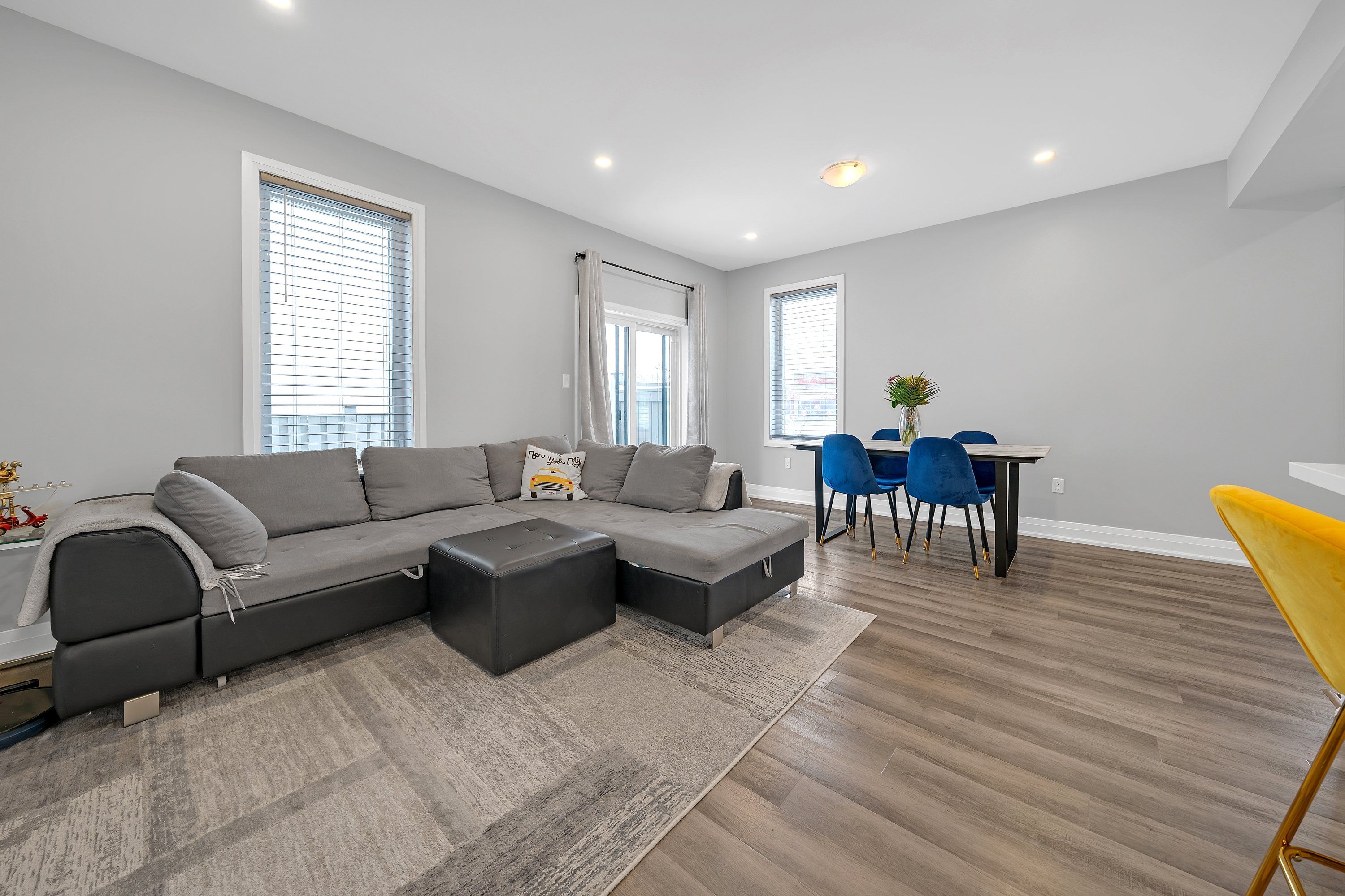 Stunning 5-year-old executive end-unit freehold townhome offering 2,317 sq ft of finished living space in a prime central barrie location. This 3-bedroom, 4-bath home showcases a modern open-concept layout with 9-ft ceilings on the main floor and quality finishes throughout. Upgraded kitchen features quartz countertops, custom cabinetry, backsplash, stainless steel appliances, and a large centre island, seamlessly connecting to the main living area with walkout to a private interlocked backyard. Triple-pane windows, hardwood staircase, and upgraded light fixtures add to the home's quality and comfort. Second floor offers three spacious bedrooms, two full bathrooms, and convenient upper-level laundry. Primary suite includes a walk-in closet, ensuite bath, and a custom built-in wall unit with desk and storage. Finished basement provides additional living space with a large recreation room and a 3-piece bathroom-ideal for extended family or entertaining. Located close to top-rated schools, georgian mall, recreation centre, parks, transit, shopping, and restaurants. Freehold with potl fee covering snow removal and common area maintenance. Well-maintained, move-in ready, and shows like new. Exceptional opportunity in a family-friendly neighbourhood.