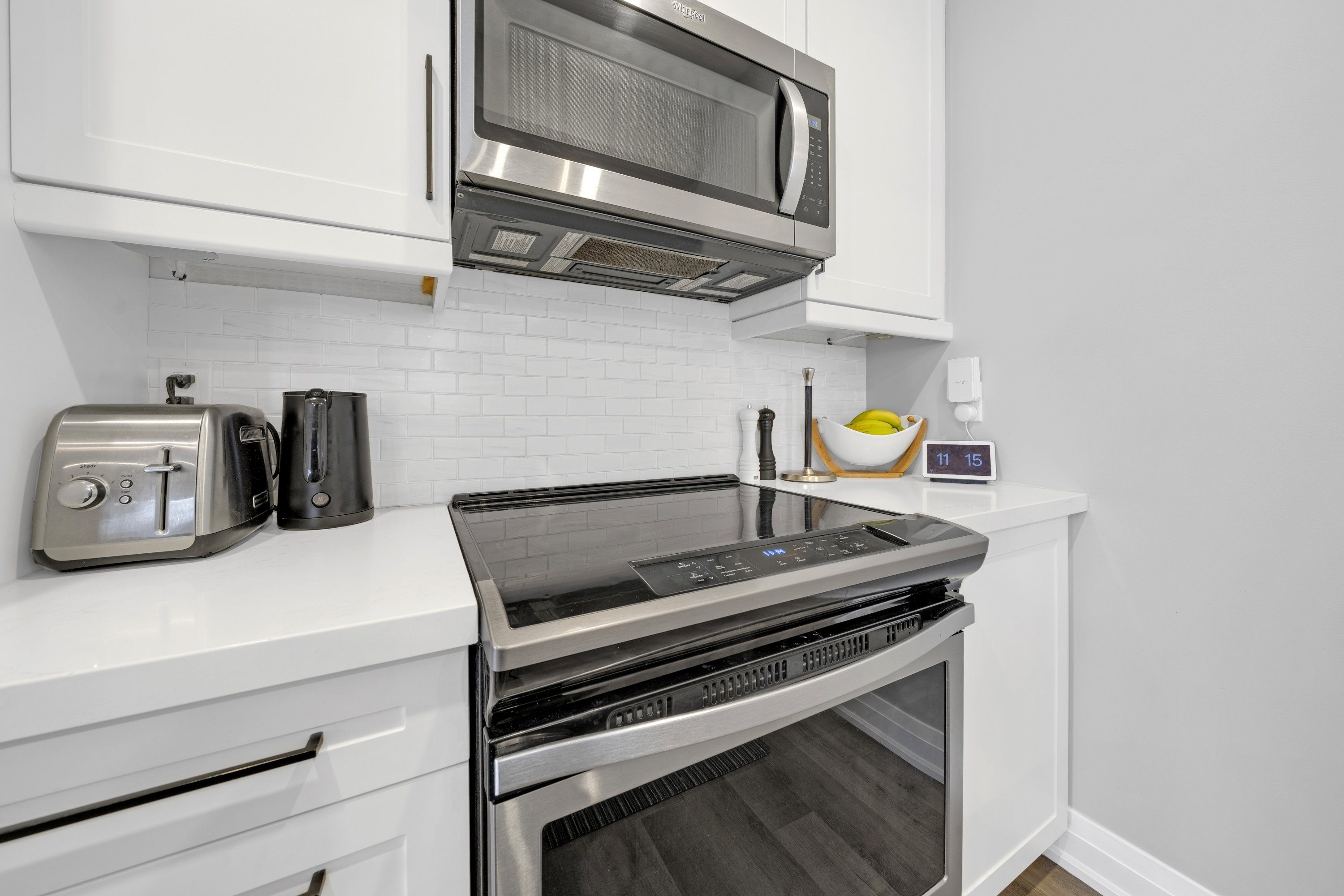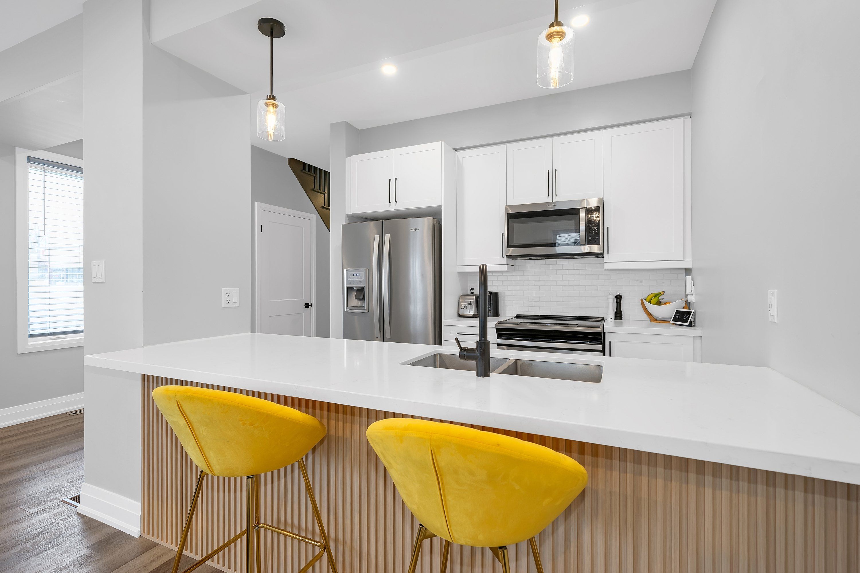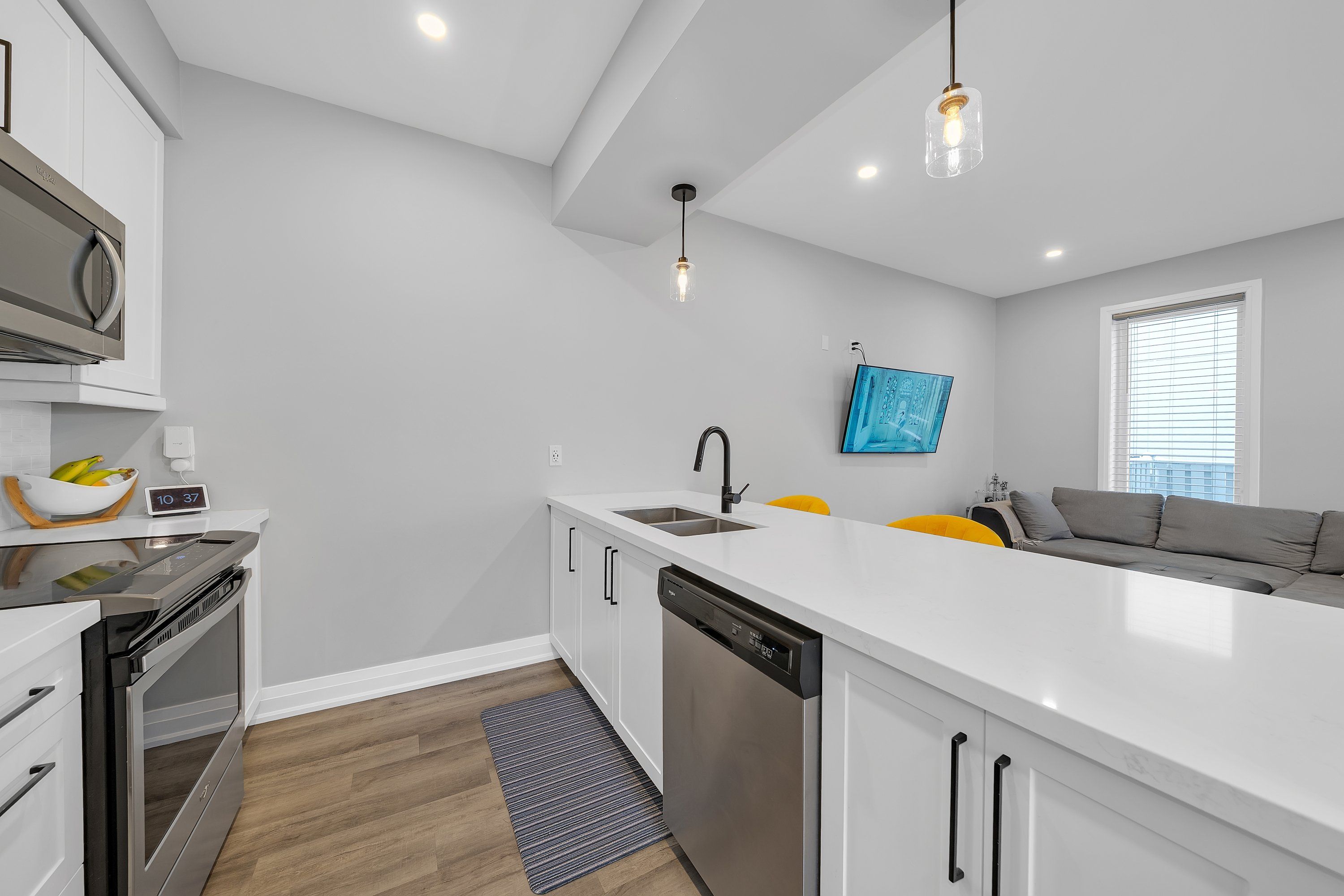 • Upgraded kitchen with quartz countertops, custom cabinetry, and stainless steel appliances.