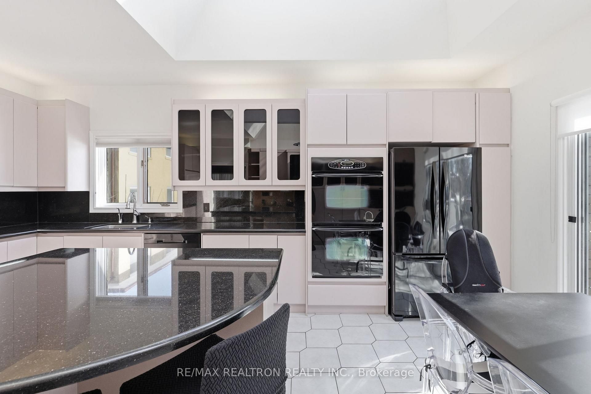 • Gourmet kitchen features vaulted ceilings and skylights.