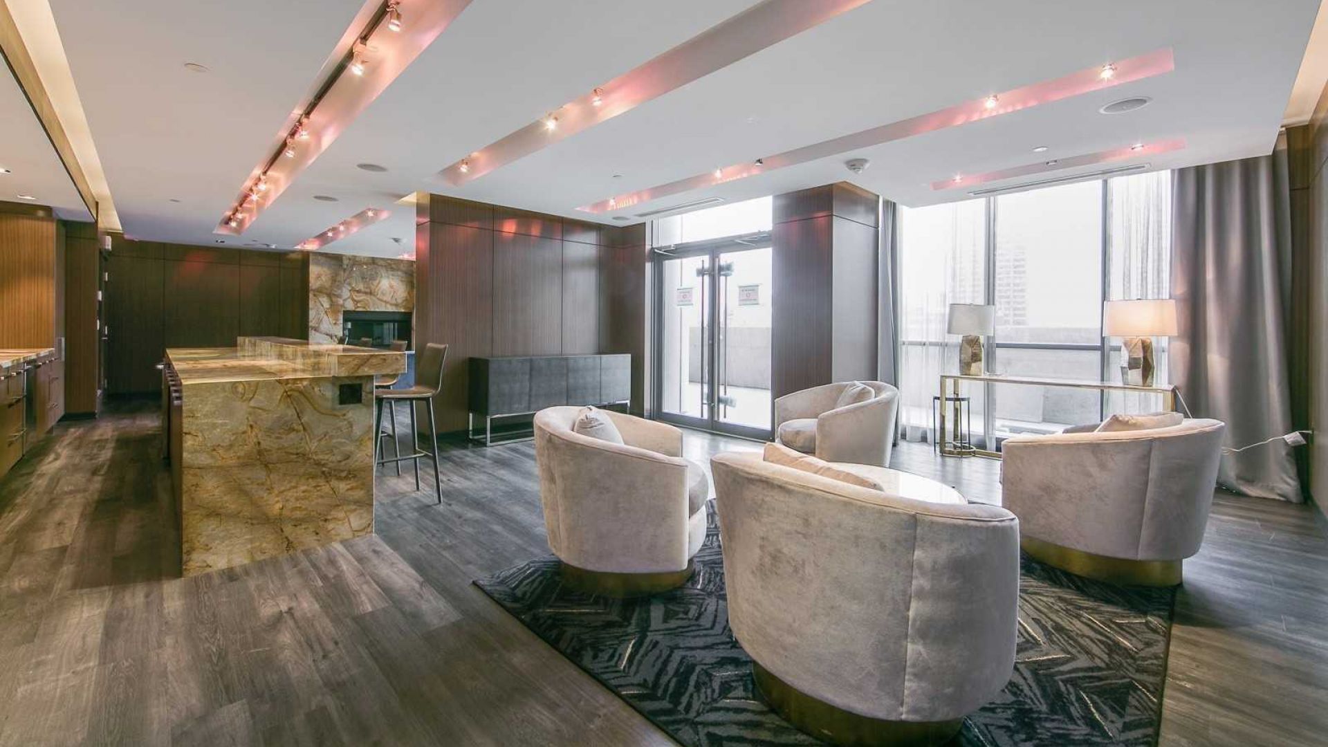 • Open-concept layout with 9-ft ceilings and floor-to-ceiling windows.