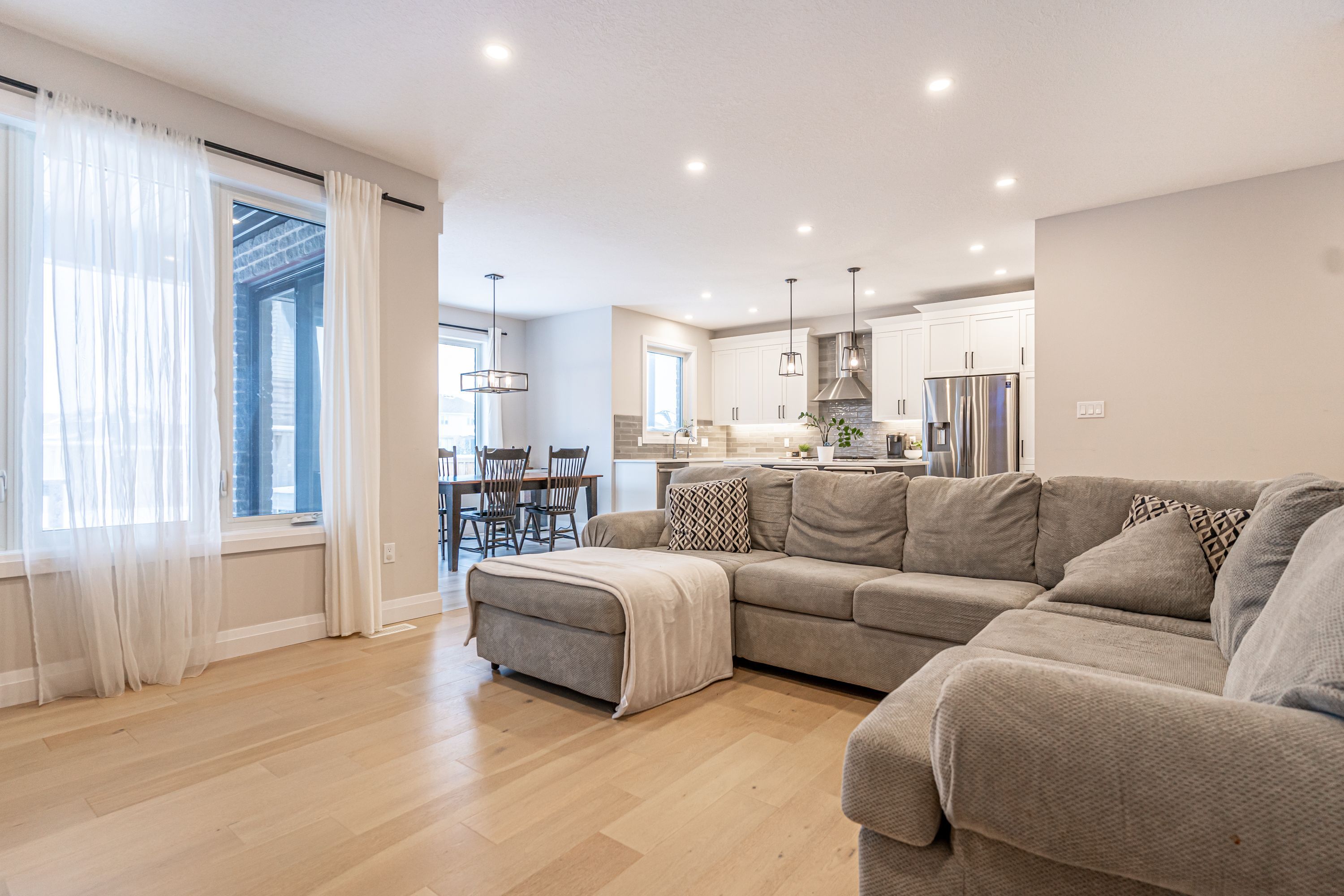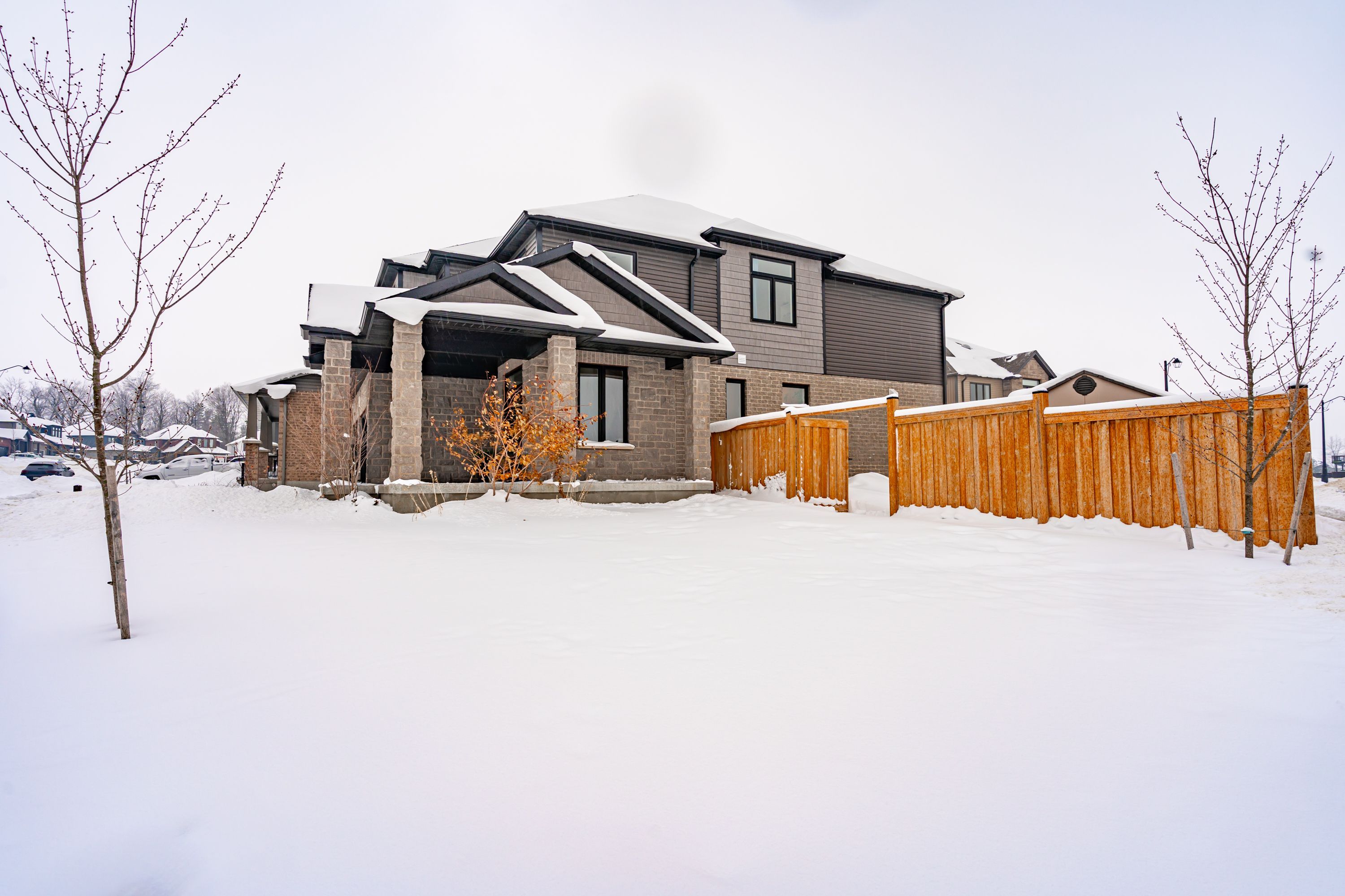 Step into a home that truly has it all. Perfectly positioned on a premium corner lot, this beautiful residence blends curb appeal with thoughtful design, high-end finishes, and exceptional functionality - it's a lifestyle upgrade. The upgraded stone exterior, double-door entry, and wraparound covered porch create a warm first impression, while parking is never an issue with room for up to six (6) vehicles, complemented by an extended garage designed to comfortably accommodate a pickup truck and equipped with an ev charger. Inside, enjoy 9' ceilings, 7" engineered hardwood floors, 5" baseboards, pot lights, and upgraded fixtures. The bright living room features a gas fireplace with floating mantle, perfect for relaxing or entertaining. The chef-inspired kitchen boasts extended cabinetry with crown molding, pot drawers, under-cabinet lighting, backsplash, stainless steel appliances, upgraded hood range, gas stove, and a large walk-in pantry (approx. 8' x 4'). The sun-filled dinette offers large windows and a walkout to a covered deck, leading to a concrete patio with hot tub, additional concrete pad with storage shed, privacy fencing, and gate access on both sides with double gate entry-ideal for outdoor living and entertainment. A convenient garage entry to mudroom with laundry adds functionality. Upstairs, engineered wood stairs with metal pickets lead to a spacious master suite featuring a 4-piece ensuite with skylight and a large walk-in closet (approx. 13' x 5'). Additional highlights include central a/c, central vac, water softener, cable/ethernet conduits throughout, oversized basement windows, a large cold room (approx. 16' x 12'), wired exterior camera system, and gas lines for stove, bbq, dryer, and fireplace. With walking distance to parks, trails, schools, retail shops, and a community centre, this home perfectly blends style, space, and location. A rare opportunity to make this extraordinary residence your home.
