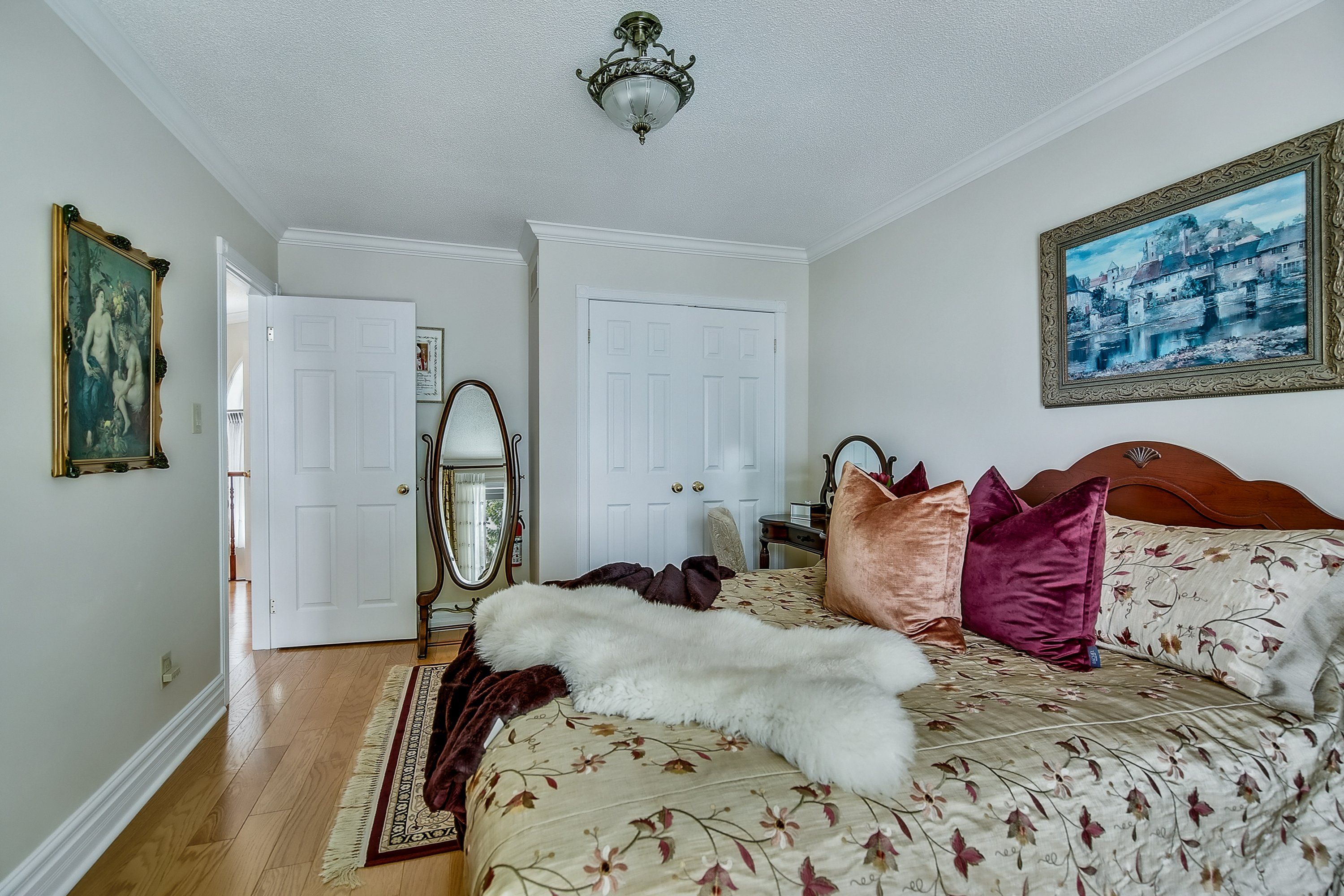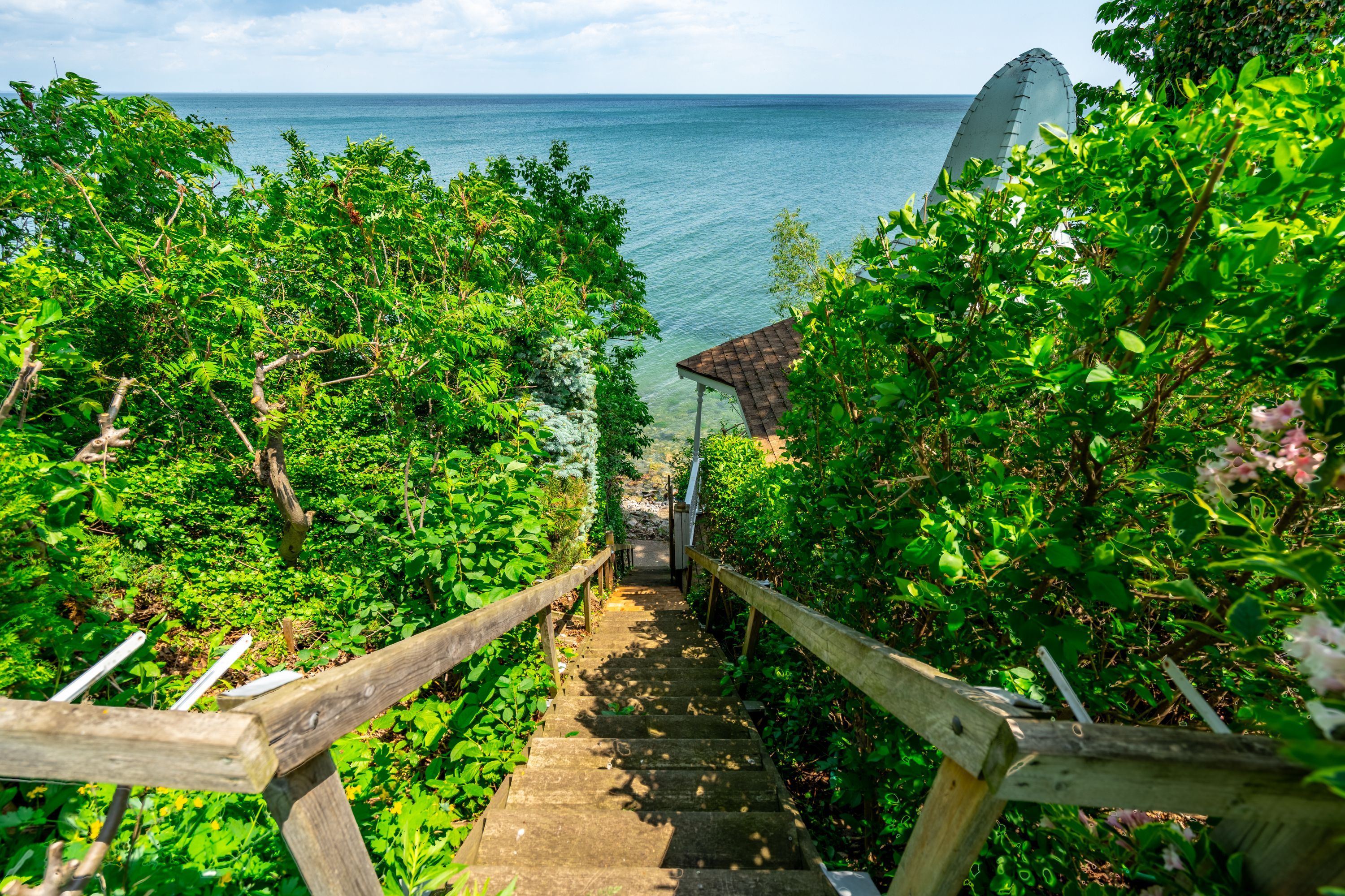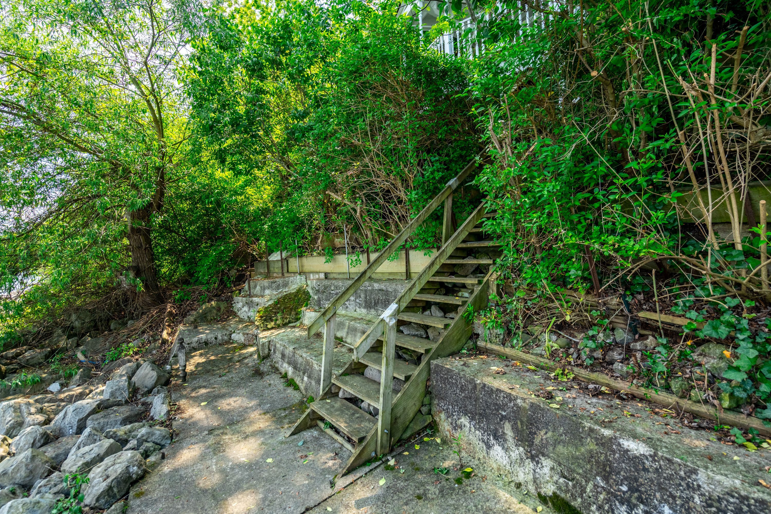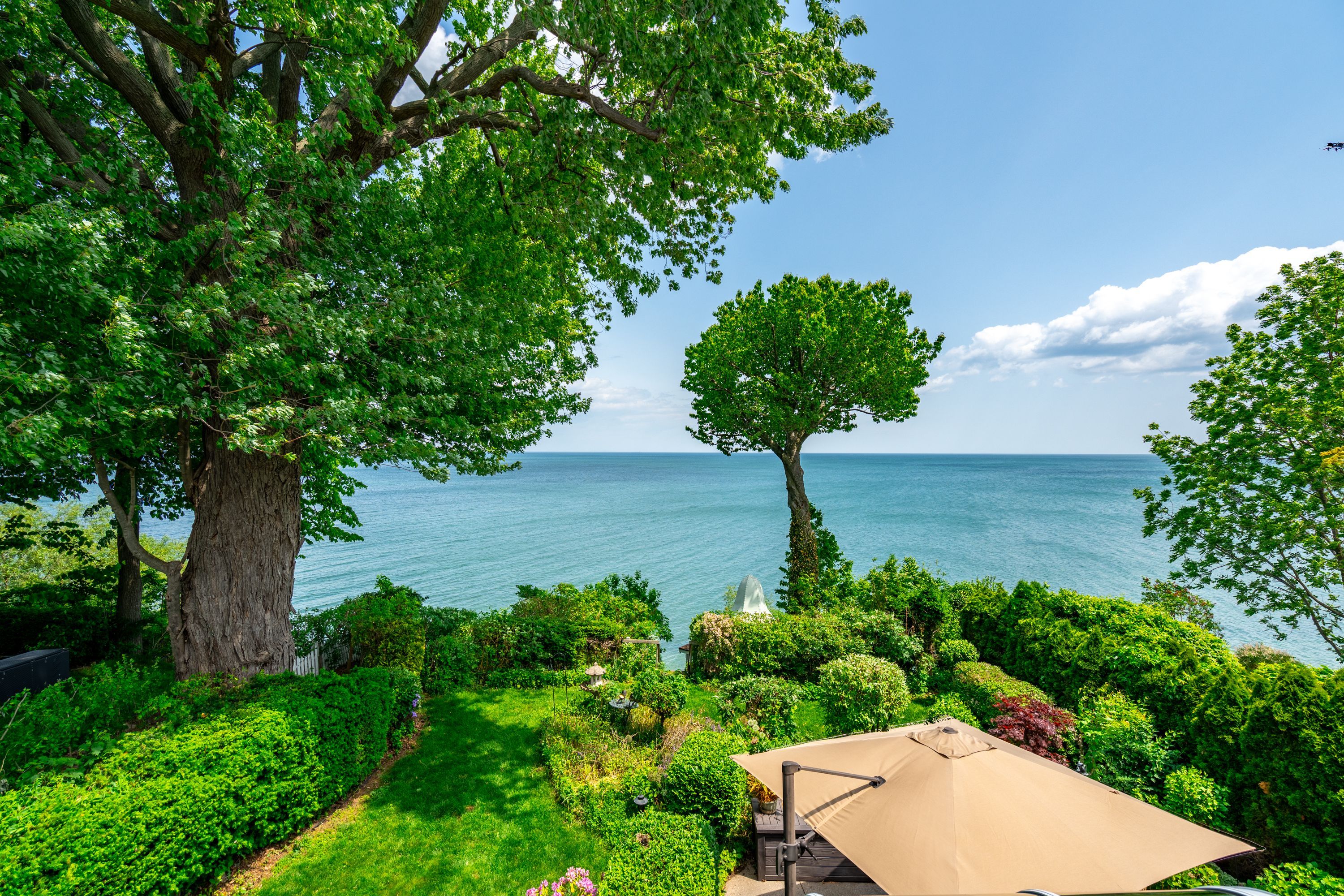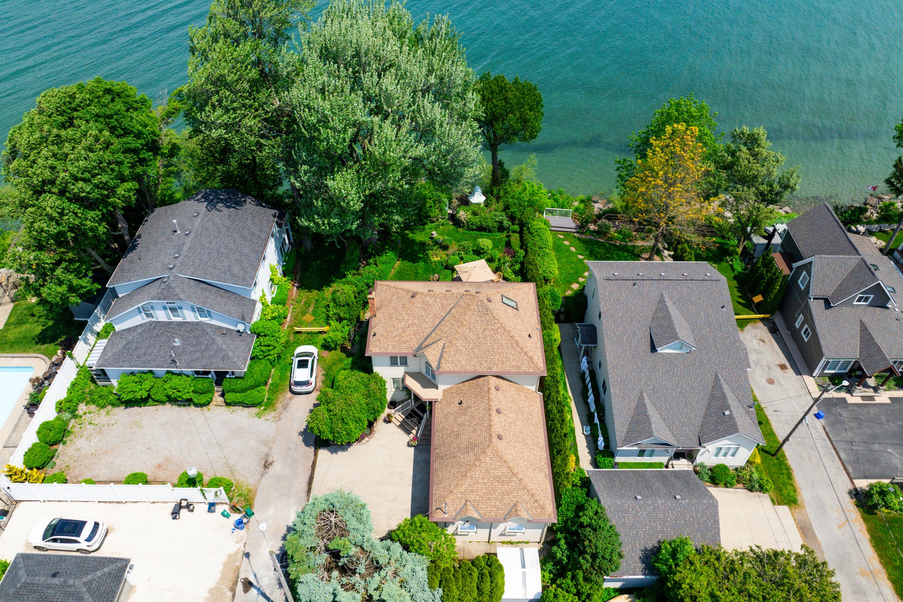• Peaceful street surrounded by mature trees and scenic water views.