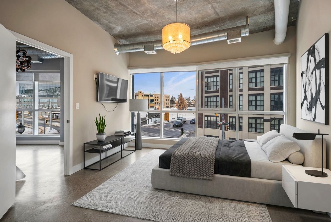 • Large windows provide natural light and urban views.