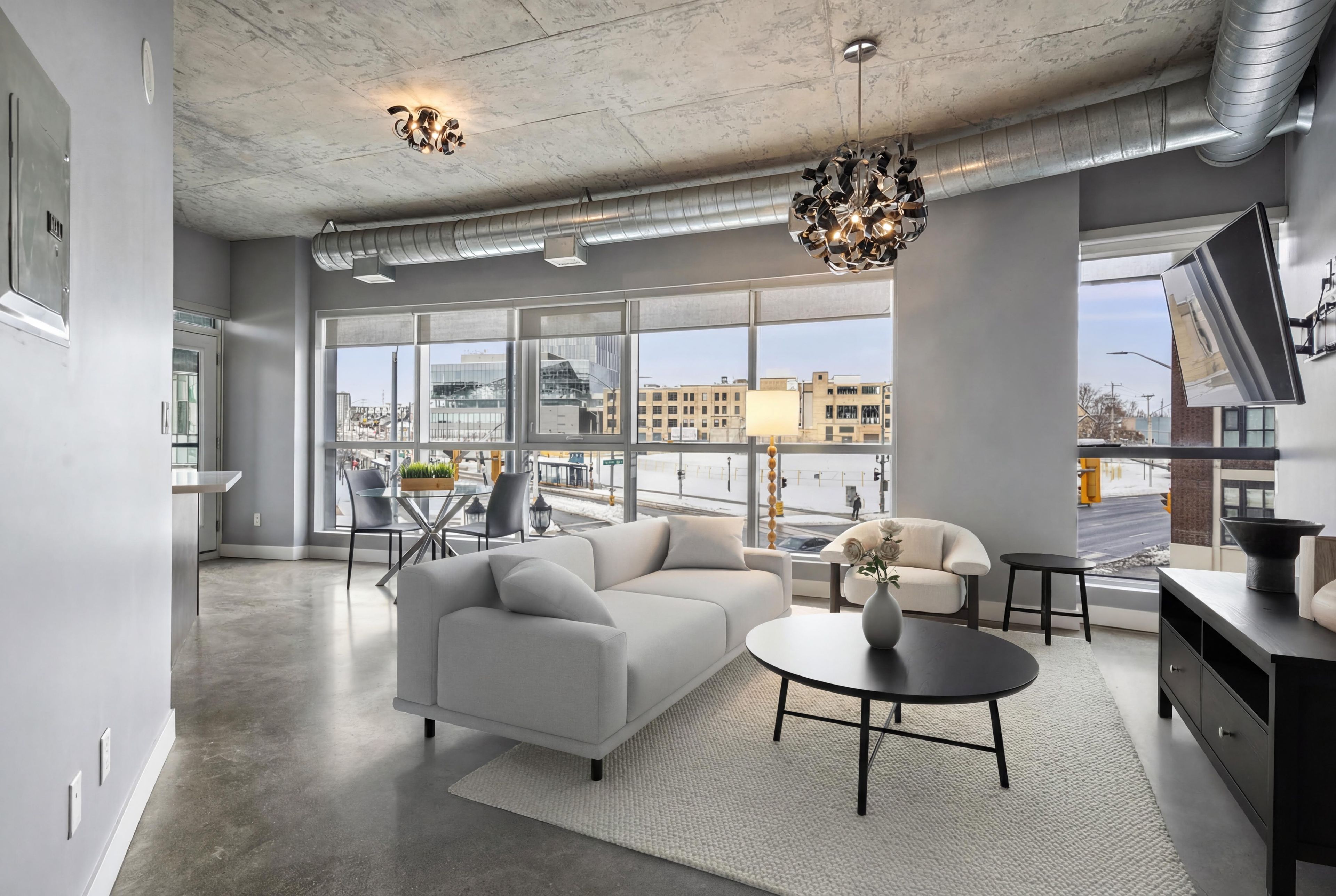 • High ceilings and polished concrete floors create an open and modern feel.