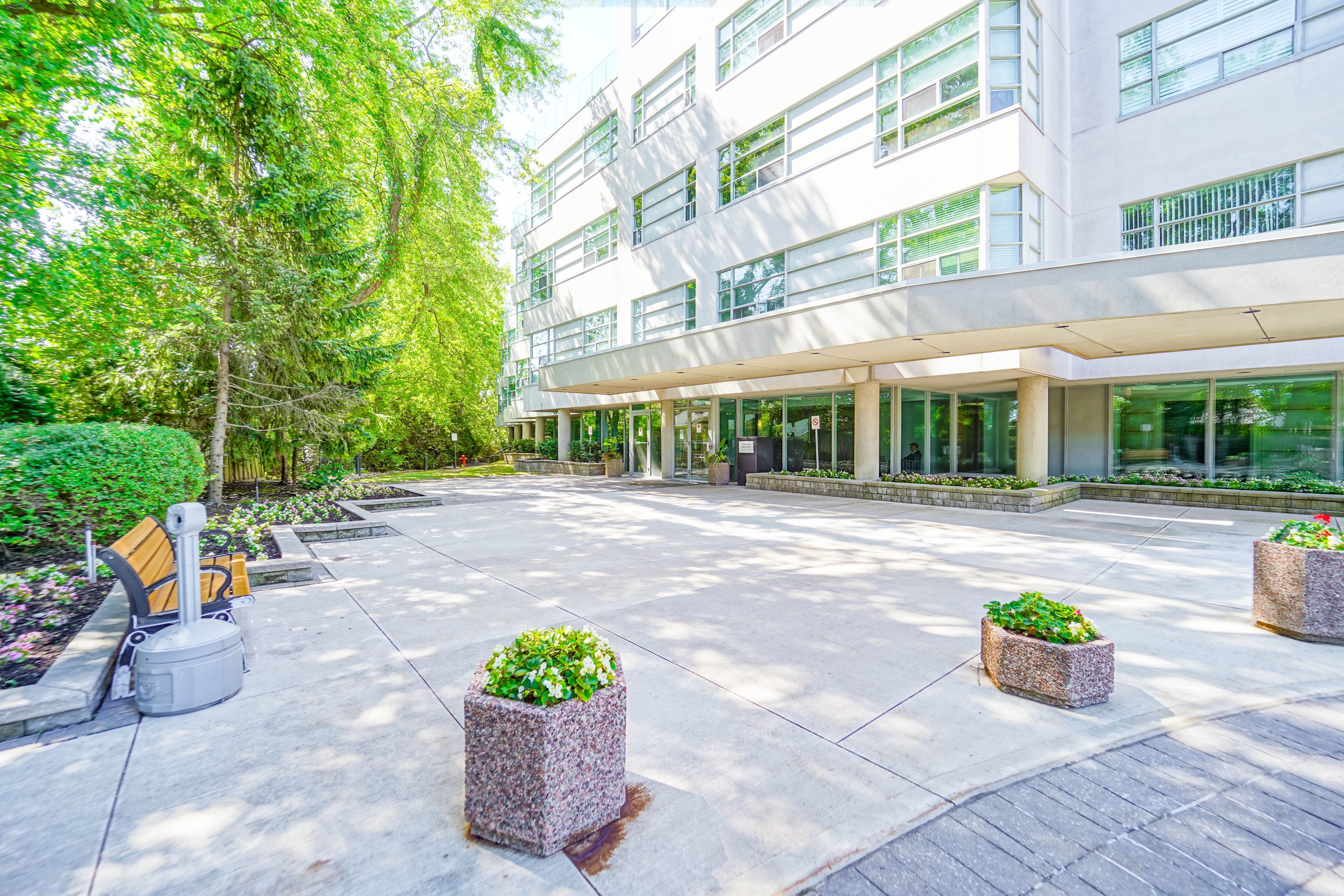 Experience luxury living in this rarely offered 2-bedroom, 2-bathroom residence in a boutique building designed by renowned architect arthur erickson. Step directly from the elevator into a marble-tiled foyer, where thoughtful design and refined finishes unfold. The expansive open-concept layout features hardwood floors, 9-ft smooth ceilings, pot lights, and crown moulding throughout. A renovated kitchen impresses with granite countertops, a mosaic tile backsplash, built-in stainless steel appliances, and a large center island with breakfast seatingideal for both everyday living and entertaining. Floor-to-ceiling windows are fitted with custom automated blinds and offer tranquil views of lush greenery next to the ravine trail. A juliette balcony and a rare private terrace extend the living space outdoors, creating a seamless connection to nature. Bedrooms are thoughtfully separated for privacy, including a generous primary suite with his-and-hers closets featuring built-in organizers, and a stylish 3-piece ensuite. The second bedroom includes a double closet and easy access to the renovated 4-piece main bath. Enjoy the convenience of ensuite laundry and the comfort of central air. Building amenities include a concierge, indoor pool, sauna, fitness centre, car wash, and visitor parking. This suite also includes two owned underground parking spaces and a large locker. A truly rare opportunity in a highly desirable, tranquil setting.