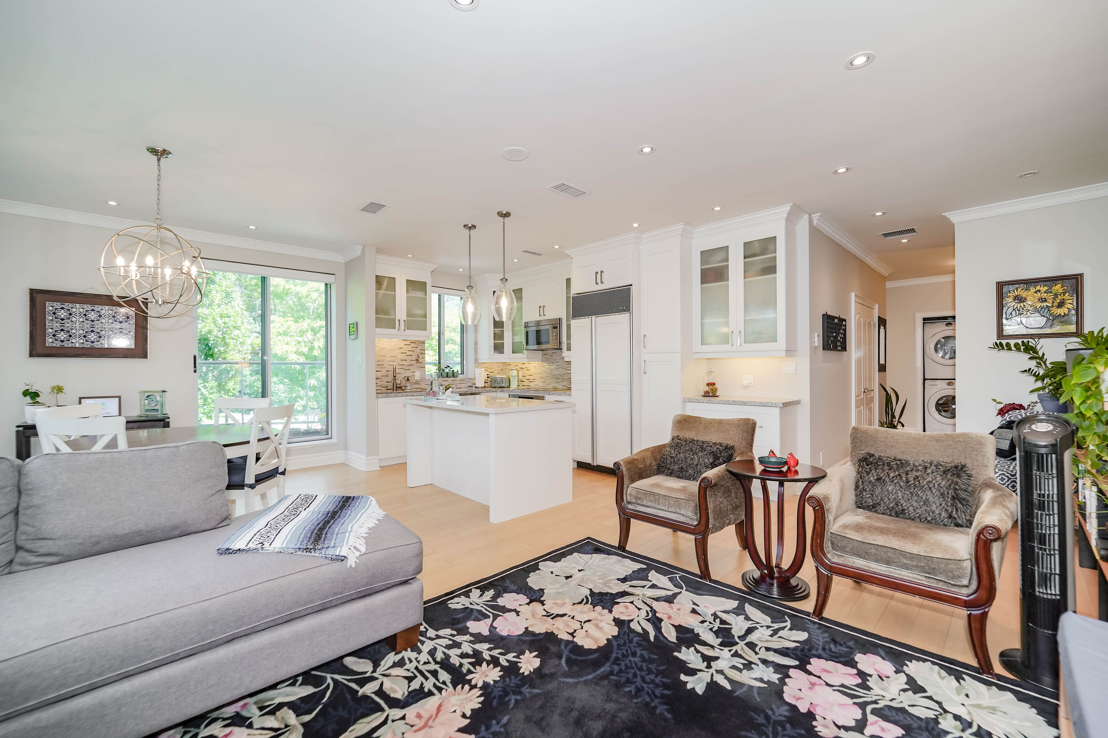 Experience luxury living in this rarely offered 2-bedroom, 2-bathroom residence in a boutique building designed by renowned architect arthur erickson. Step directly from the elevator into a marble-tiled foyer, where thoughtful design and refined finishes unfold. The expansive open-concept layout features hardwood floors, 9-ft smooth ceilings, pot lights, and crown moulding throughout. A renovated kitchen impresses with granite countertops, a mosaic tile backsplash, built-in stainless steel appliances, and a large center island with breakfast seating ideal for both everyday living and entertaining. Floor-to-ceiling windows are fitted with custom automated blinds and offer tranquil views of lush greenery next to the ravine trail. A juliette balcony and a rare private terrace extend the living space outdoors, creating a seamless connection to nature. Bedrooms are thoughtfully separated for privacy, including a generous primary suite with his-and-hers closets featuring built-in organizers, and a stylish 3-piece ensuite. The second bedroom includes a double closet and easy access to the renovated 4-piece main bath. Enjoy the convenience of ensuite laundry and the comfort of central air. Building amenities include a concierge, indoor pool, sauna, fitness centre, car wash, and visitor parking. This suite also includes two owned underground parking spaces and a large locker. A truly rare opportunity in a highly desirable, tranquil setting.