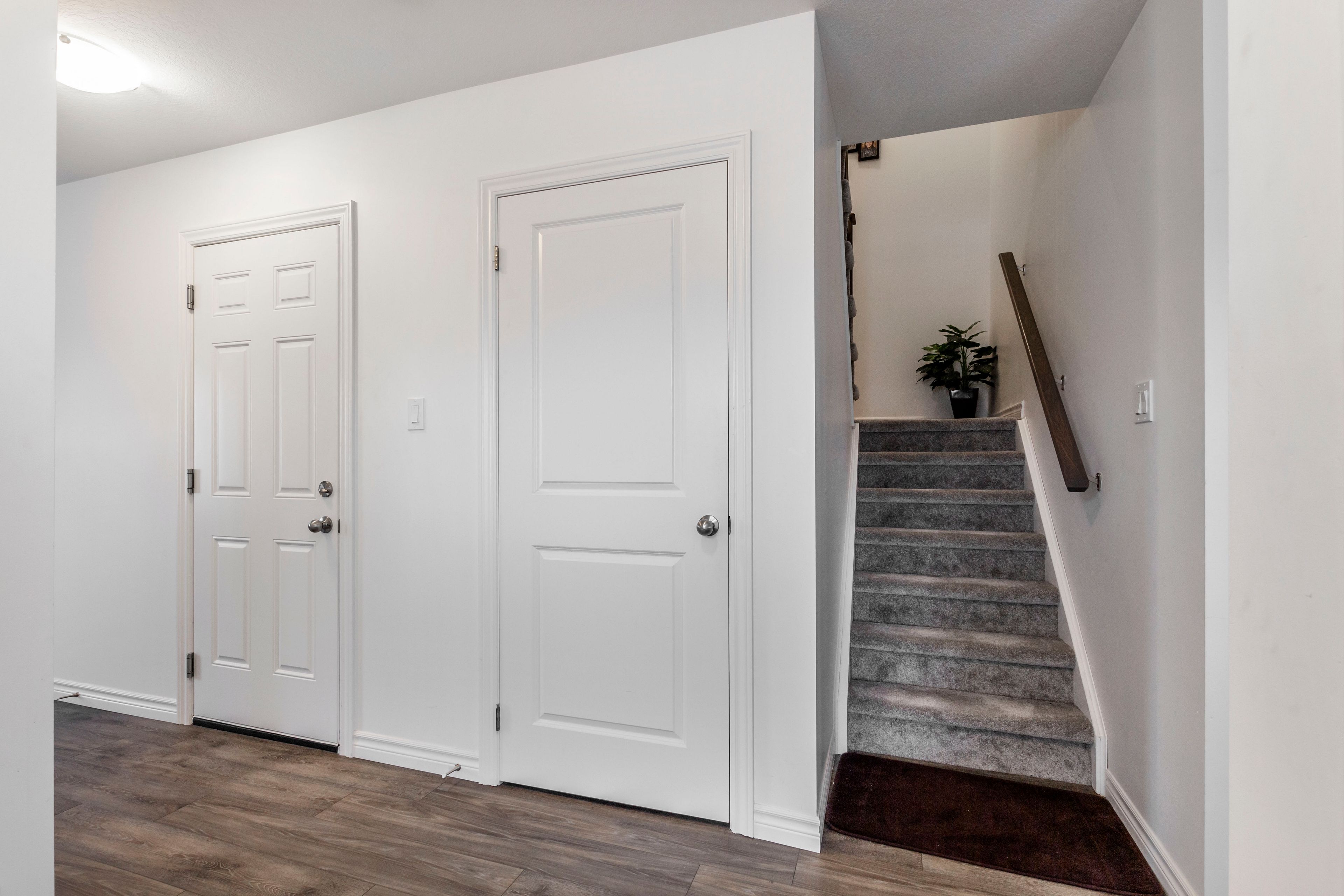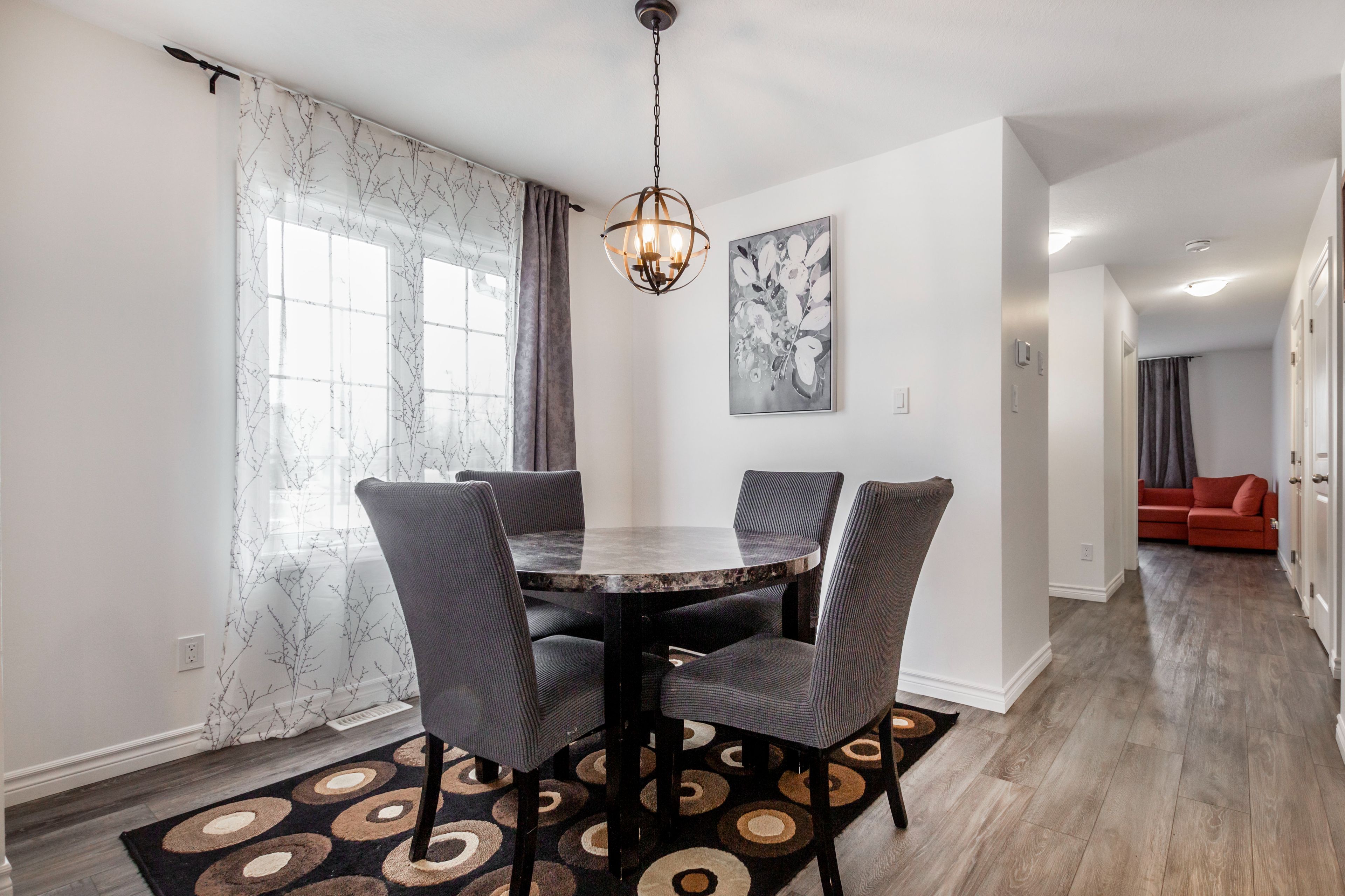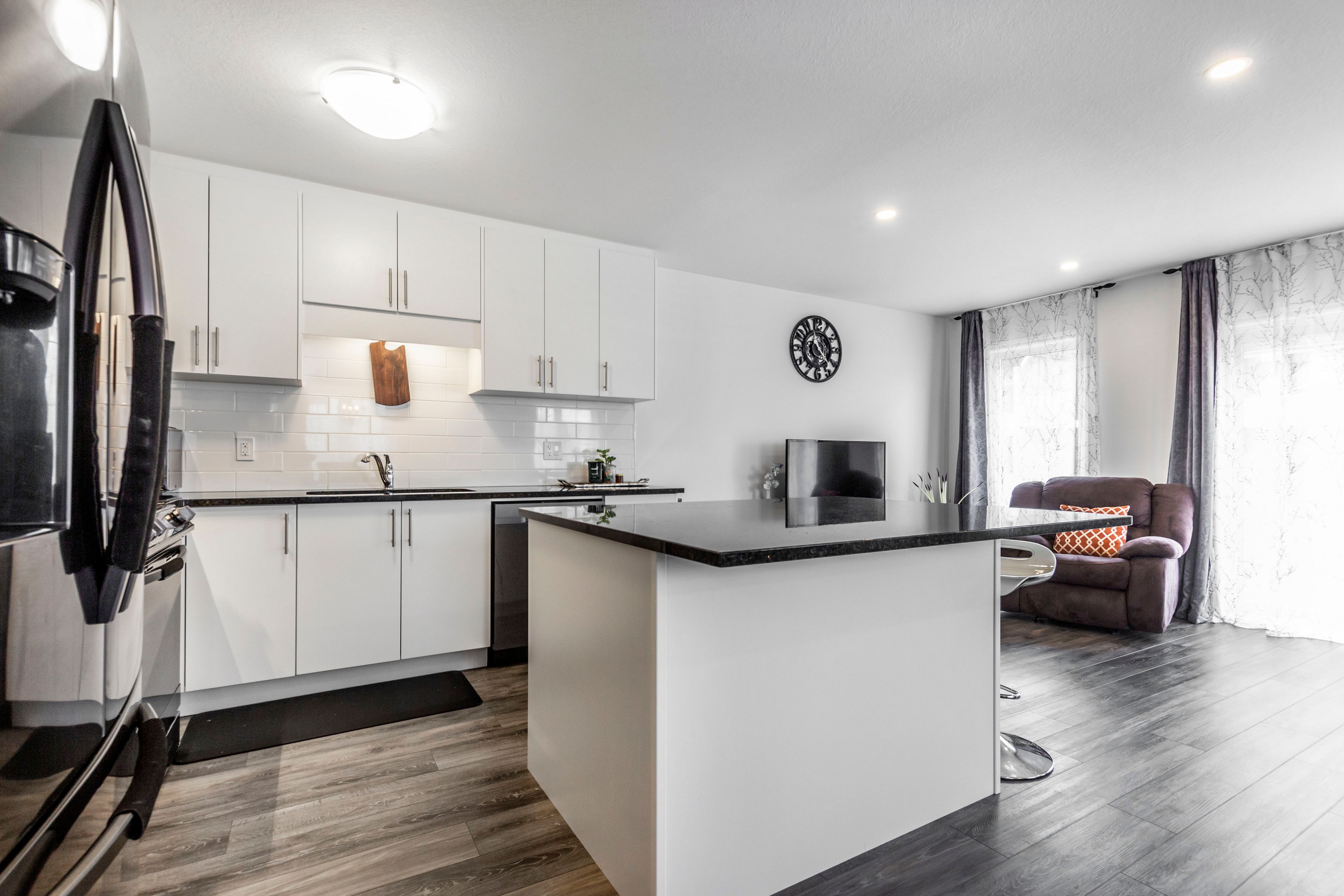 When you're looking for the quiet of country but the closeness of the city, this is the place for you. This townhouse condos end unit is waiting for you to call home! Just off the main entrance we have the office/ den. It's going to be easy to start the work day with this room flooded in morning sunlight. The open concept main living area is carpet free and ready for entertaining family and friends. The black stainless steel, finger print resistant finish appliances are gorgeous! A large quartz countertop island easily fits 4 barstools. But there's also room for a dining room table if you need additional seating. The great room has slider doors that open to a deck. Bbq's are permitted (but sorry smoking is not) landscaping has been promised for this year installation. Upstairs the 3 generous sized bedrooms are all near the laundry room. How incredibly handy is that? The primary bedroom, that easily fits a king size bed, features a large walk in closet. The ensuite has a tiled walk-in shower, double sink vanity plus a soaker tub! A large unfinished basement leaves you lots of room for storage or the home gym. A final "plus" is parking for 2 cars. The garage has room for storage plus inside entry. Let's book your tour today!