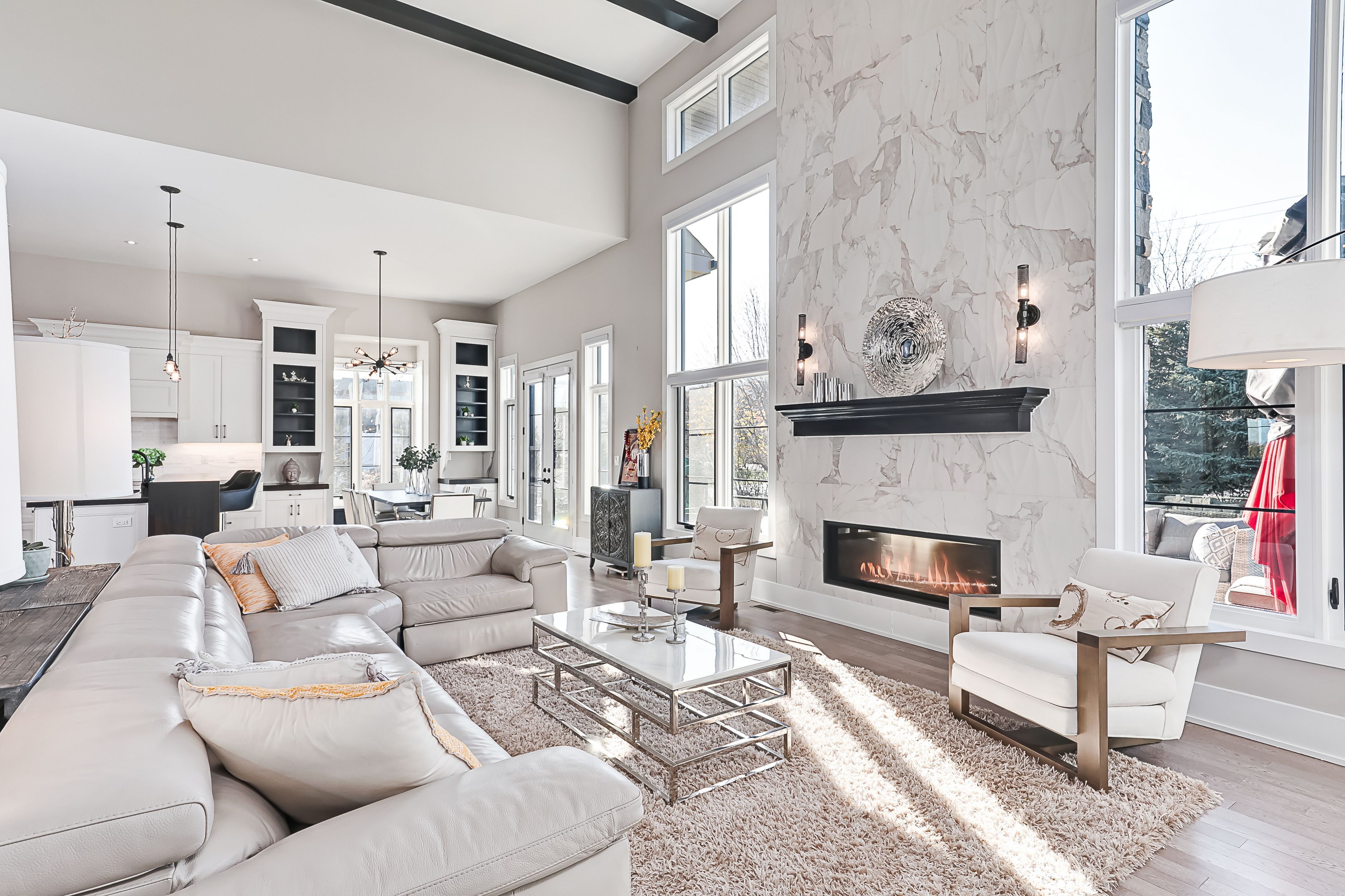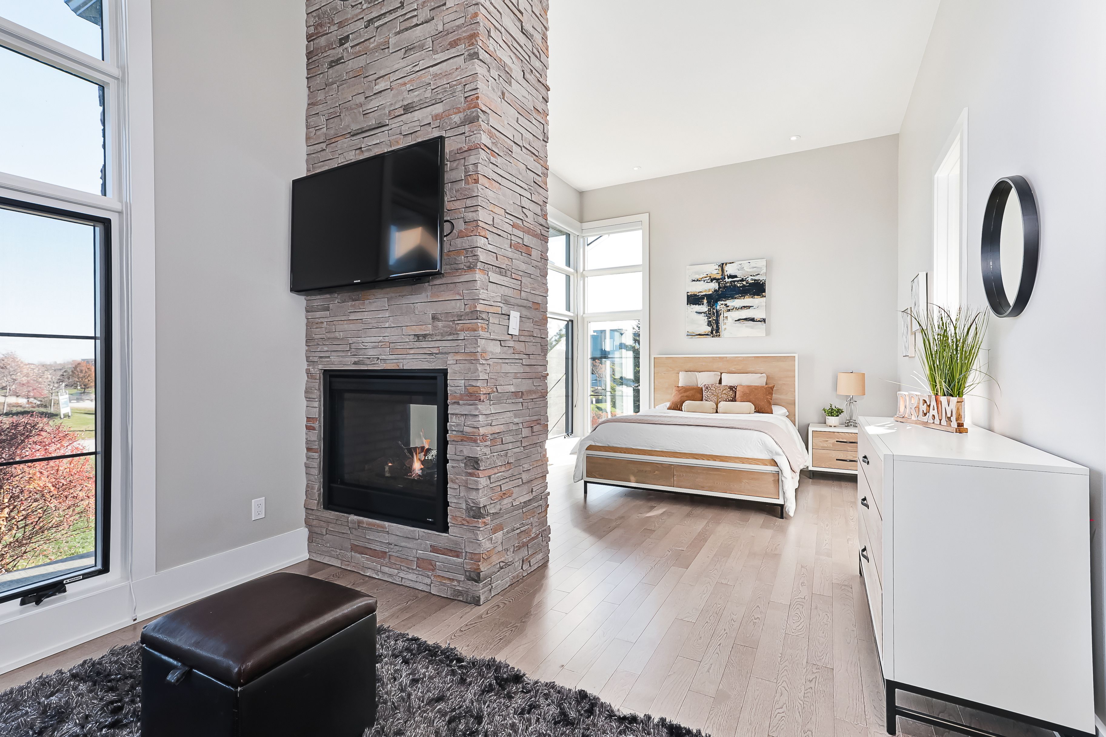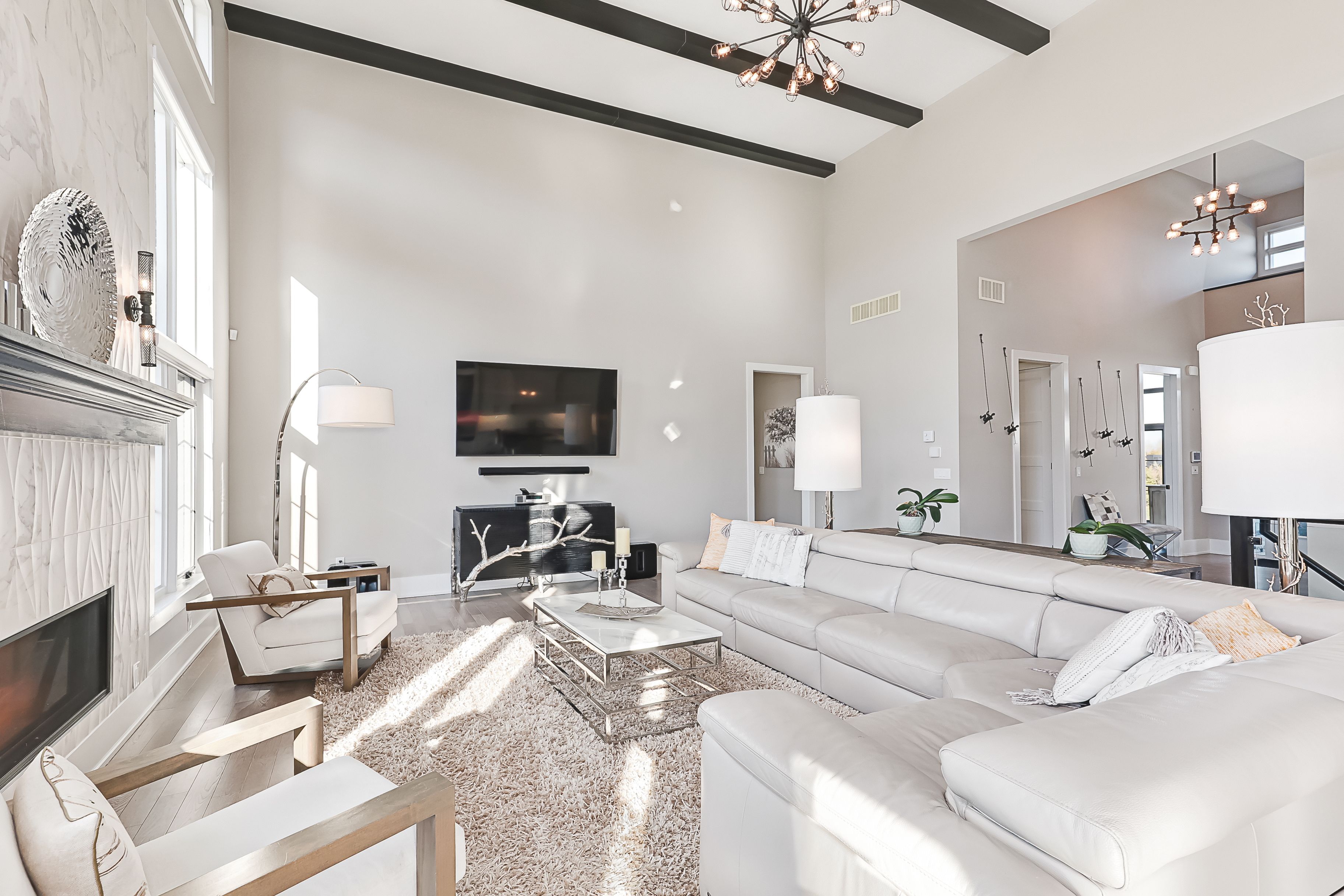 • Stunning Great Room with vaulted ceiling and two-sided fireplace.