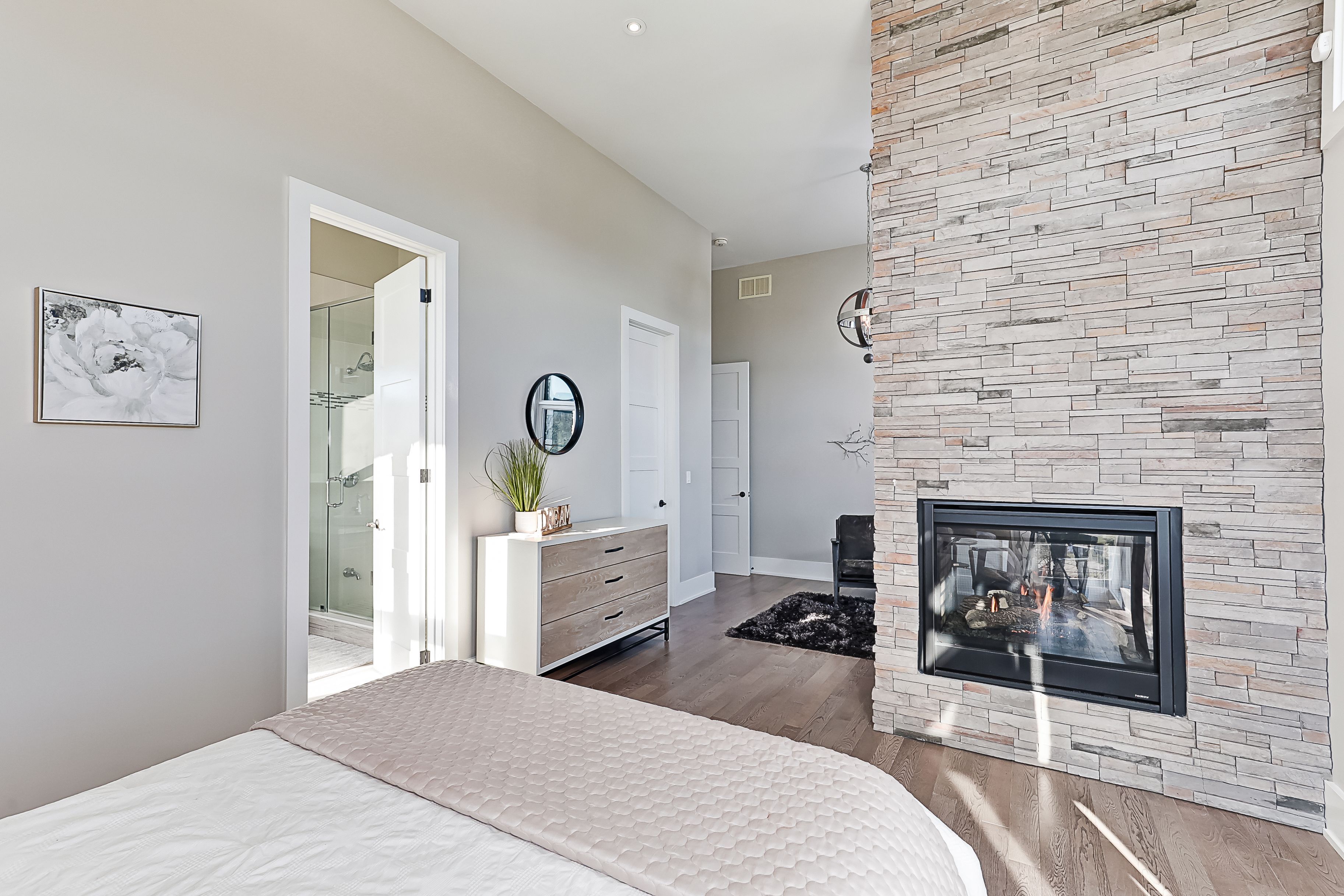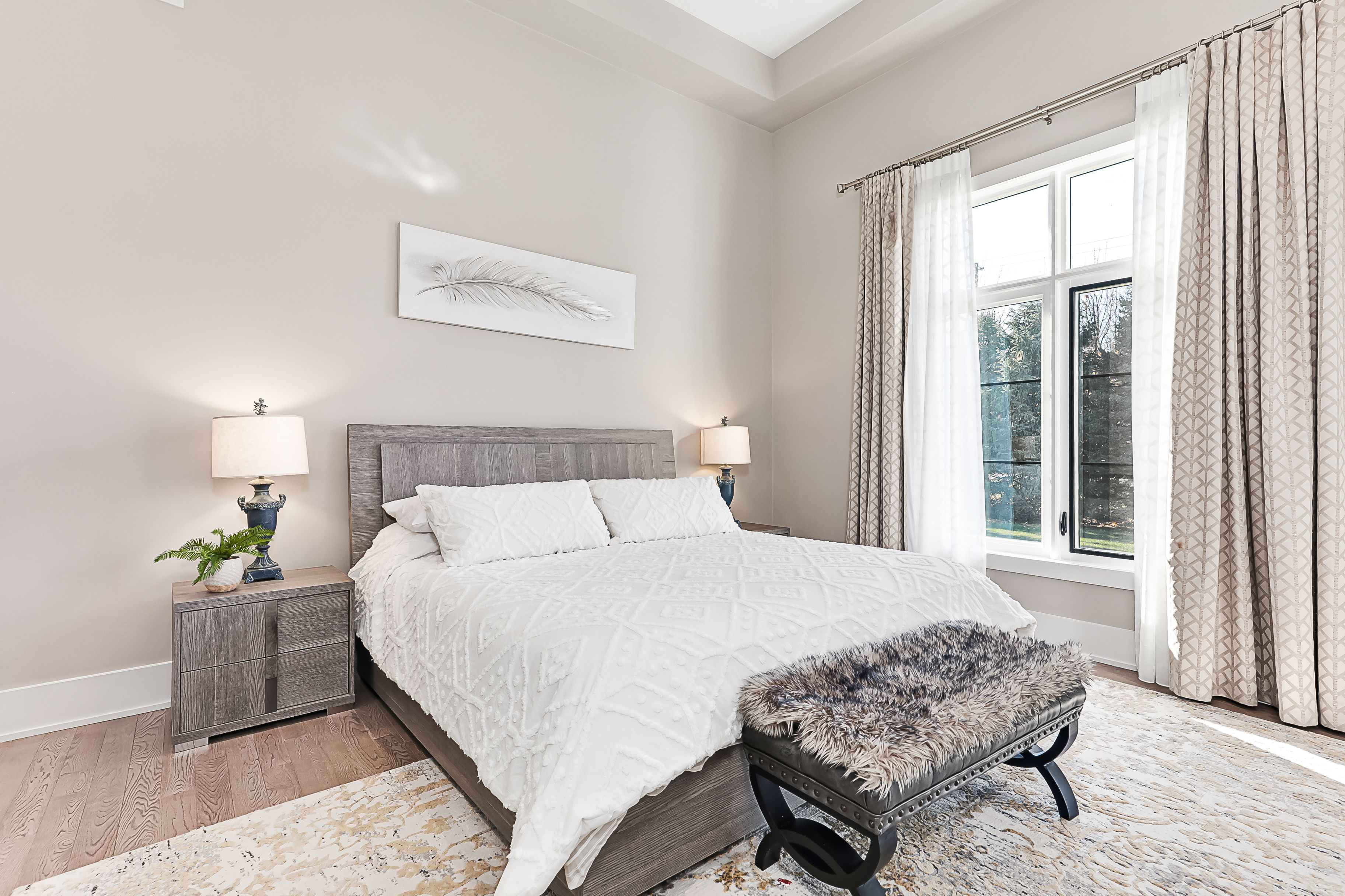 Windrose estates luxury bungalow! This refined 5-bedroom, 4-bath bungalow has over 5000 square feet of finished space and sits on a 1-acre lot at the base of the escarpment, just minutes from osler bluff ski club and blue mountain. Sun-filled and sophisticated, the home features a dramatic great room with a 17' vaulted, beamed ceiling and a two-sided linear fireplace that opens to the west-facing composite deck. Designed for upscale living, the main floor includes two private primary suites with spa-inspired ensuites, a third guest bedroom with a 3-piece bath, upgraded lighting, 8' interior doors, a spacious laundry room, and a well-appointed mud/ski room. The chef's kitchen offers stone counters, premium built-in appliances, a marble mosaic backsplash, and a walk-out dining area. The fully finished lower level delivers true luxury with soaring ceilings and exceptional custom details: a glass-walled gym, a media lounge, and an entertainment bar, both clad in striking backlit white onyx marble, plus a glass-walled office/flex room, two additional bedrooms, and a 4-piece bath. The onyx bar and media space create an unmistakable wow factor. Garage parking for 3 cars, an expansive paved driveway, professionally landscaped grounds, and in-ground irrigation complete this high-end residence. Close to ski clubs, trails, beaches, and marinas, this is an exquisite four-season retreat.