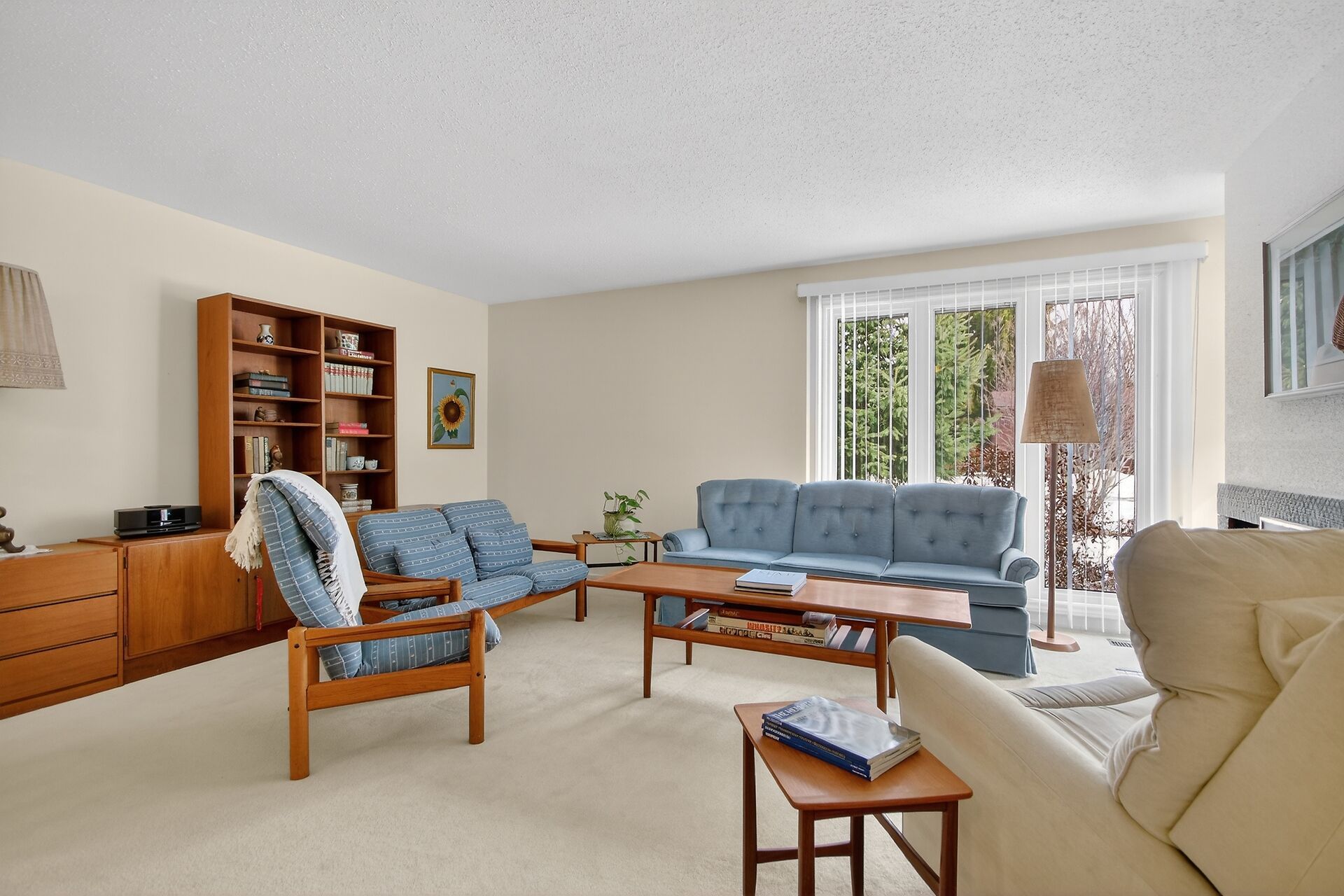 • Open concept living area with large windows and a gas fireplace.