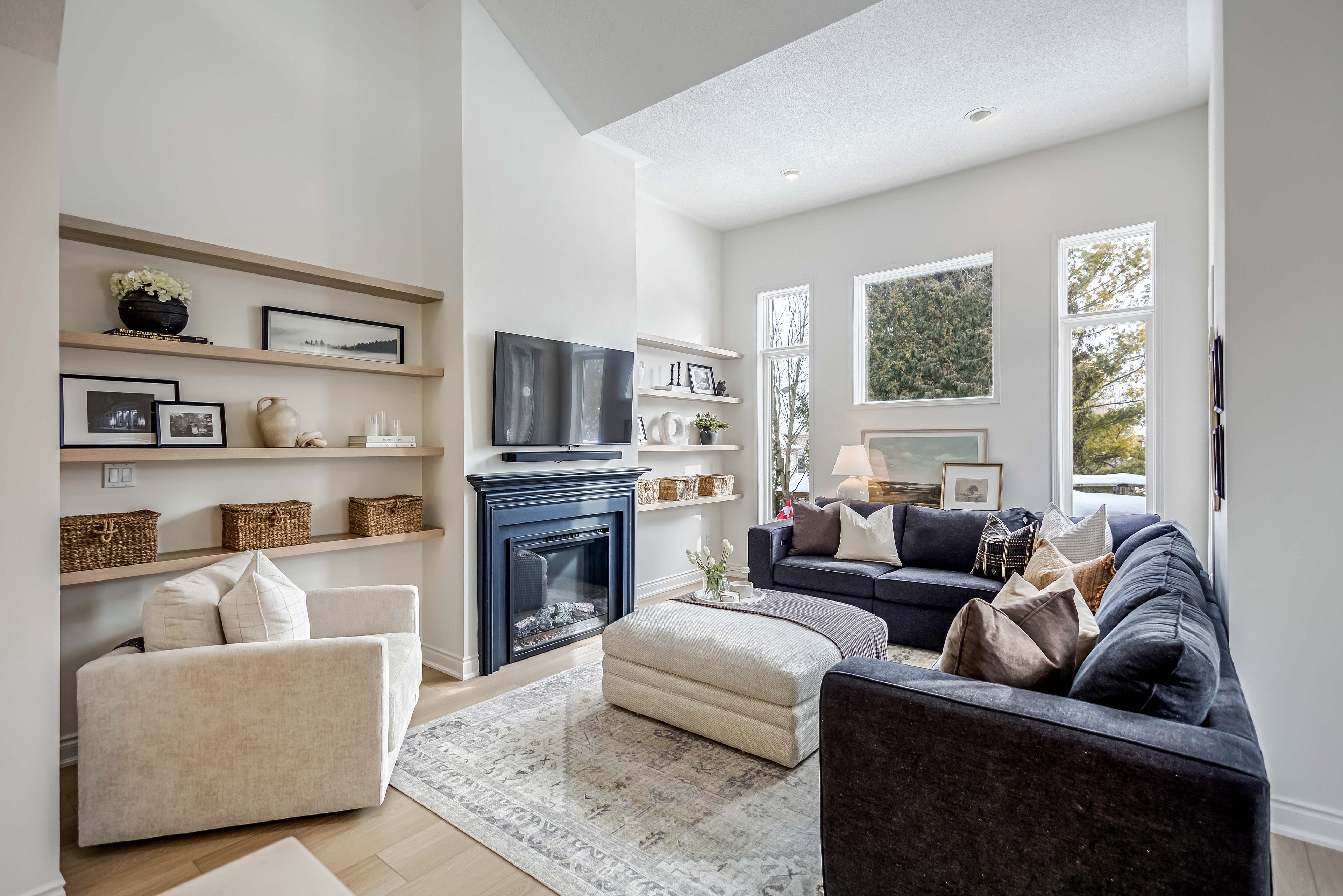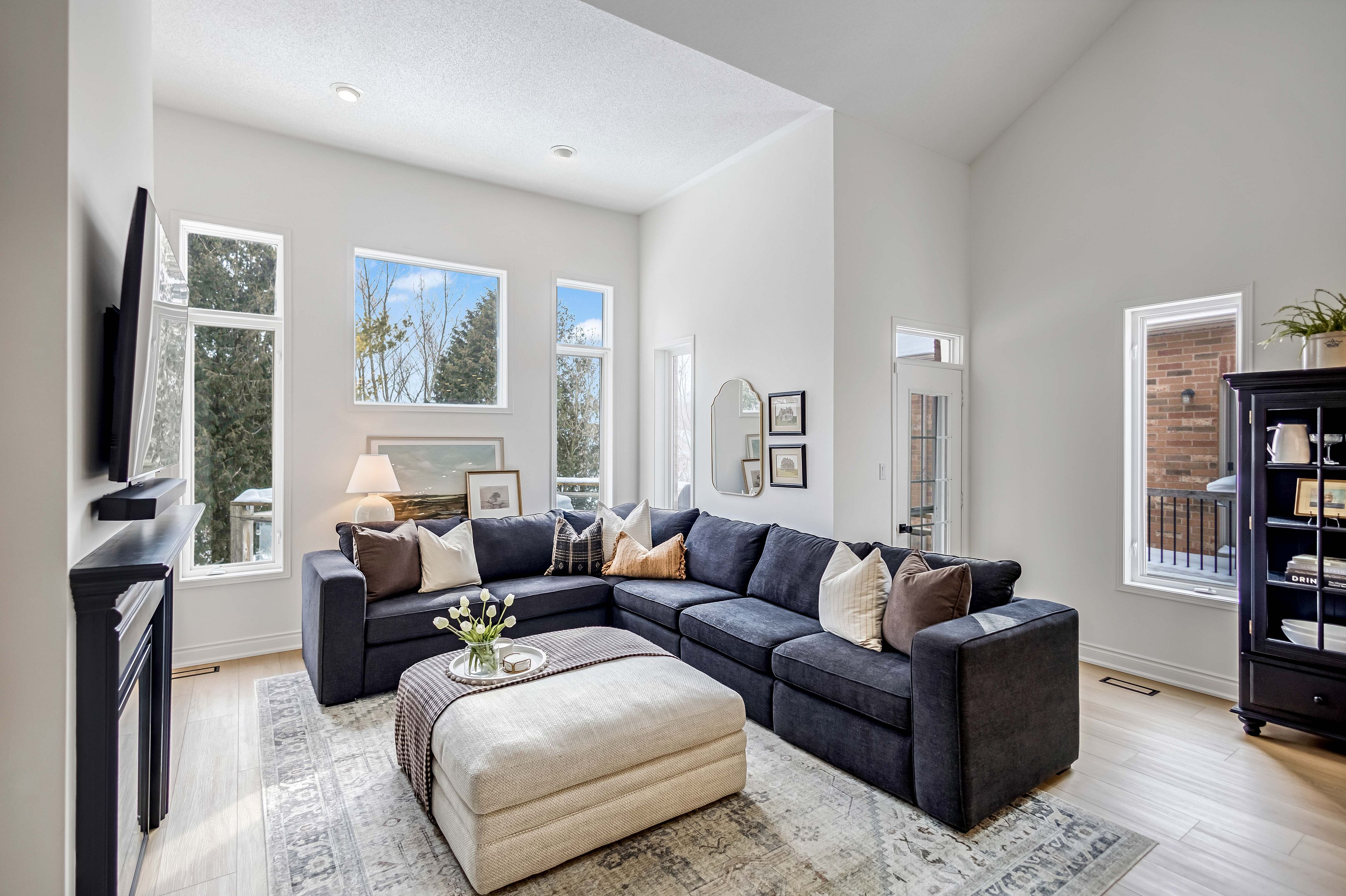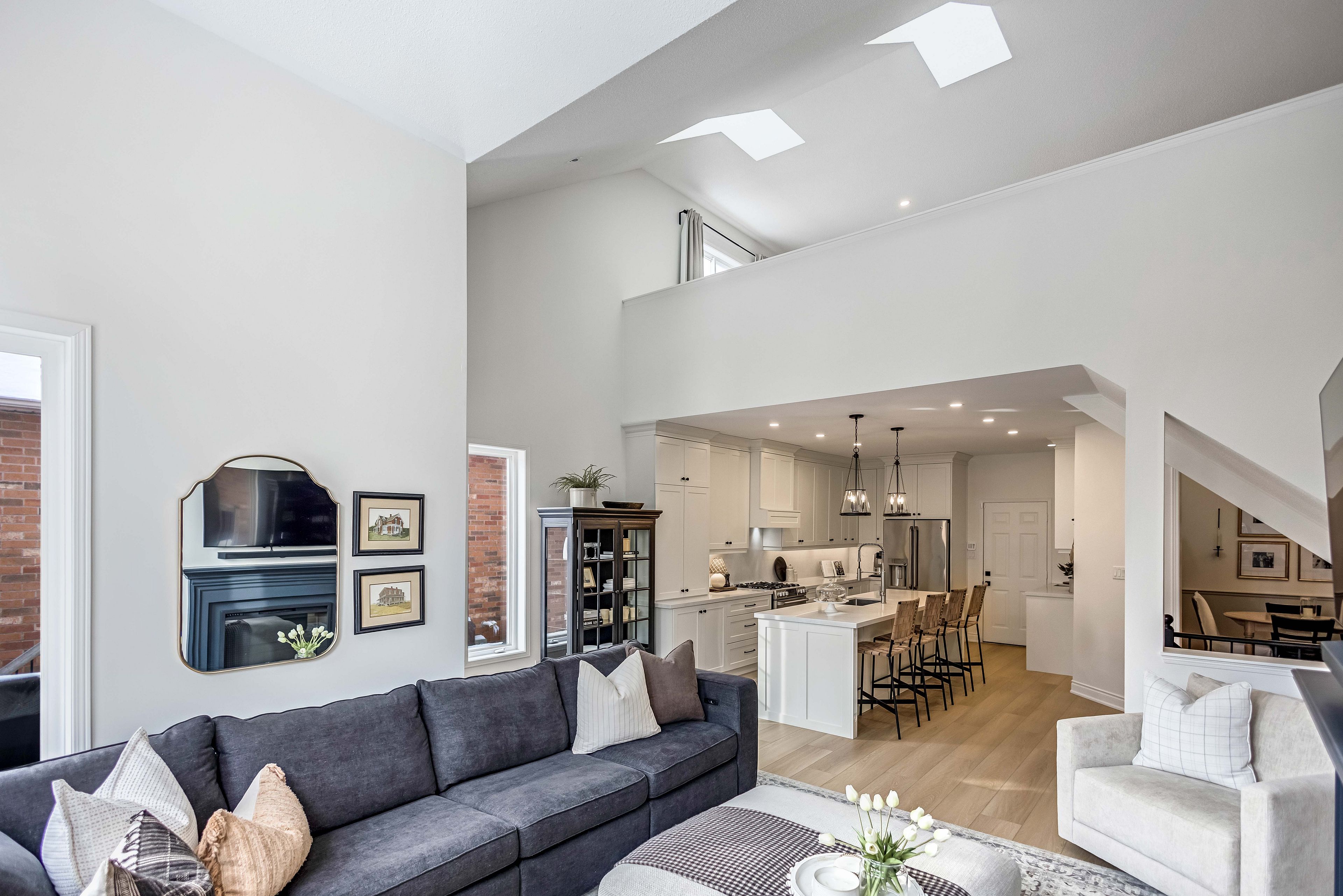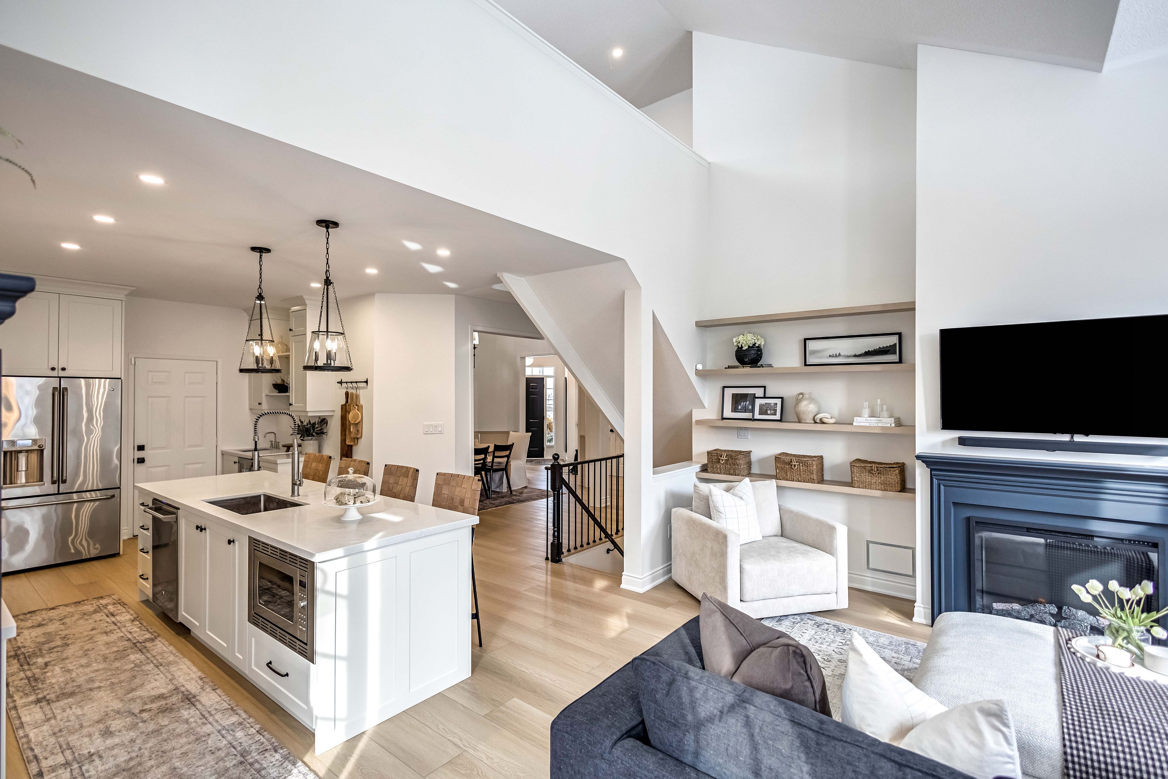 • Spacious family room featuring high ceilings and a cozy fireplace.