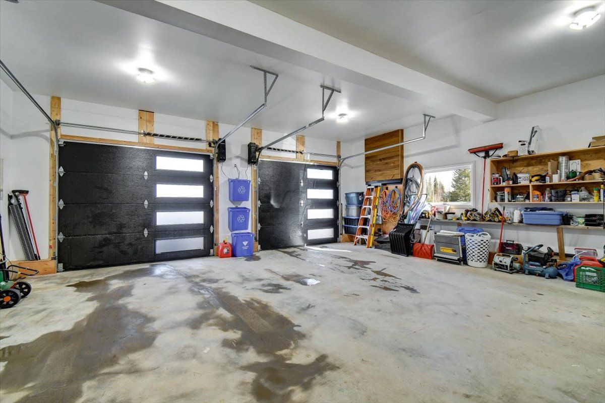 • Massive insulated two-bay garage with extra workspace for hobbies.