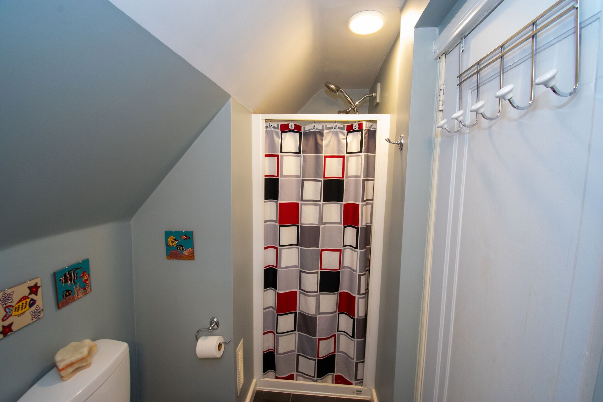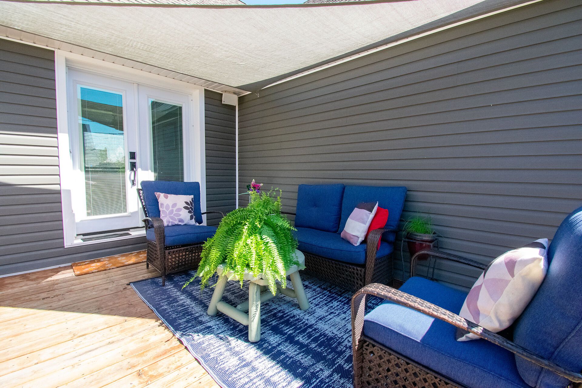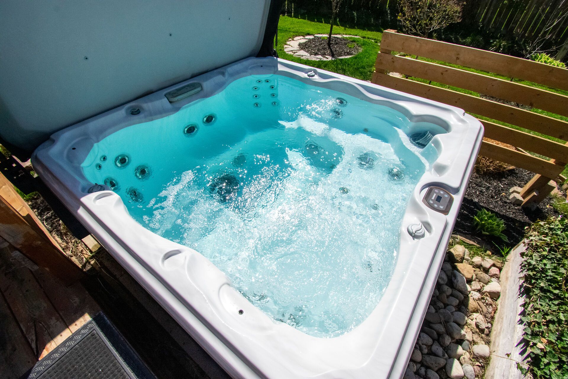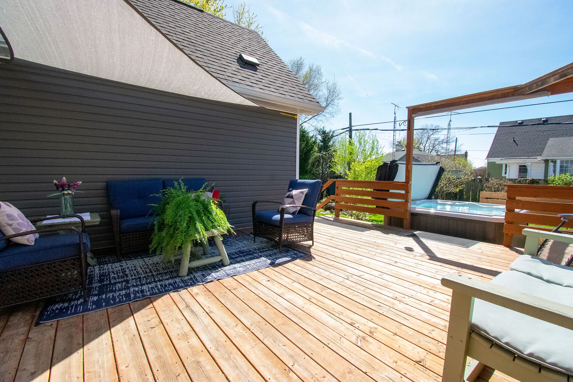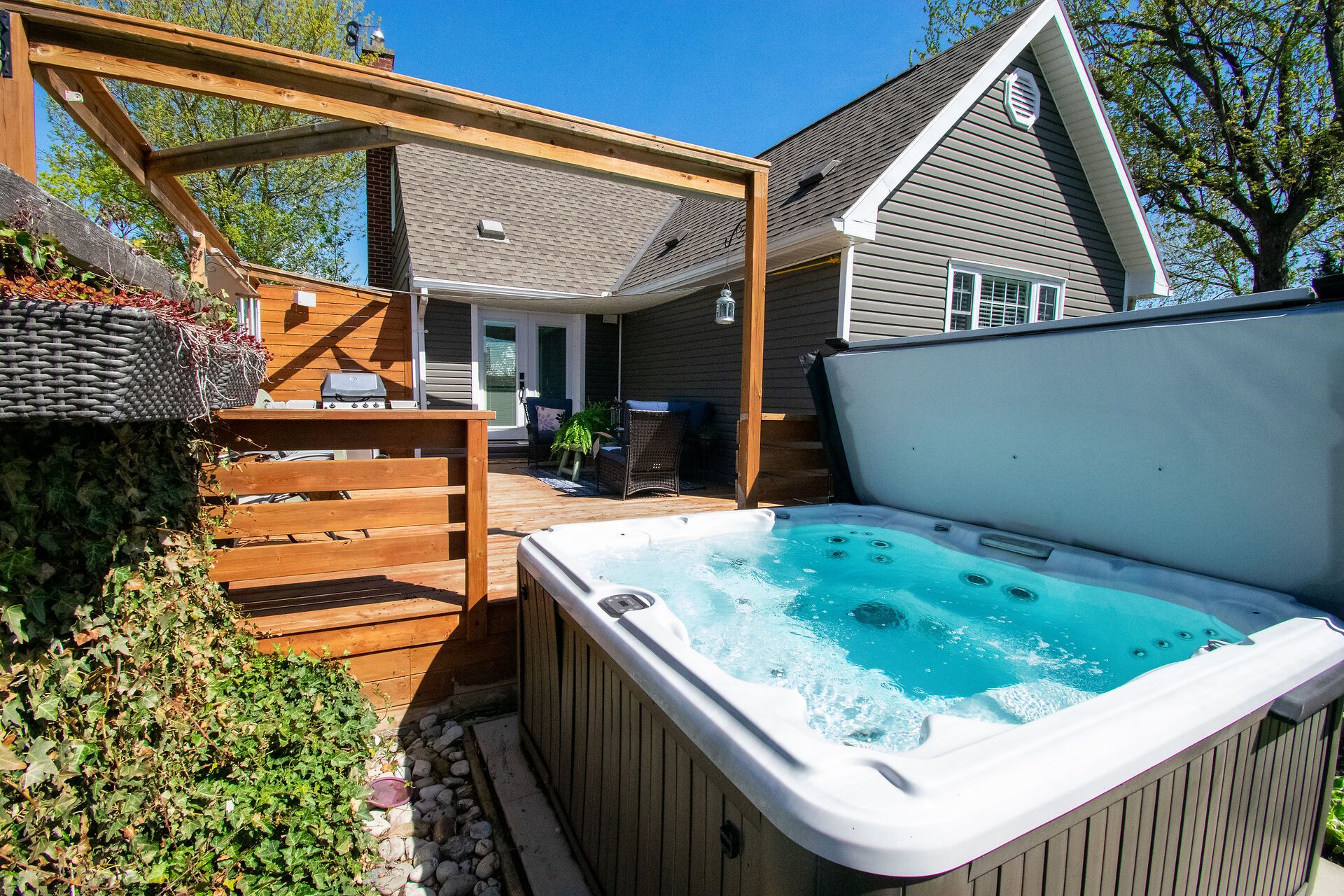 • Large deck with privacy screens and hot tub for relaxation.