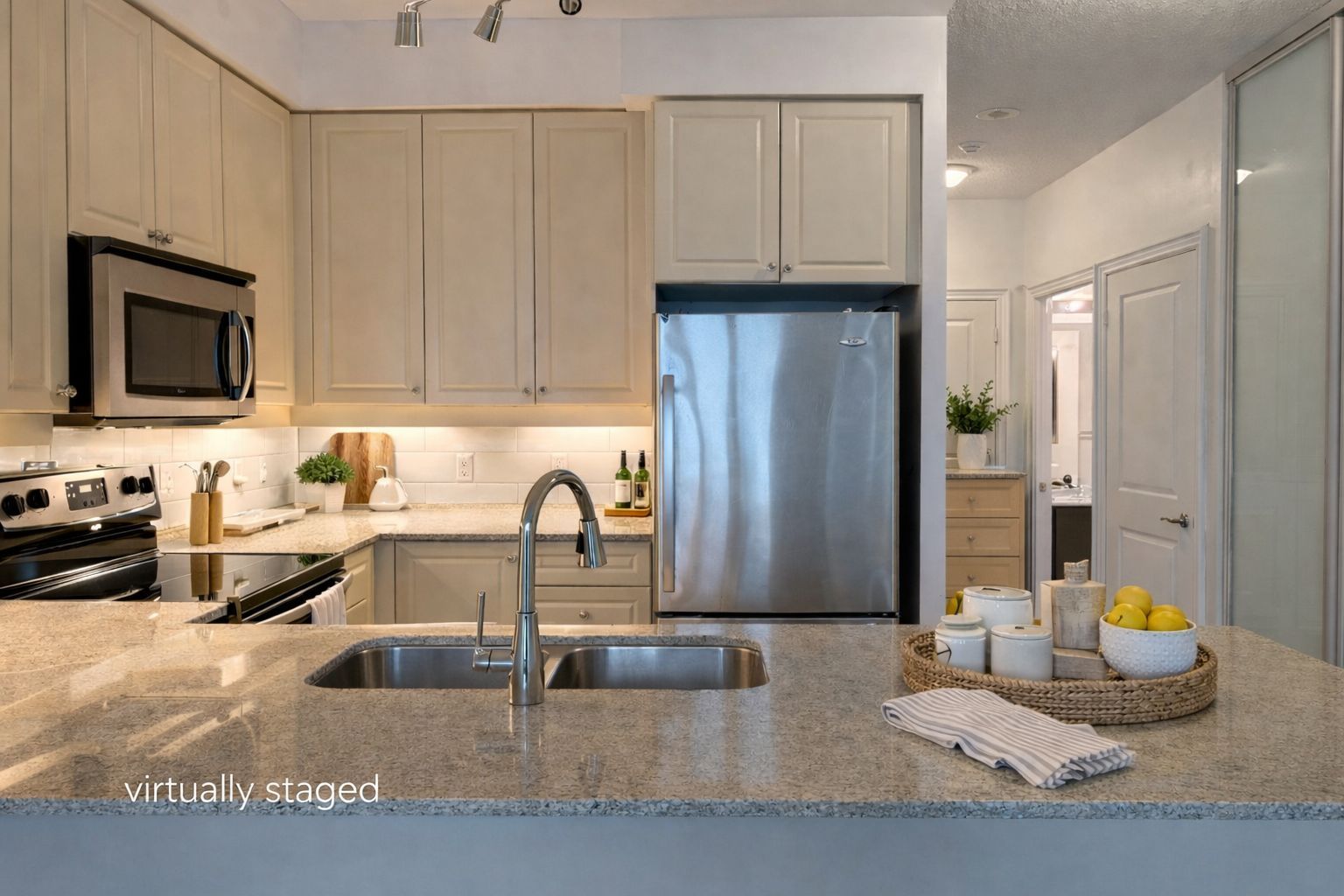 • Sleek kitchen equipped with stainless steel appliances.