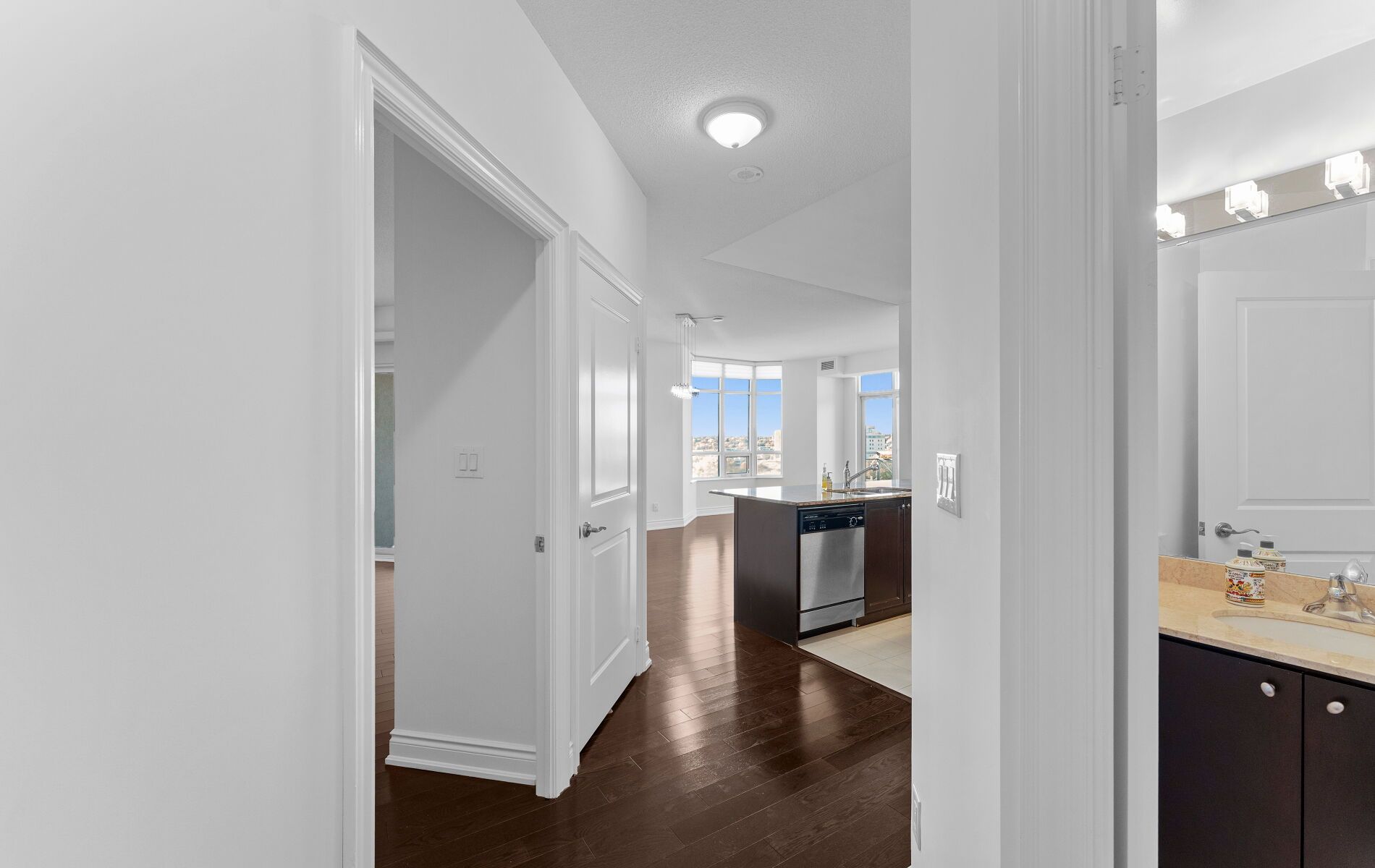 Luxury living at aria condominiums! Immaculately maintained & upgraded corner suite featuring 2 split bedrooms, 2 baths, approx. 935 sq. Ft. + 2 balconies (approx. 140 sq. Ft.). Functional fantasia model layout with 9 ft ceilings & unobstructed southwest views. Bright & spacious with floor-to-ceiling windows throughout. Modern kitchen with granite countertops, mirrored backsplash, and stainless steel appliances. Hardwood floors throughout, open concept living & dining area, and two private balconies offering panoramic city & green views. Conveniently located near elevator. Building amenities: indoor pool, whirlpool, fitness centre, yoga studio, party room, theatre room, guest suites, 24-hr concierge, and visitor parking. Beautifully landscaped grounds with tranquil walking paths. Prime north york location: steps to ttc, subway, bayview village shopping centre, fairview mall, north york general hospital, parks & trails. Quick access to hwy 401 & 404. Experience luxury, comfort, and convenience in one of north york's most prestigious communities!