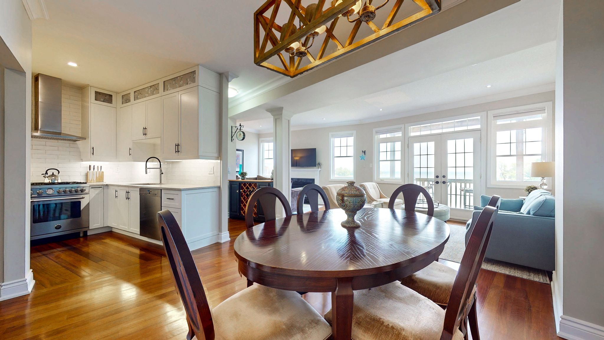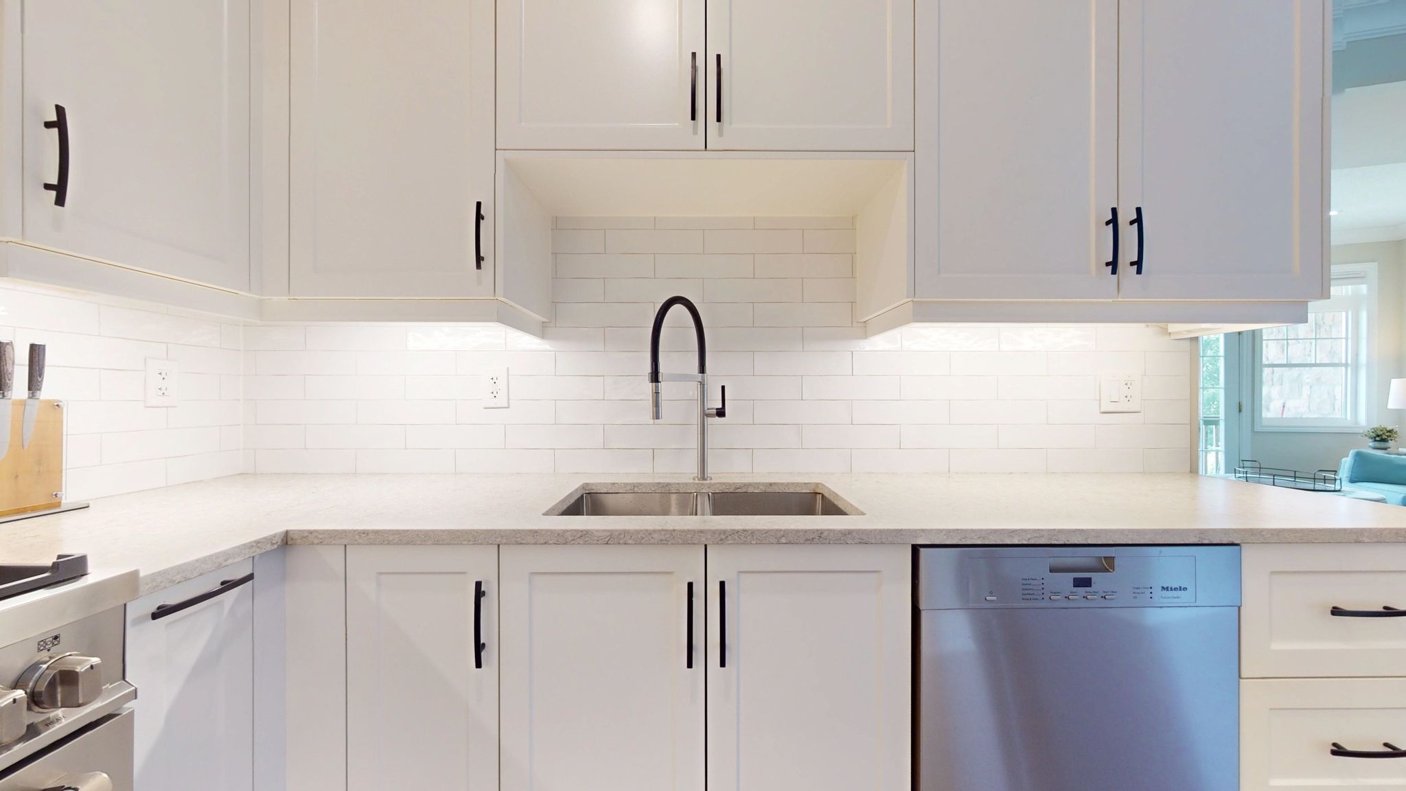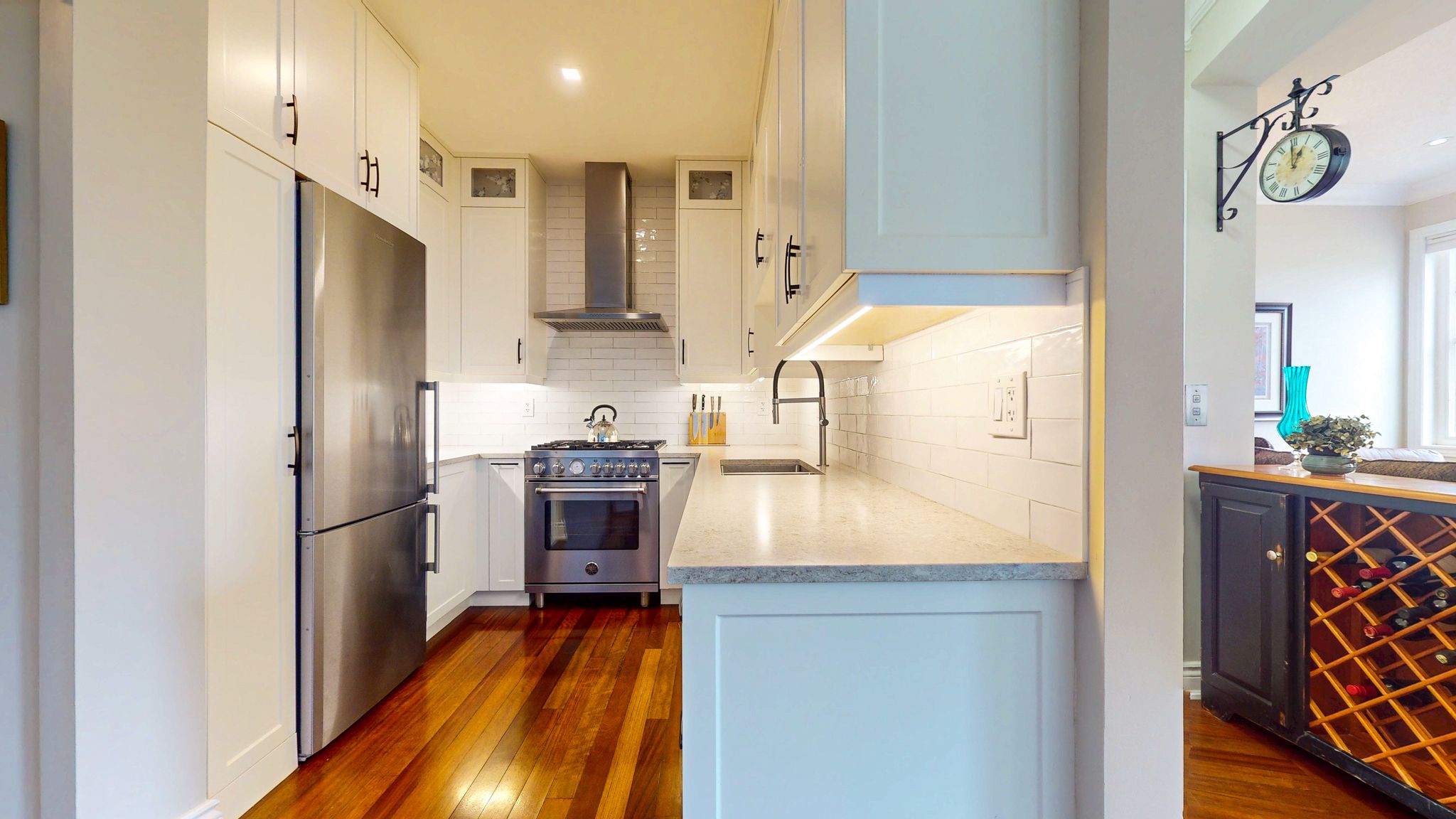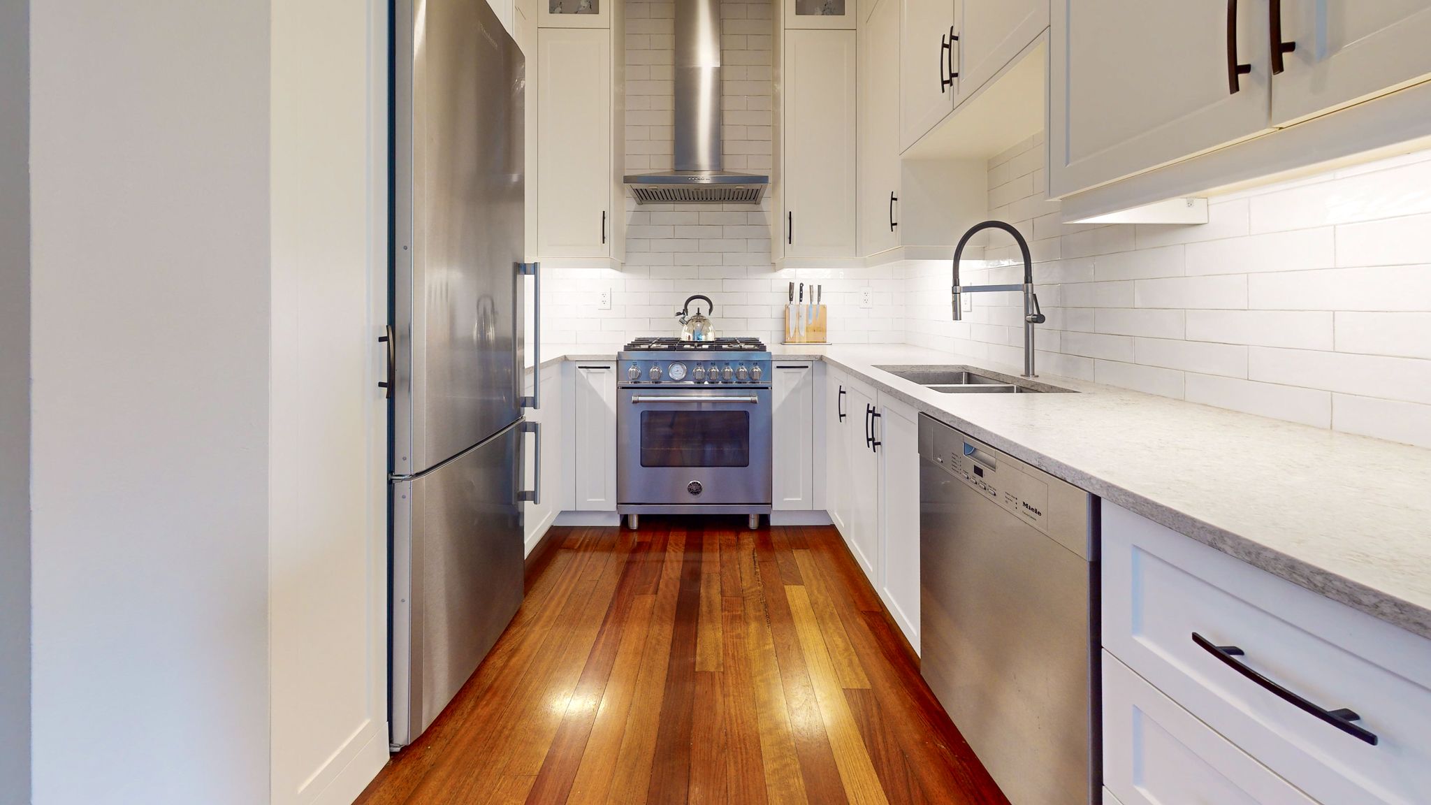 • Modern chef's kitchen with premium appliances and quartz counters.