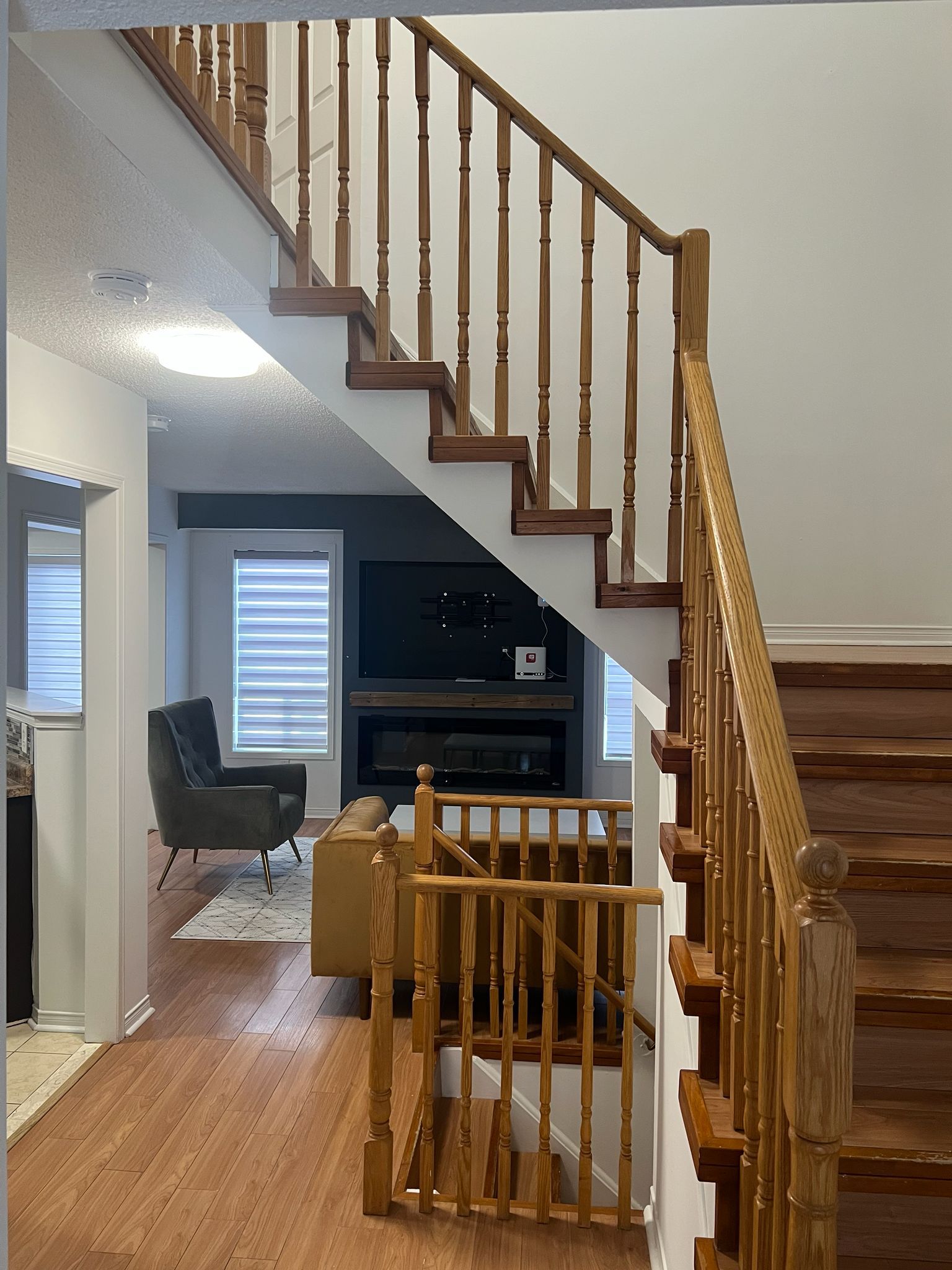 • Open-concept living/dining area with an electric fireplace.