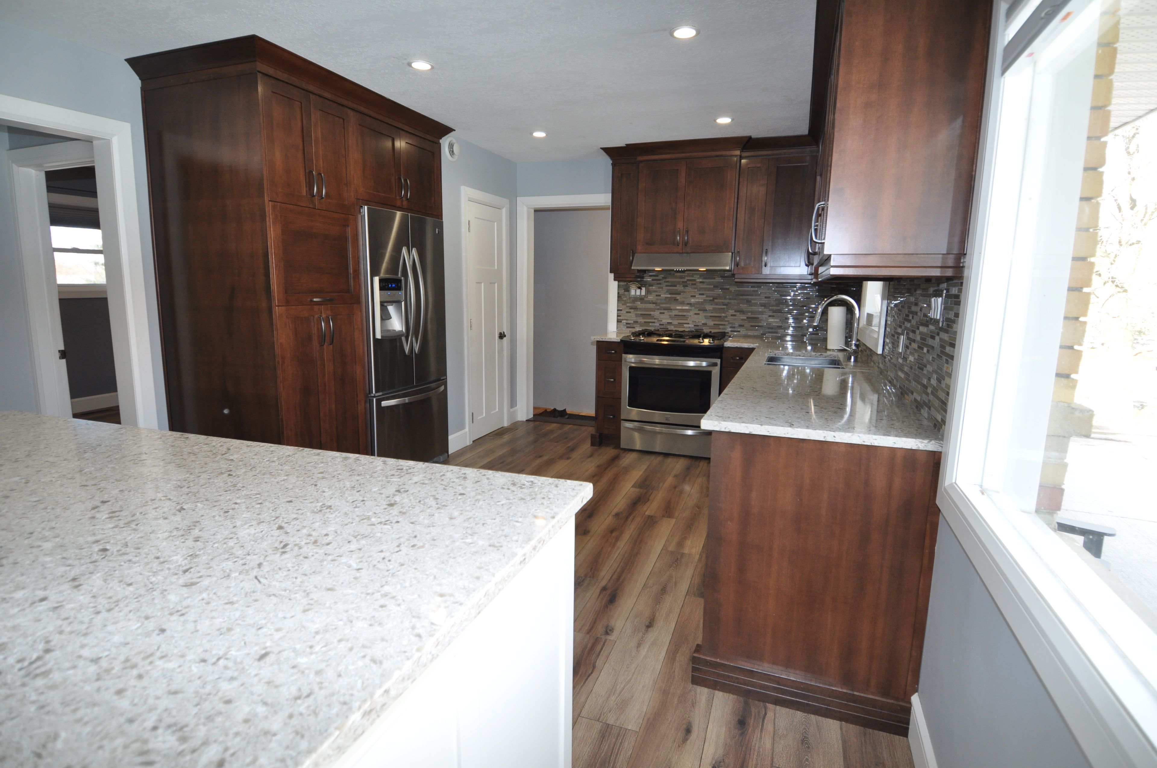 Looking for that move in ready bungalow? Come and view this wonderful updated 3 bedroom 3 bath bungalow, perfectly blending modern comfort with functional design. Step inside to an inviting open-concept kitchen and living area-ideal for both everyday living and entertaining. The kitchen impresses with high-end custom exquisite soft-close cabinetry, quartz countertops, a 6-foot island, above-counter lighting, and a pantry closet. The living room features a large bay window and recessed pot lighting, creating a bright, welcoming space. The primary bedroom is a true retreat, offering a luxurious 4-piece ensuite complete with a 6' soaker tub, tiled shower, quartz counters, a heated towel rack, and a generous walk-in closet. The guest bathroom includes a large walk-in shower and warm-to-the-touch 6ml rubber vinyl tile flooring. The finished lower level adds even more living space with a cozy rec room, a combined 2-piece bath and laundry area with quartz countertop above the washer and dryer with plenty of custom cabinetry, along with an additional bedroom or lower level office. The home boasts new flooring throughout. The home is equipped with forced-air natural gas heat and central air, updated electrical and plumbing (2016), newer windows in the basement, back of the house, and garage, hickory stair treads, custom blinds, and a carbon filter water system for chlorine removal. The attached single-car garage features gas heat and an automatic opener. Outdoor living shines with a 24' x 20' composite rear deck-perfect for summer gatherings, a pad and electrical hookup for your hot tub, and a large insulated shop with hydro, a concrete floor, ideal for tools, toys, or hobbies. Additional features include a double concrete driveway with parking for up to 6 cars, and roof shingles replaced in 2017. This thoughtfully updated home offers comfort, quality, and exceptional attention to detail-ready for you to move in and enjoy.