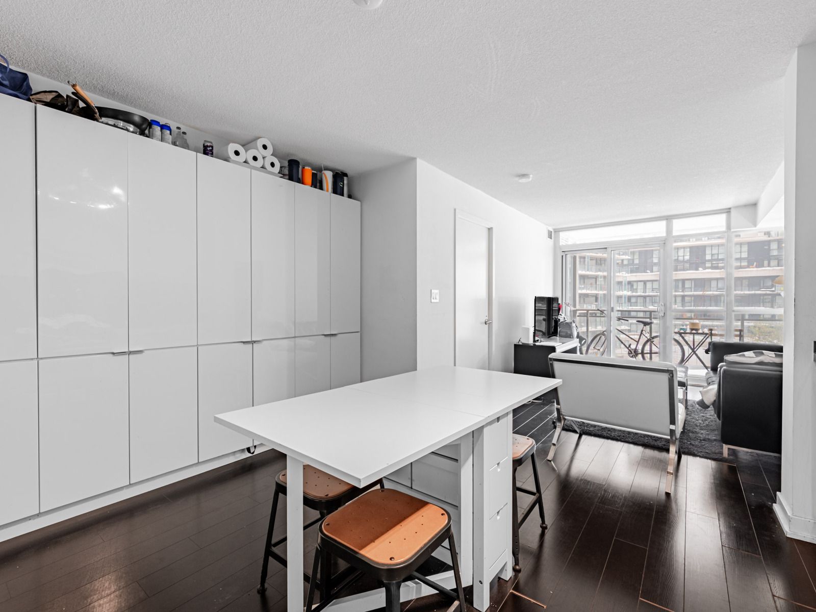 • Luxury condo features modern cabinetry and a built-in pantry.