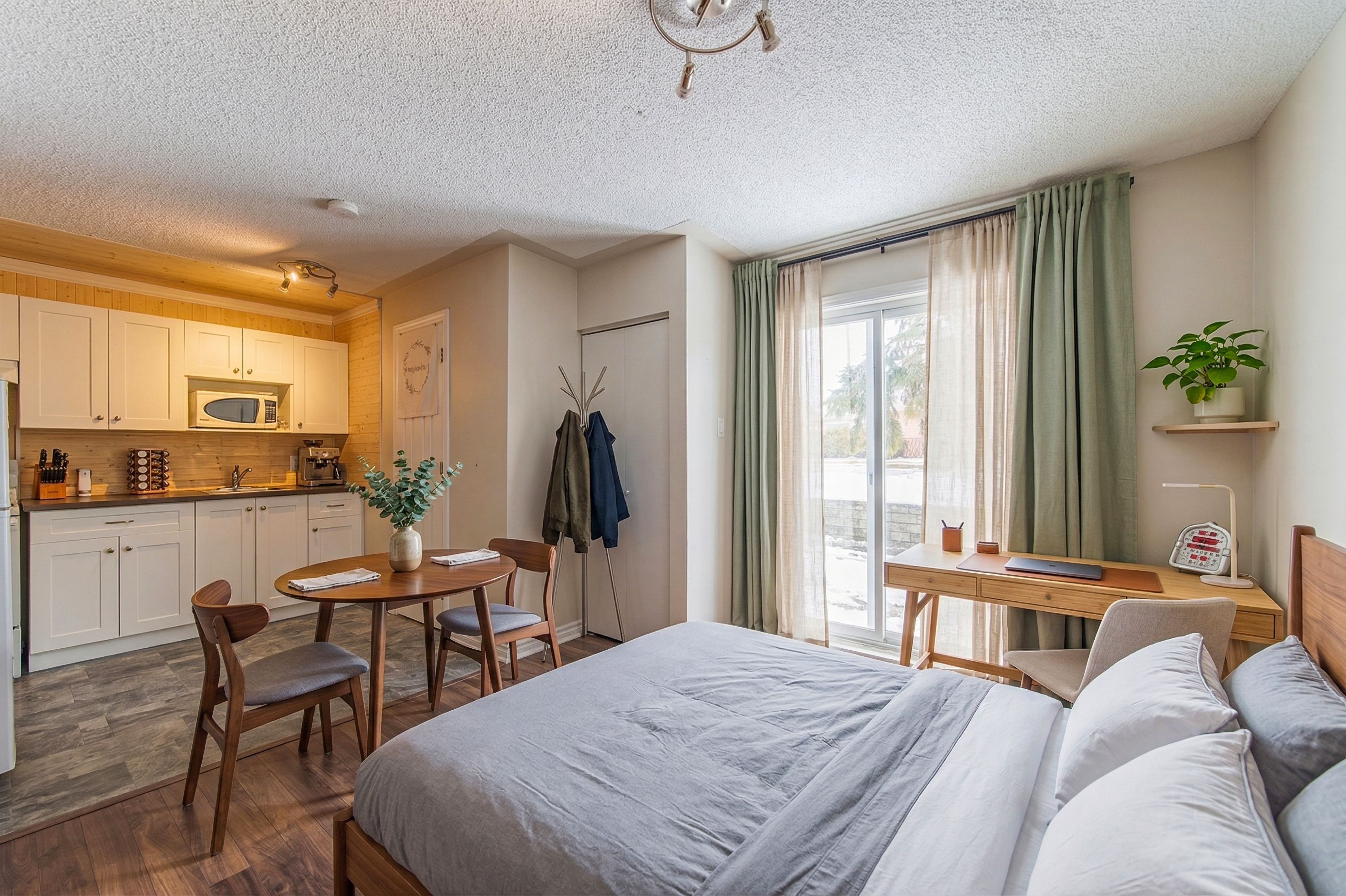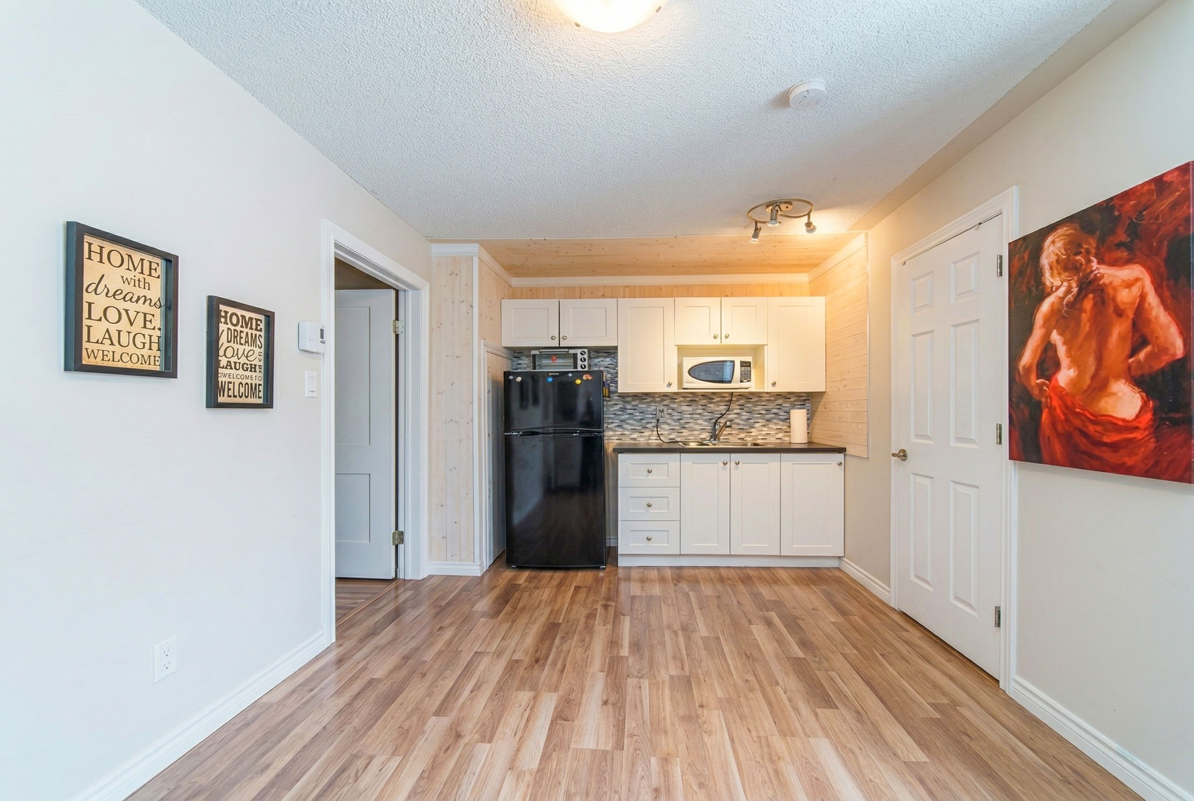 • Open-concept living area with a cozy wood-burning fireplace for comfort.