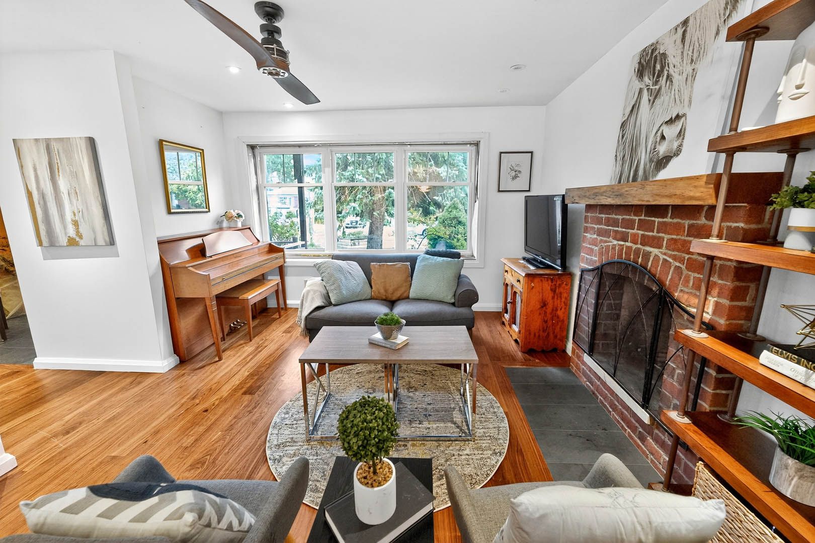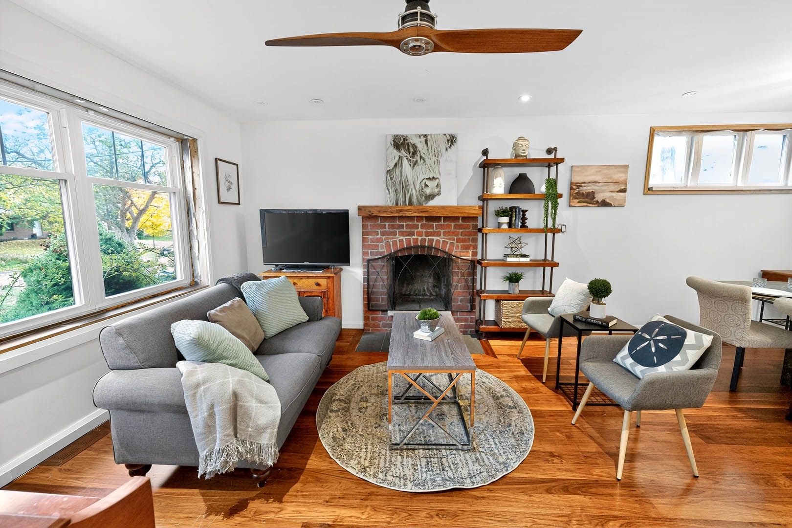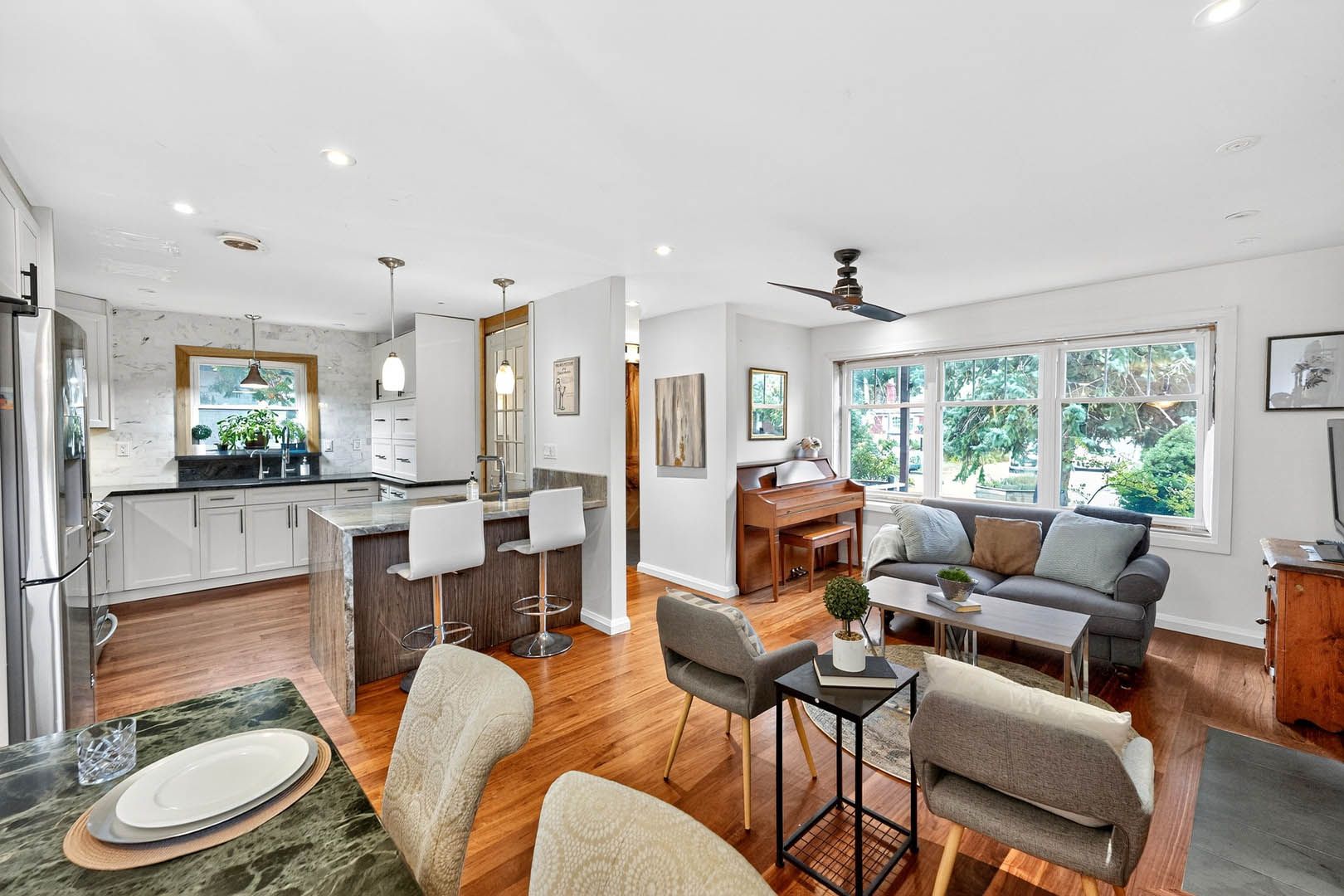 • Open-concept main floor features a renovated kitchen with natural stone countertops.