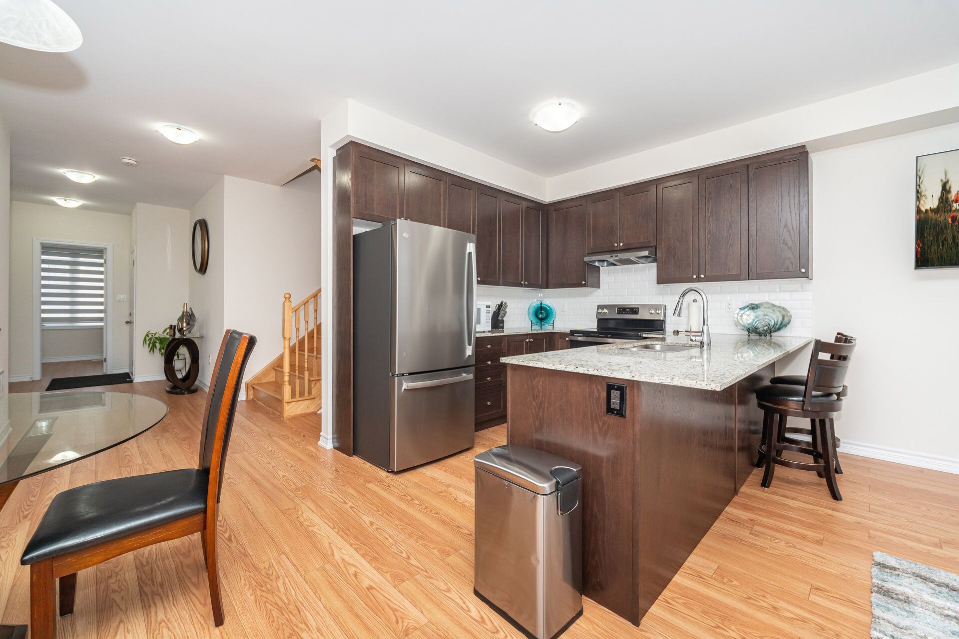 • Family-sized kitchen featuring granite countertops and stainless steel appliances.