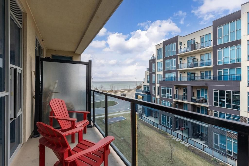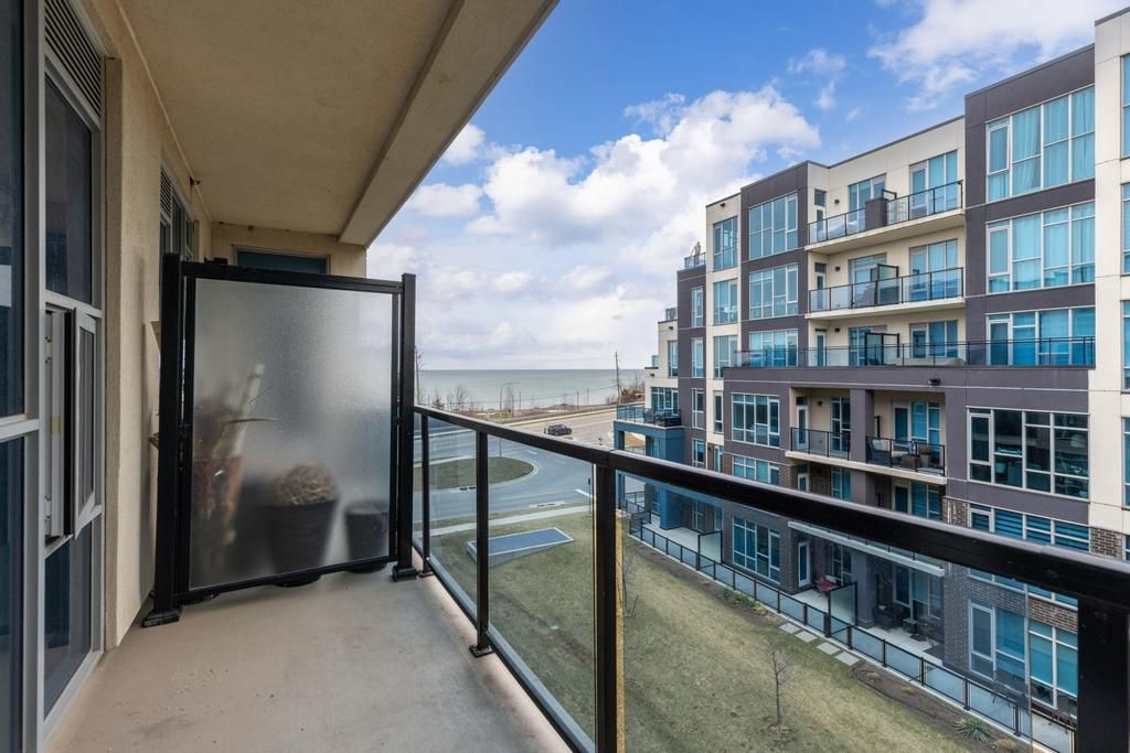Big, bright and beautiful 714 sqft 1bdrm + 1 condo with 1 owned parking space and 1 owned locker and a fabulous balcony with views of lake ontario! Welcome to #412 in the very desirable aquablue condominium where living at the shore is no longer a dream. Enjoy a wonderful open concept living rm with mounted tv, dining and kitchen space complete with high end stainless steel appliances, custom waterfall counter top and attractive bar stools. The master bdrm offers a nice size, mounted tv and the must have walk-in closet. There is access to the very attractive wshrm with oversized borderless glass shower from both the master suite and the hallway. A bonus 2nd rm is ideal as a home office or den. Laundry is tucked away inside a closet. High end blinds are included. Floor to ceiling windows offer bright, natural light and views. Building amenities are what you would expect; from rooftop terrace with beach chairs and barbecues, to a fitness centre and party rm. Perfectly located within walking distance to the lake, trails, shops, restaurants and easy access to major highways. Perfect for commuters and turn key living.
