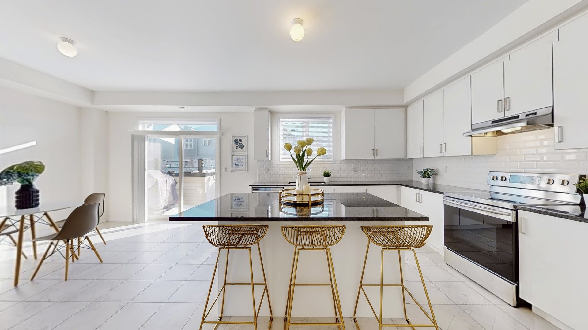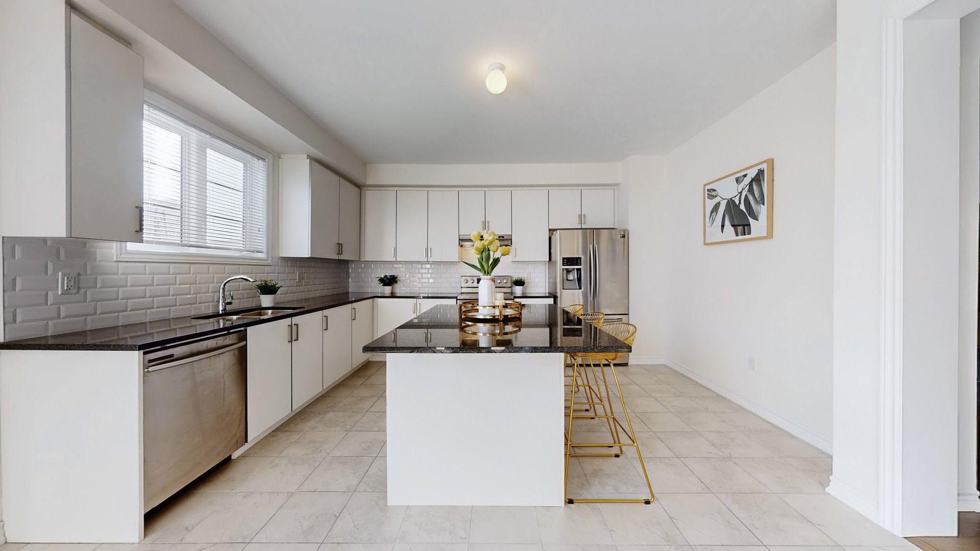 • Gourmet kitchen features granite counters and a large island.
