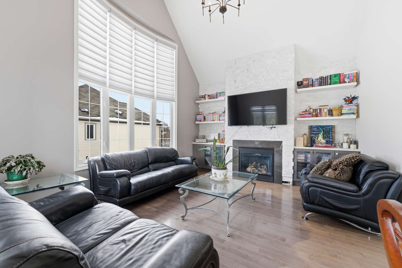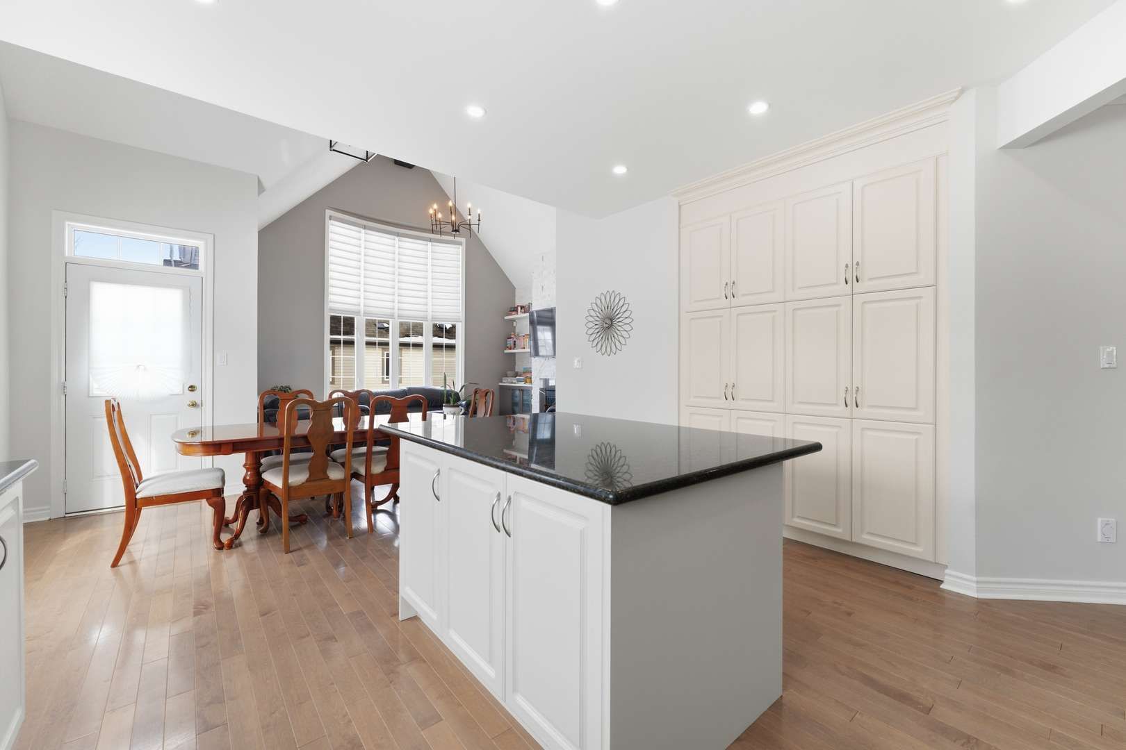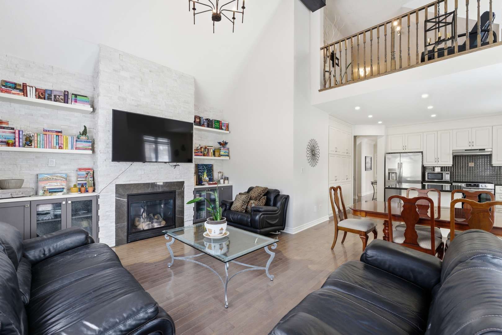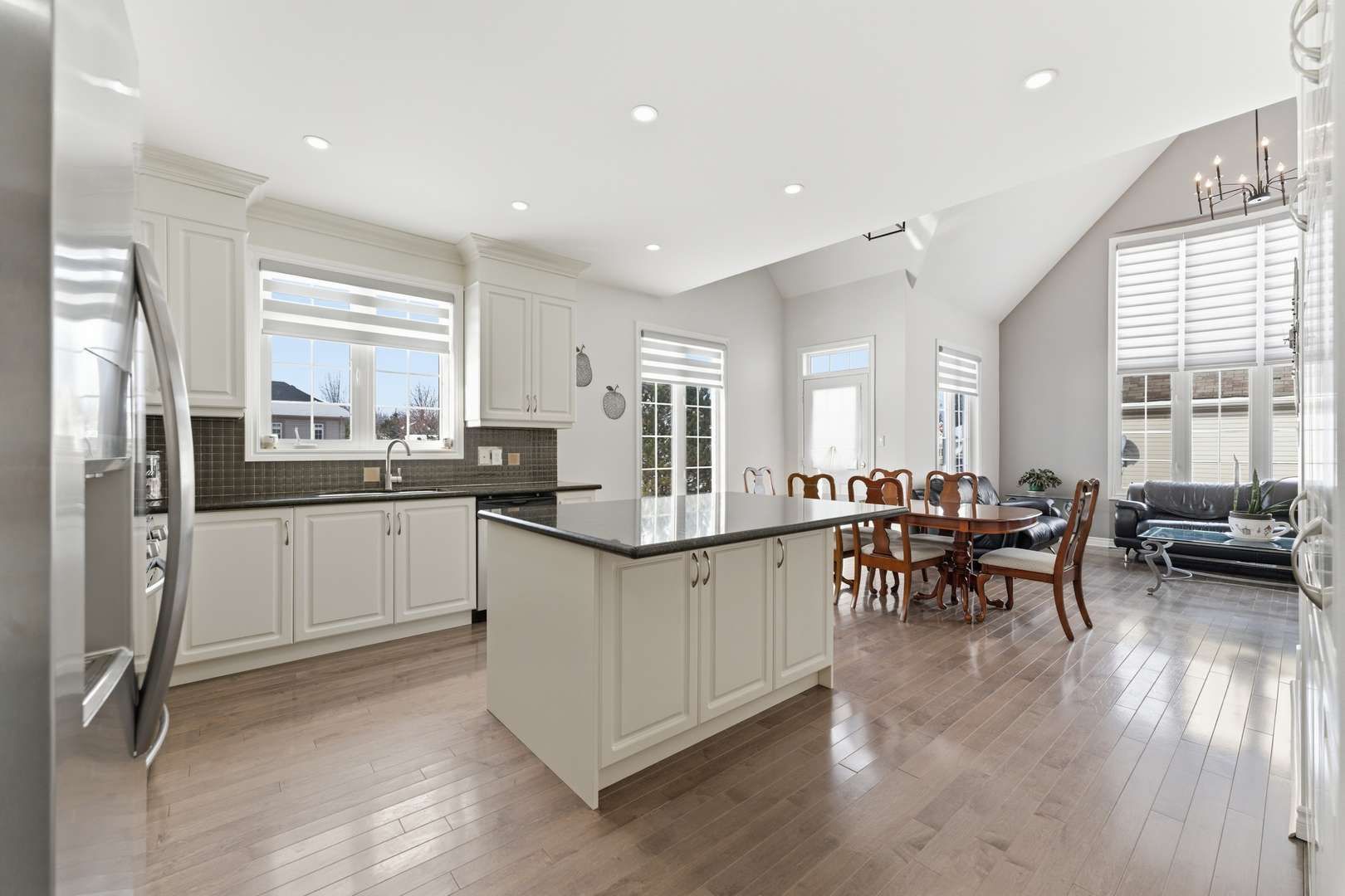 • Open-concept layout with vaulted ceilings and modern kitchen finishes.