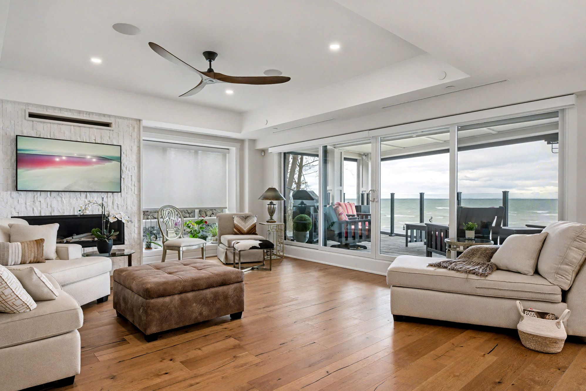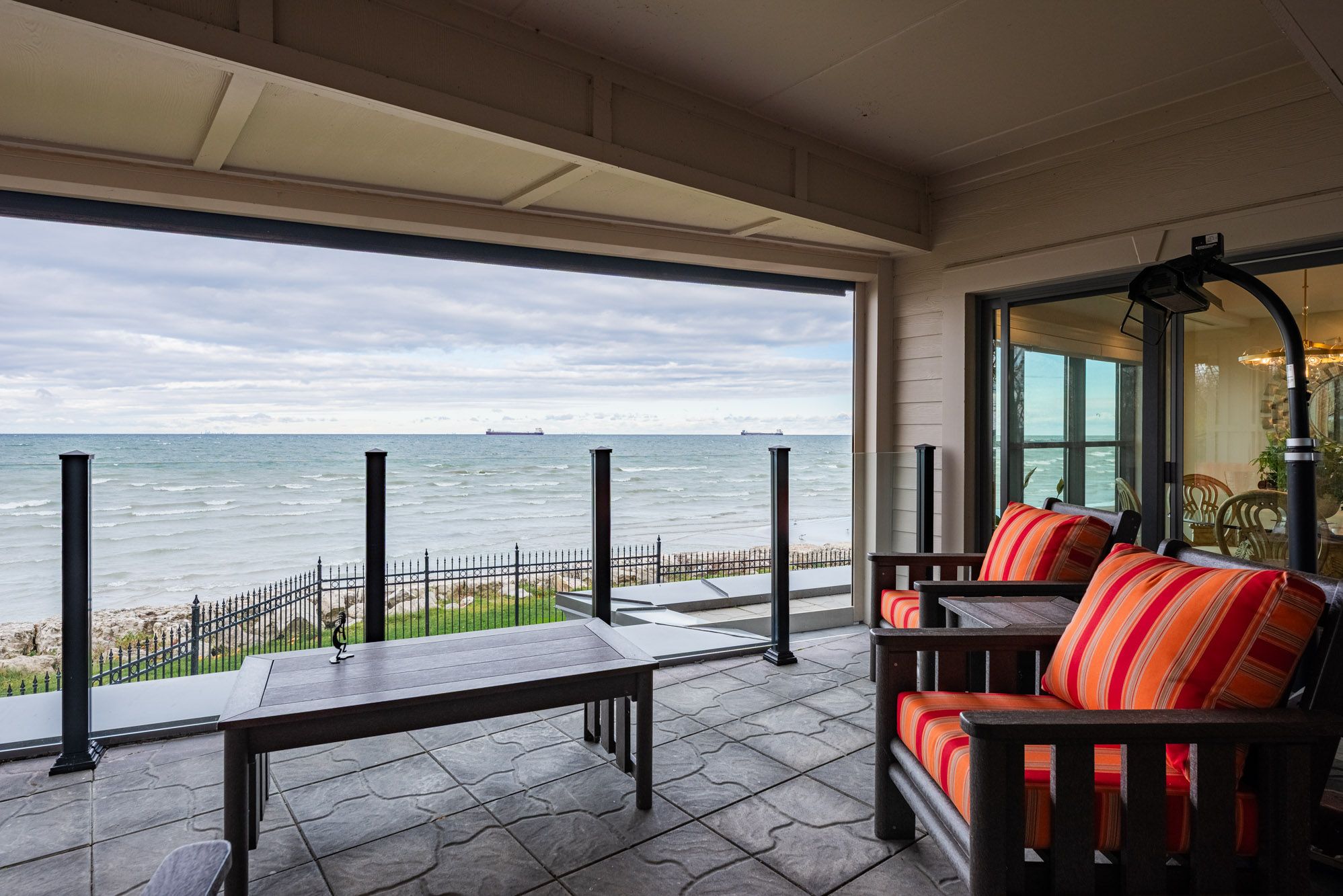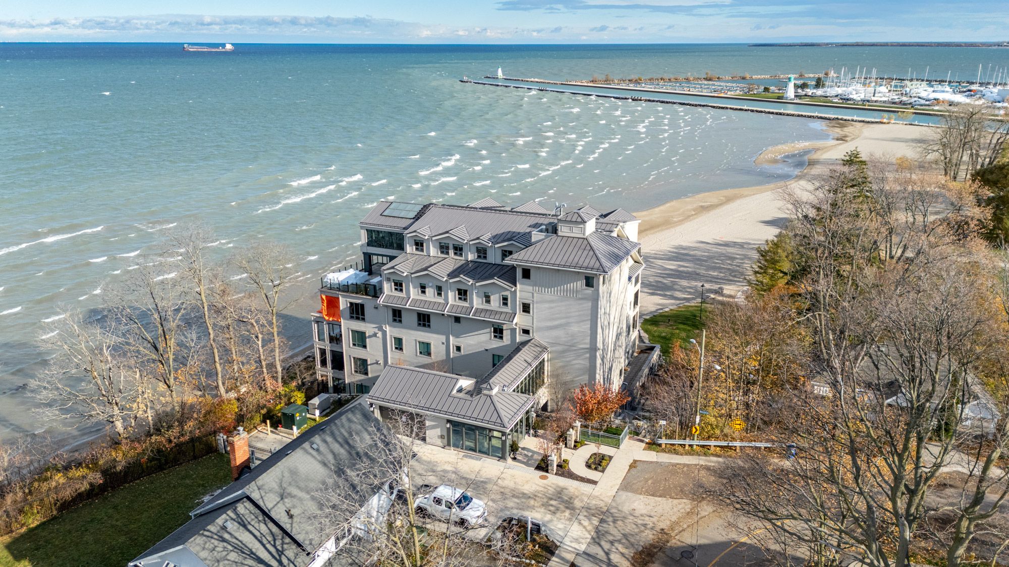 Welcome to the beaches at port, one of st. Catharines' most desirable boutique condo buildings. Suite 101 offers a rare opportunity to enjoy luxury living along the waterfront, paired with peaceful views of lakeside park and sweeping, unobstructed panoramas of lake ontario. Floor to ceiling windows bring in natural light throughout the day and showcase incredible sight lines, including the cn tower, oakville shoreline, and the skyway bridge. The custom artcraft kitchen with built-in fisher & paykel appliances opens to a bright living and dining space designed for relaxing or hosting. A 260 sq ft terrace extends your living area outdoors, perfect for taking in sunset views over the lake. Thoughtful upgrades include a remote screened balcony, gas line for bbq, tiled balcony flooring, hunter douglas motorized shades in every room, 40" door ways to accommodate wheelchairs sonos sound system, heated floors in both bathrooms, and a full alarm system. Condo fees cover snow removal, grounds maintenance, visitor parking, insurance, storage locker and water. With the planned hoverlink ontario service expected to provide a 30 minute connection between toronto and st. Catharines, this location is poised to become even more convenient. A refined lakeside lifestyle awaits.. Make this home yours today.