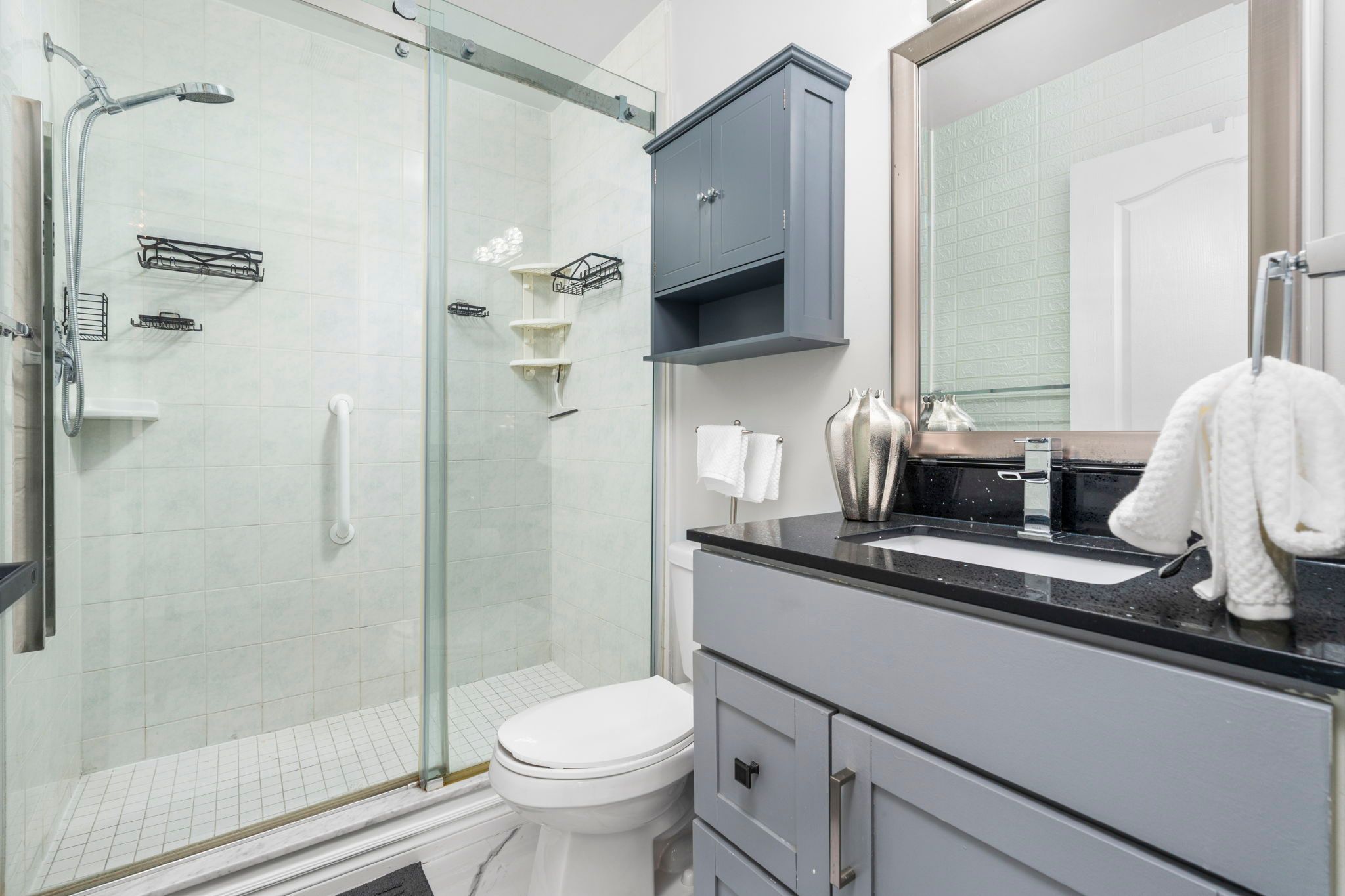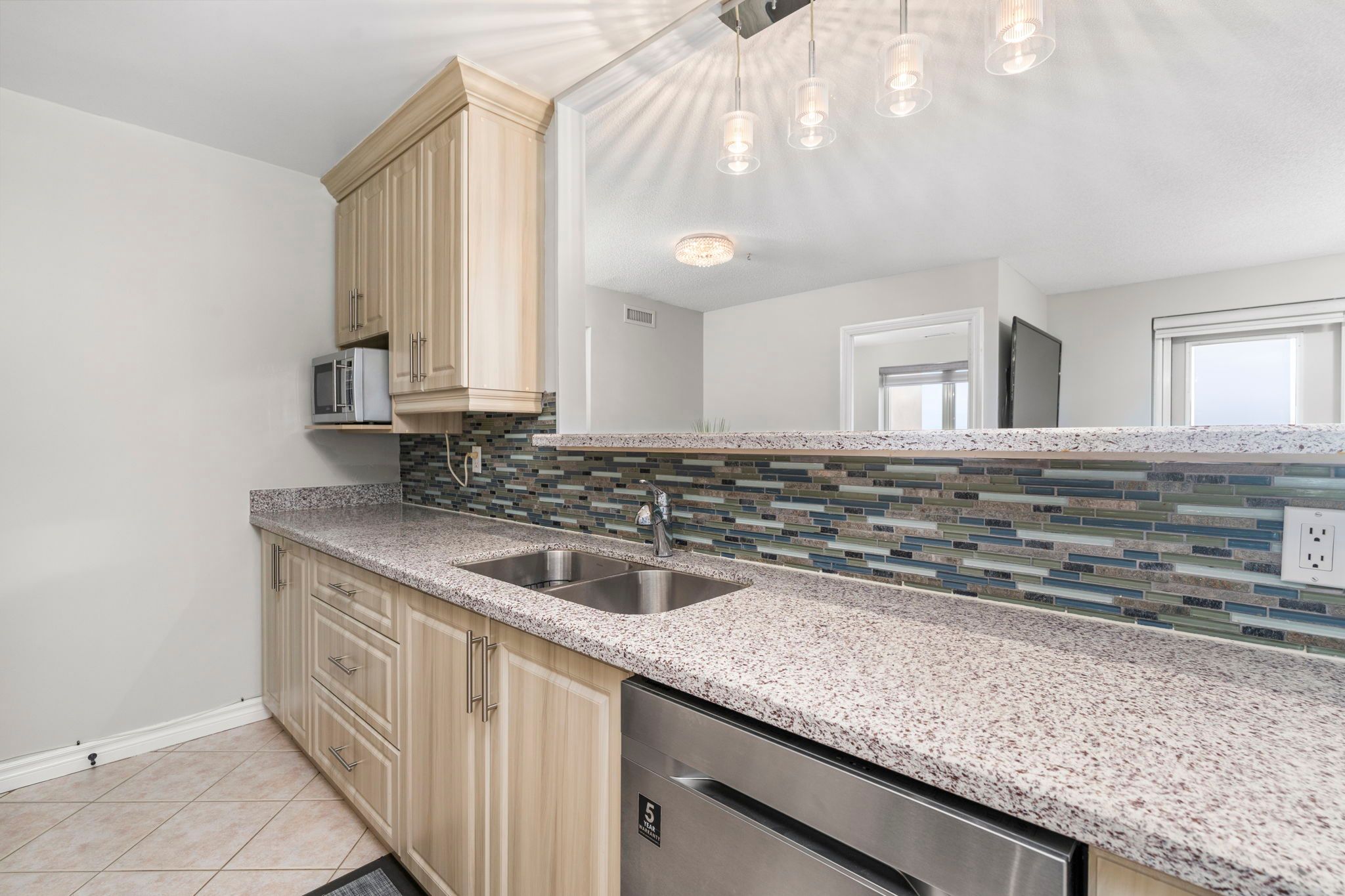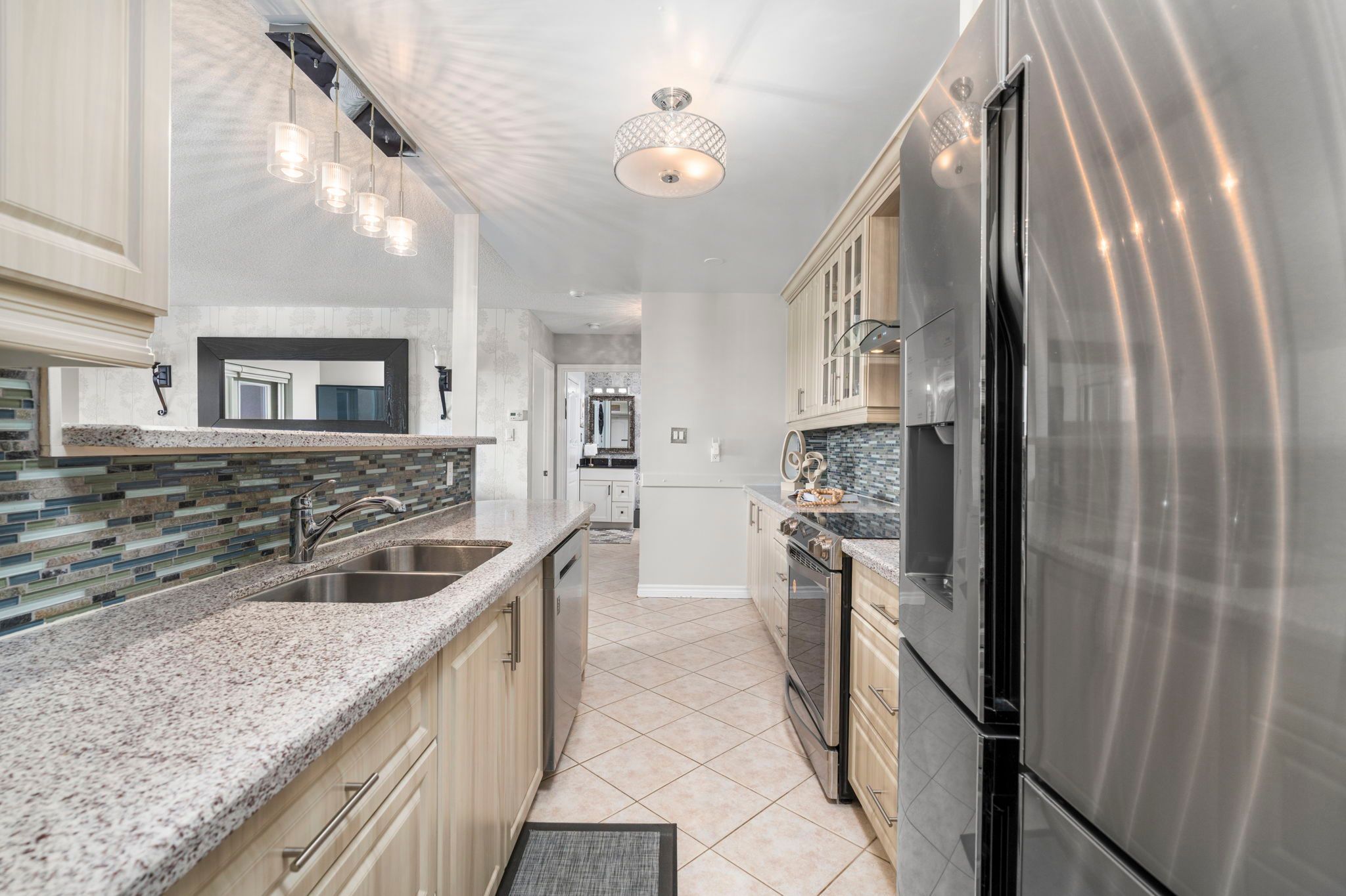 • Modern kitchen with granite countertops and stainless steel appliances.