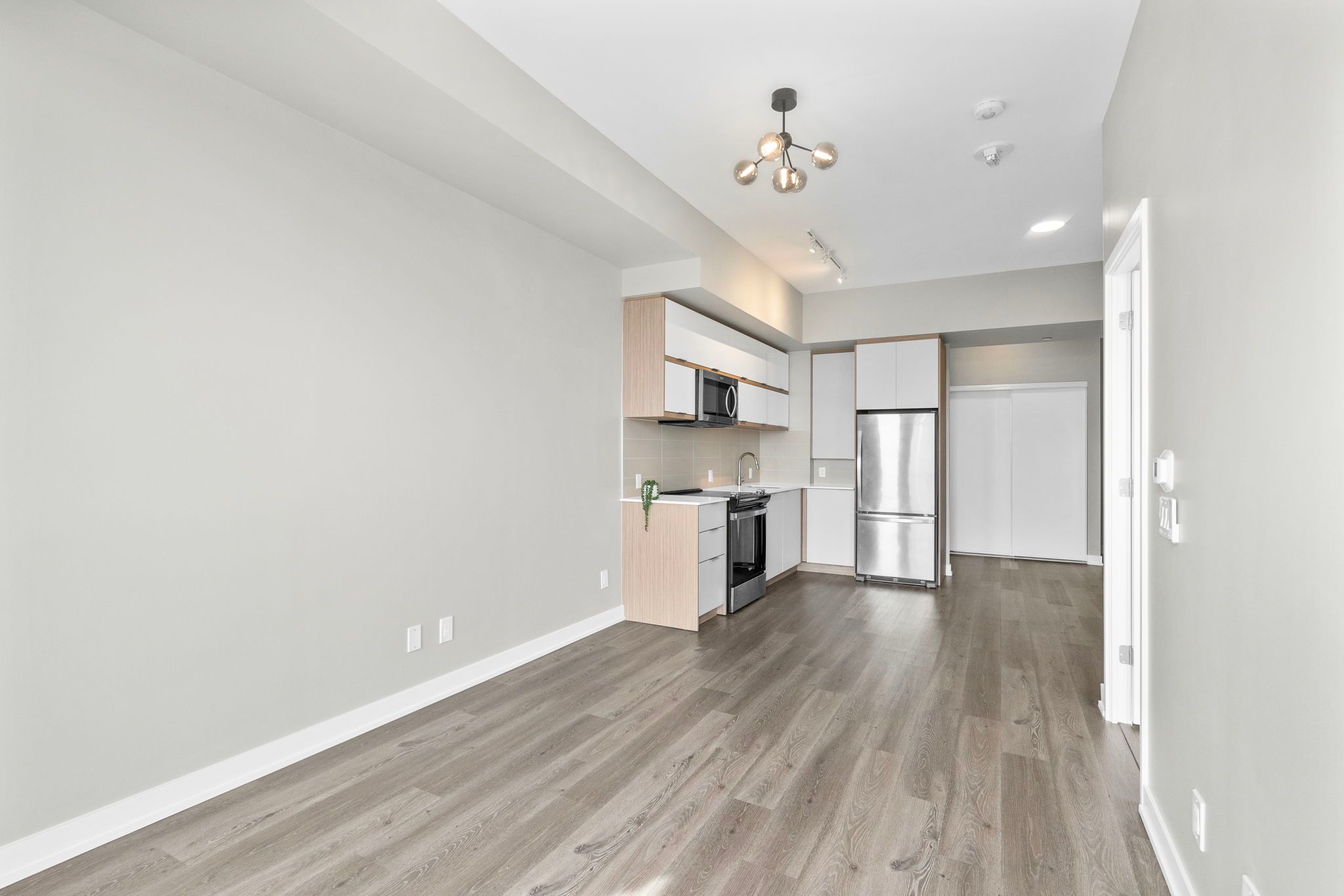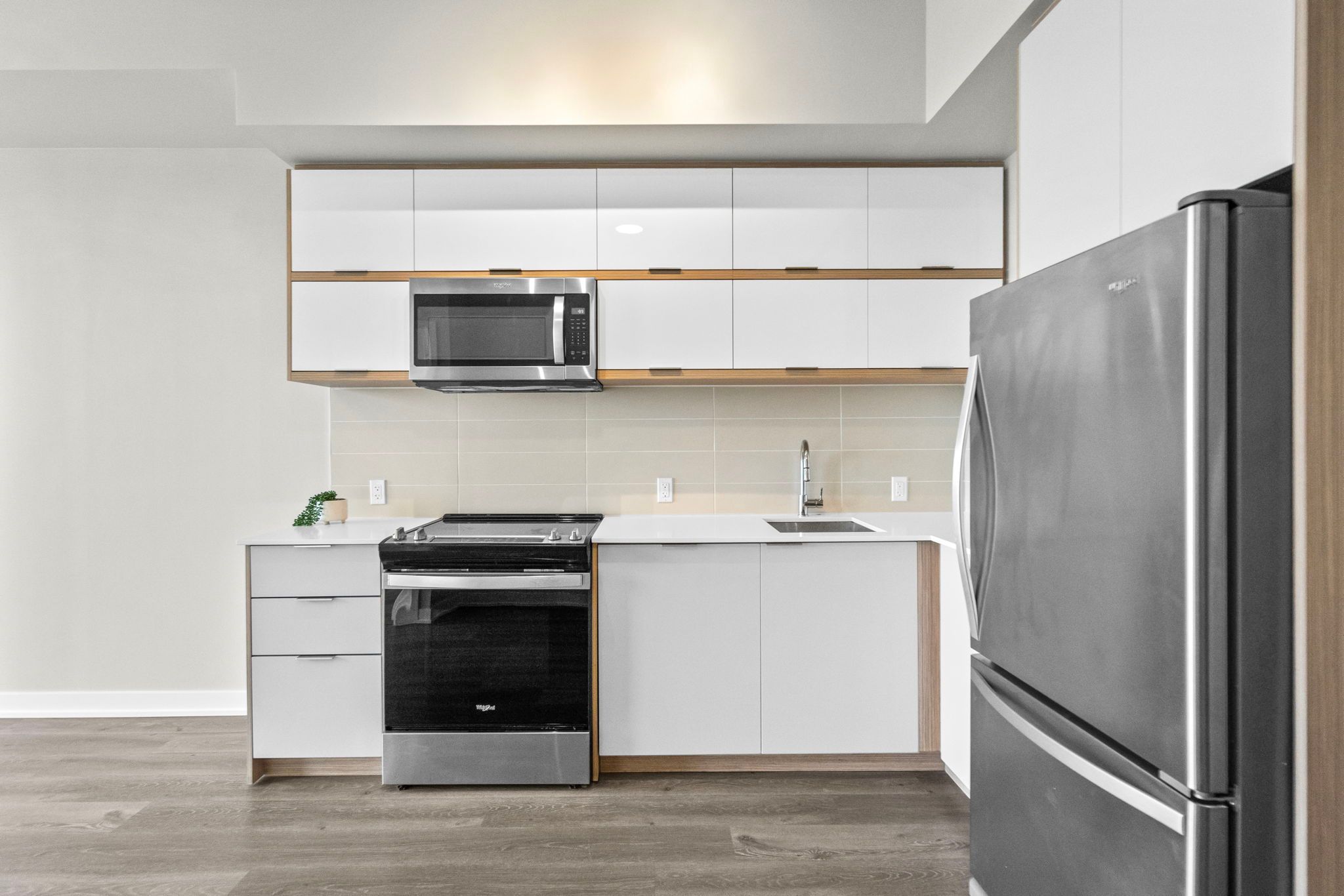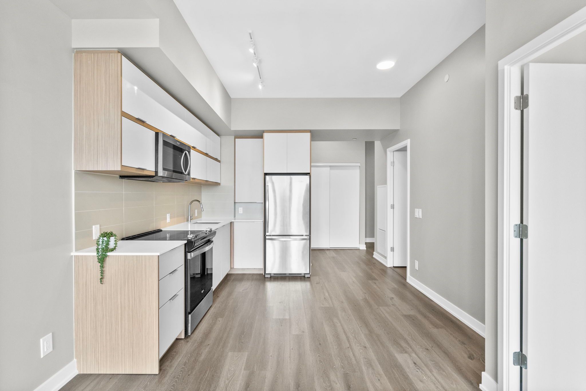 • Modern kitchen features stainless steel appliances and quartz countertops.