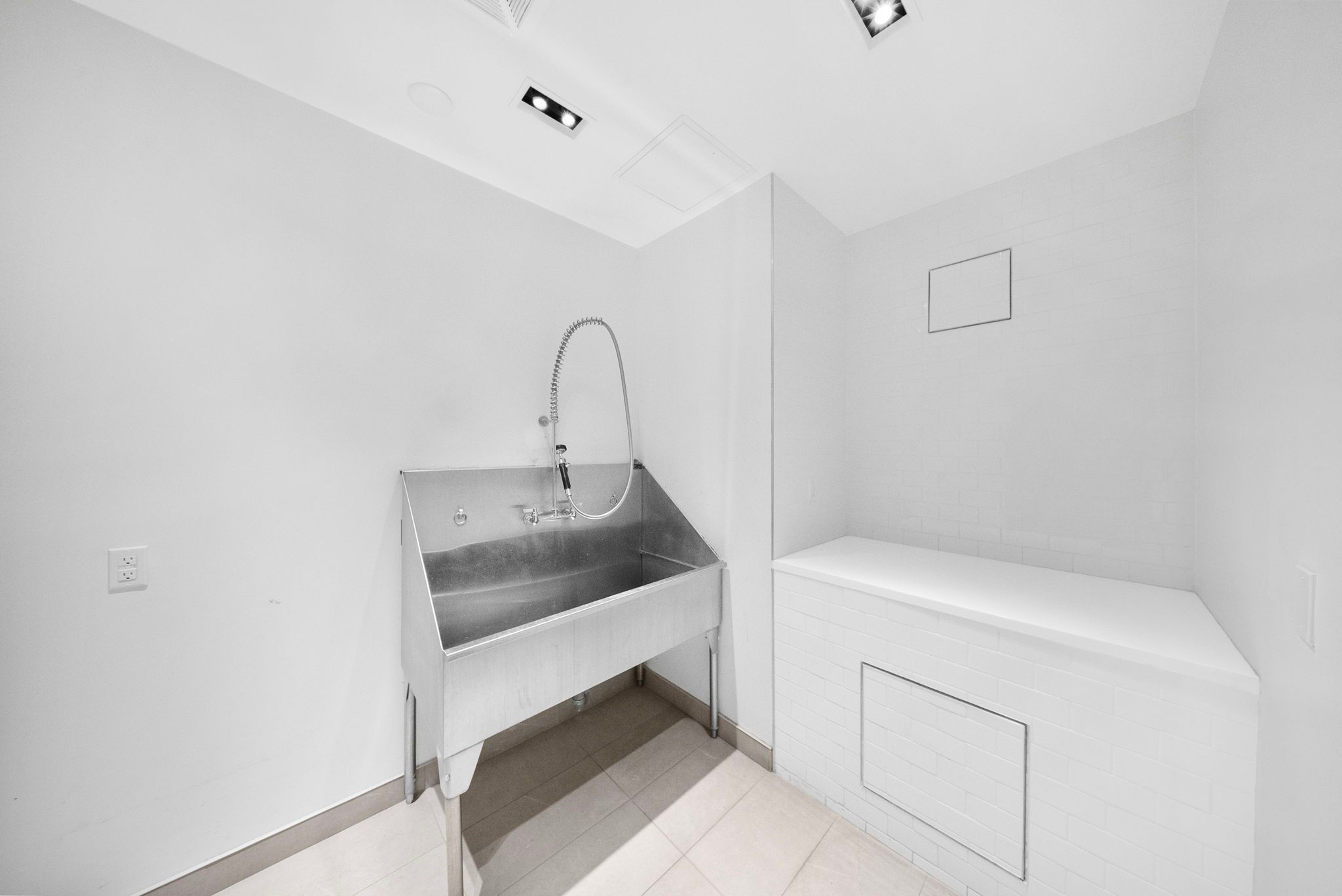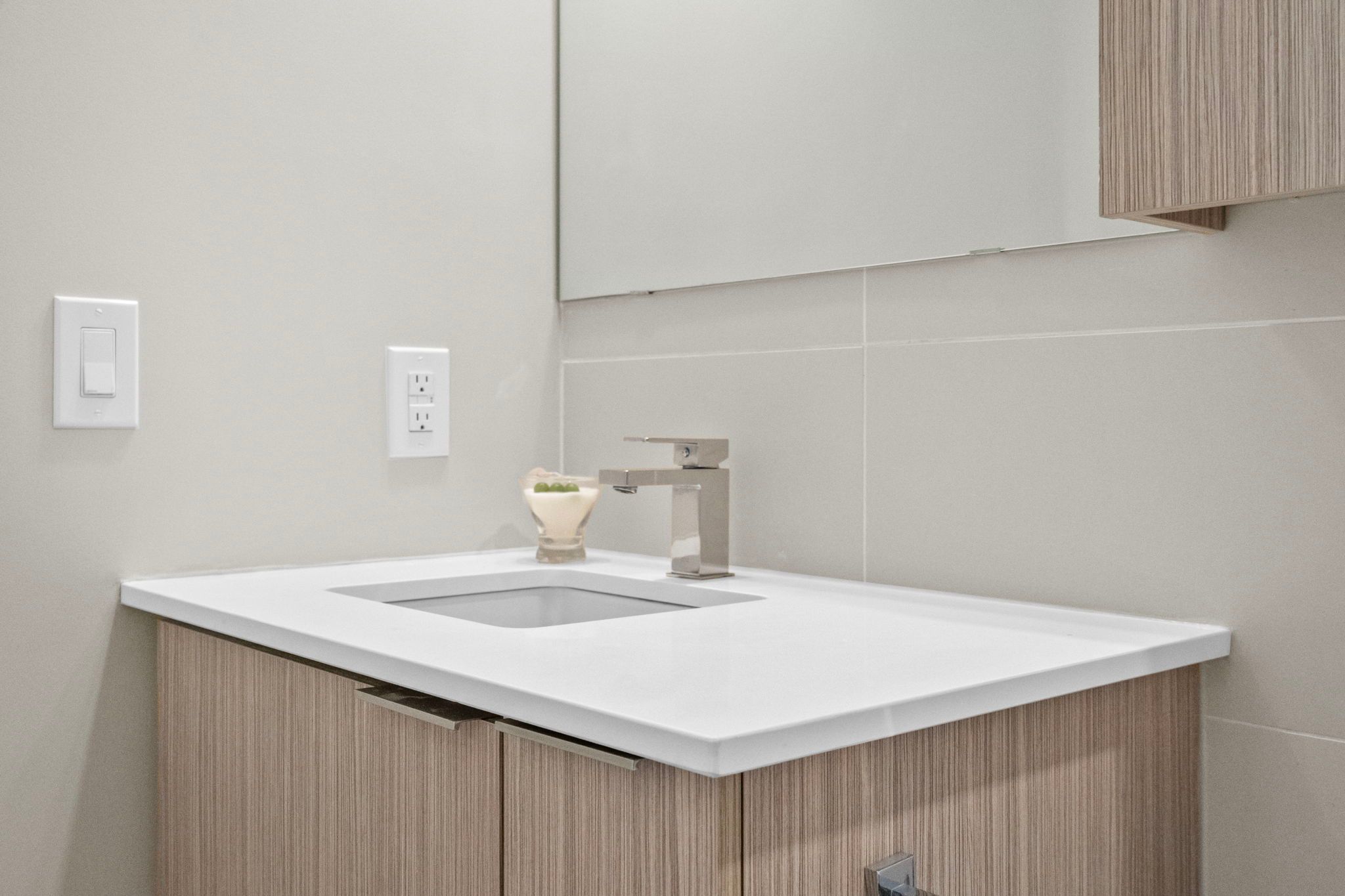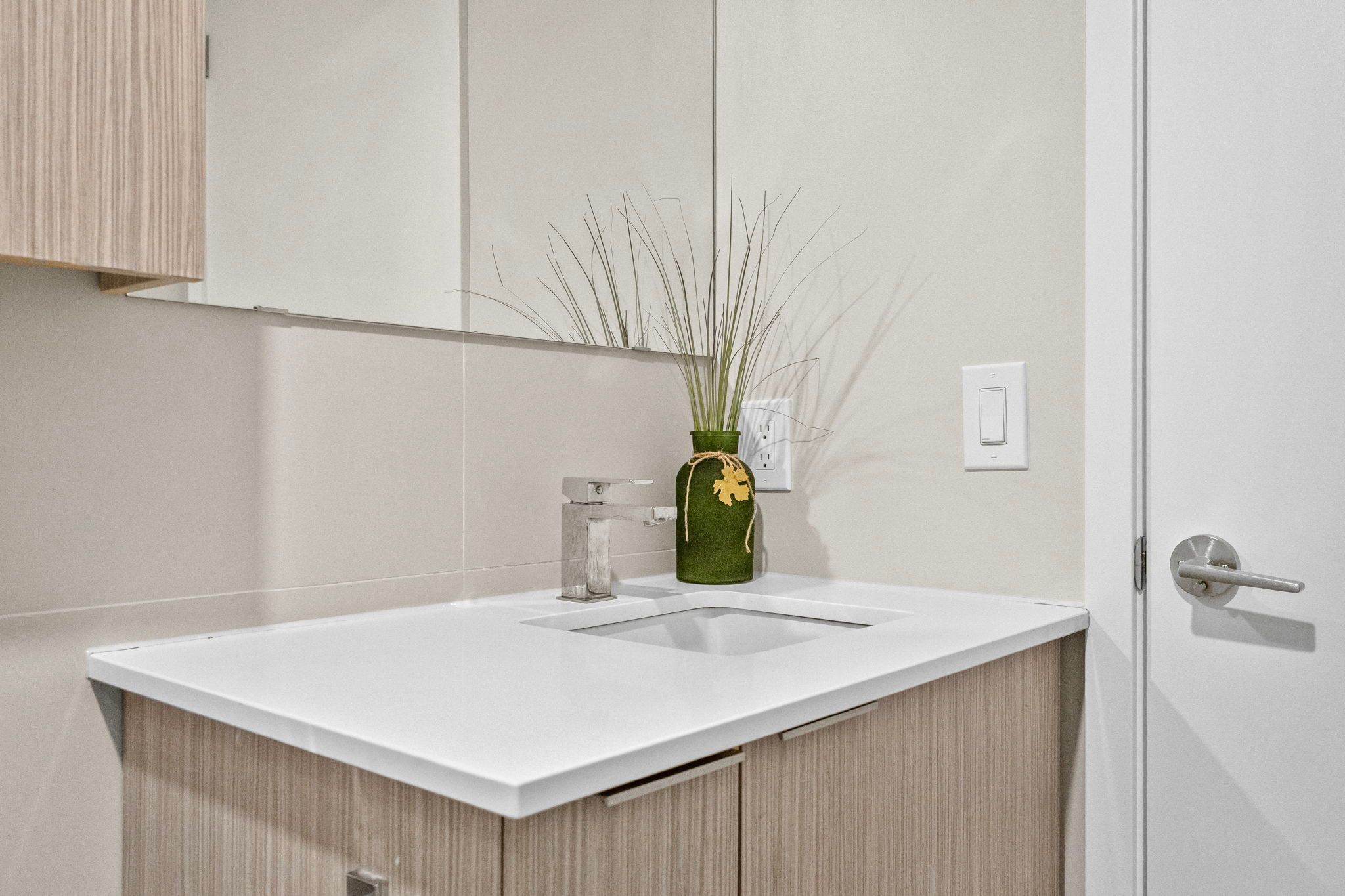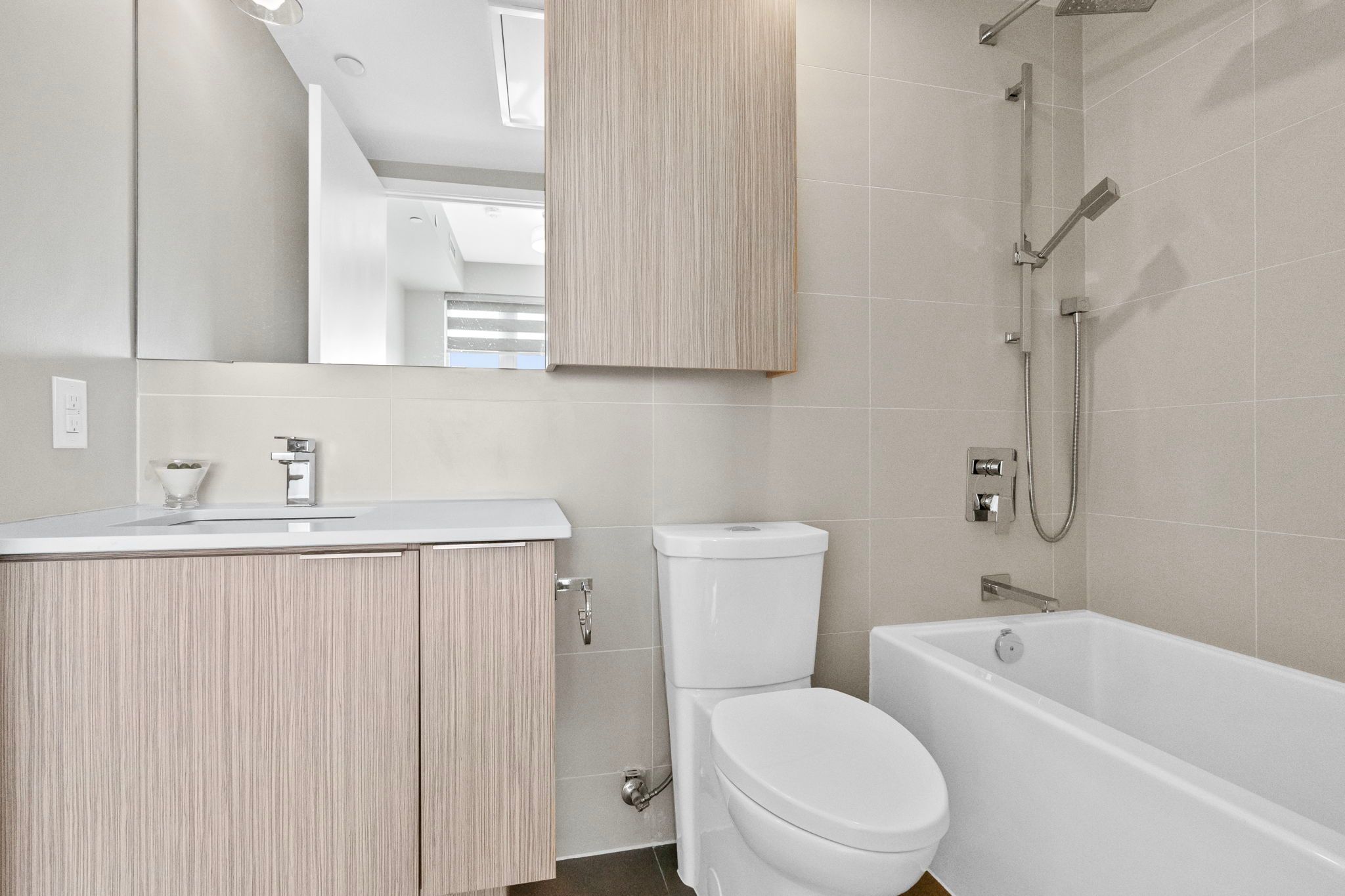 • Modern kitchen features stainless steel appliances and quartz countertops.