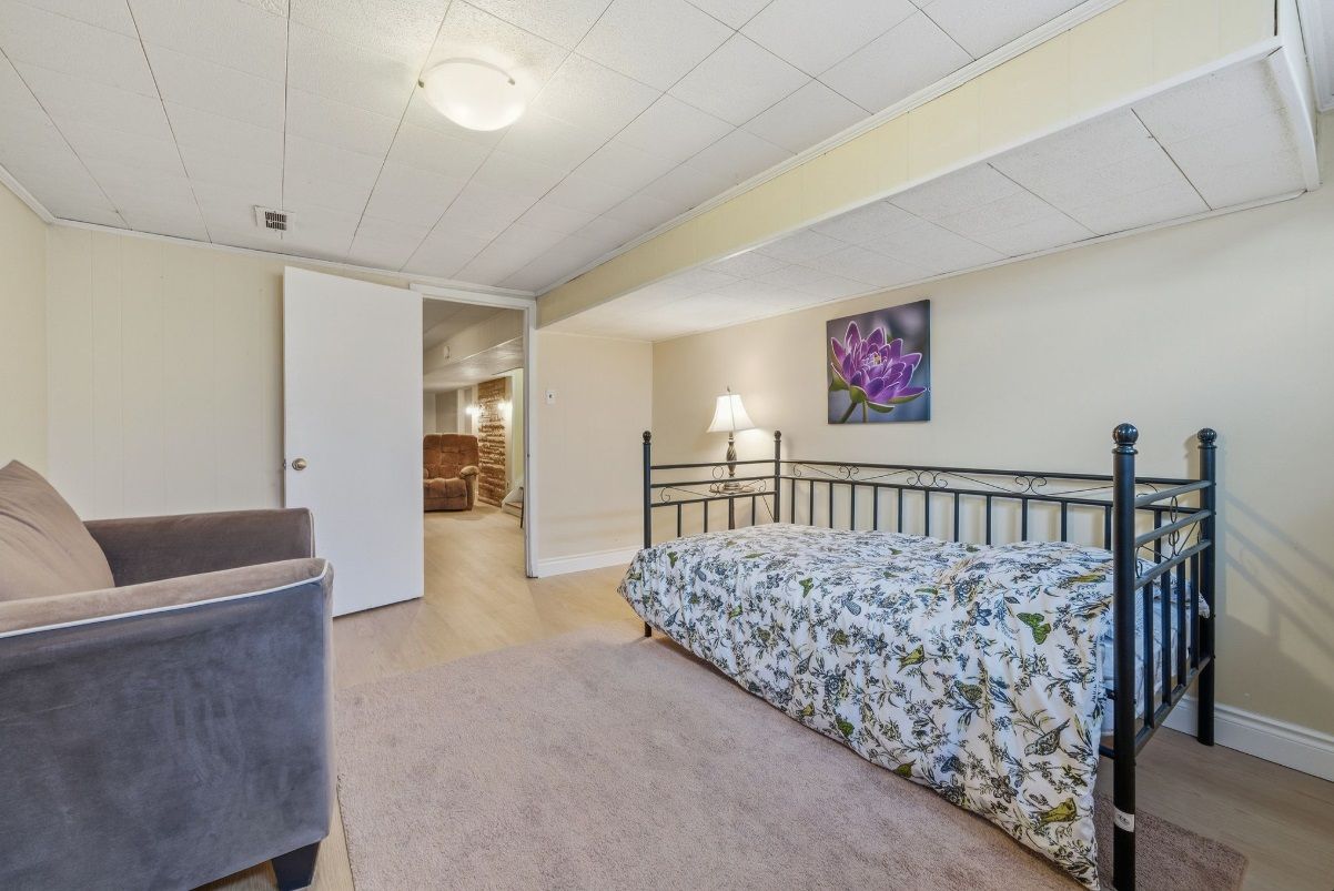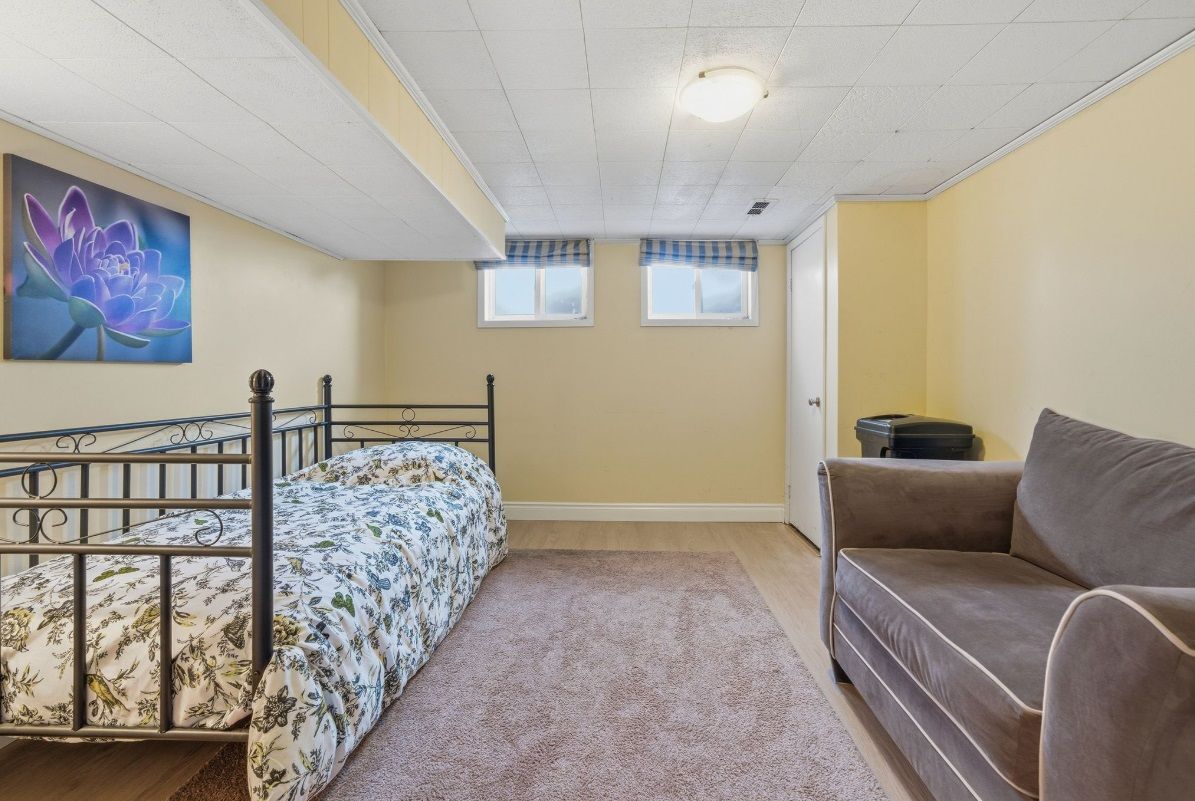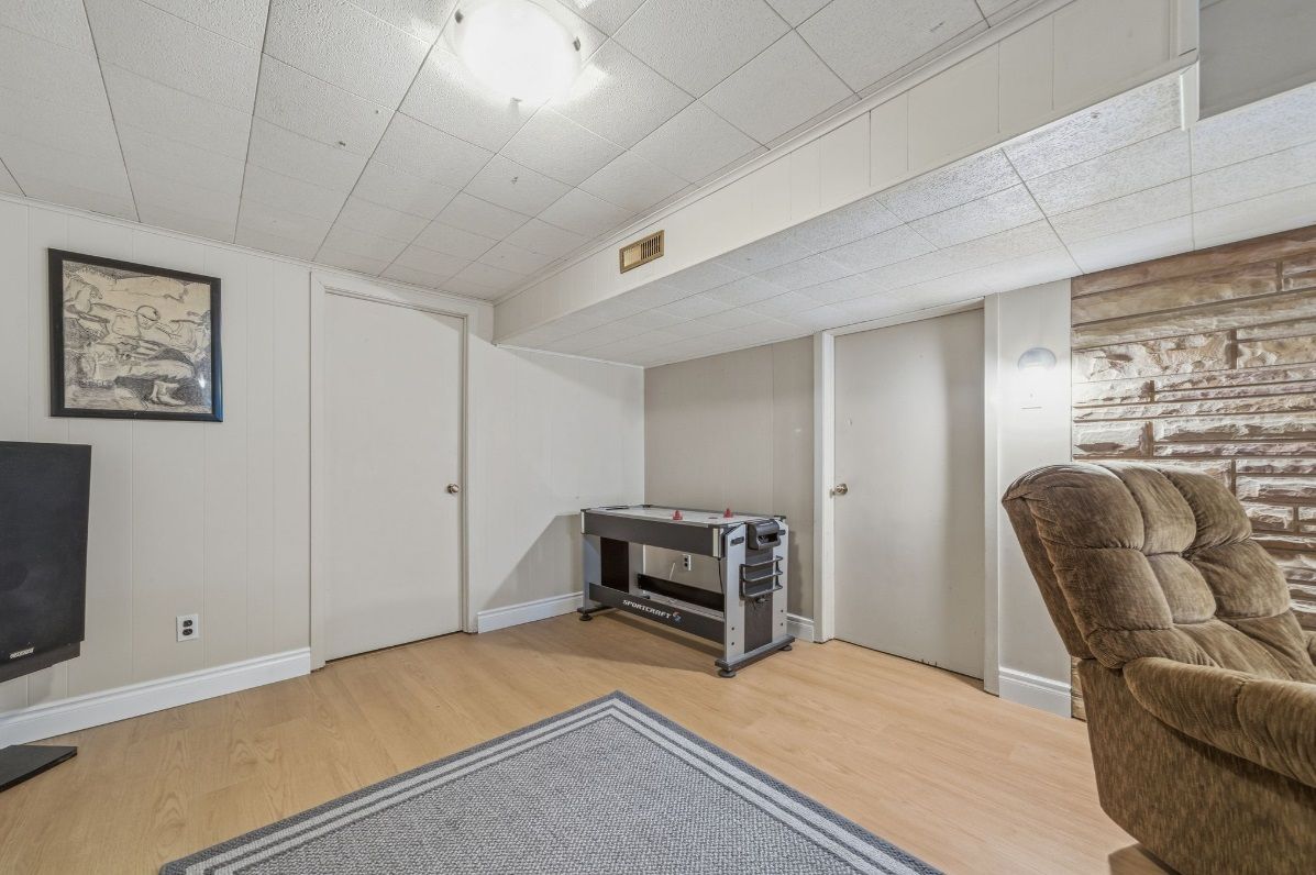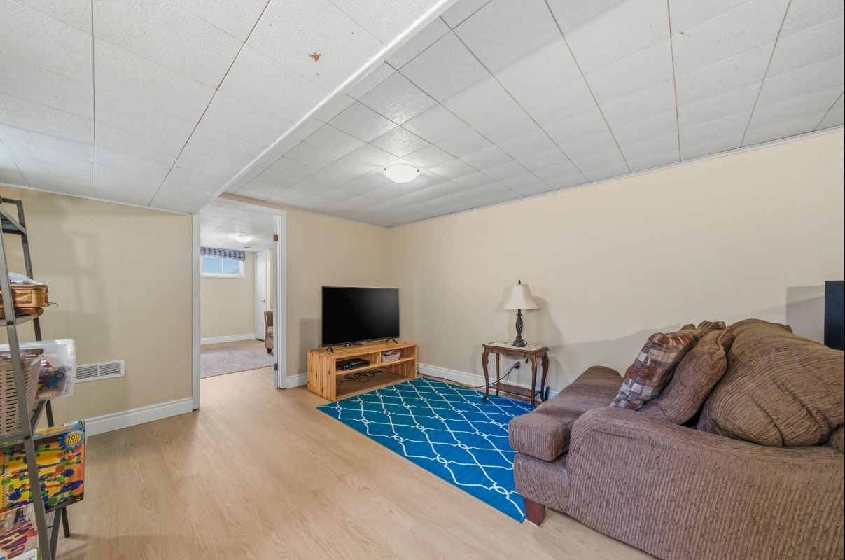 • Lower level includes a rec room, extra bedroom, and storage space.