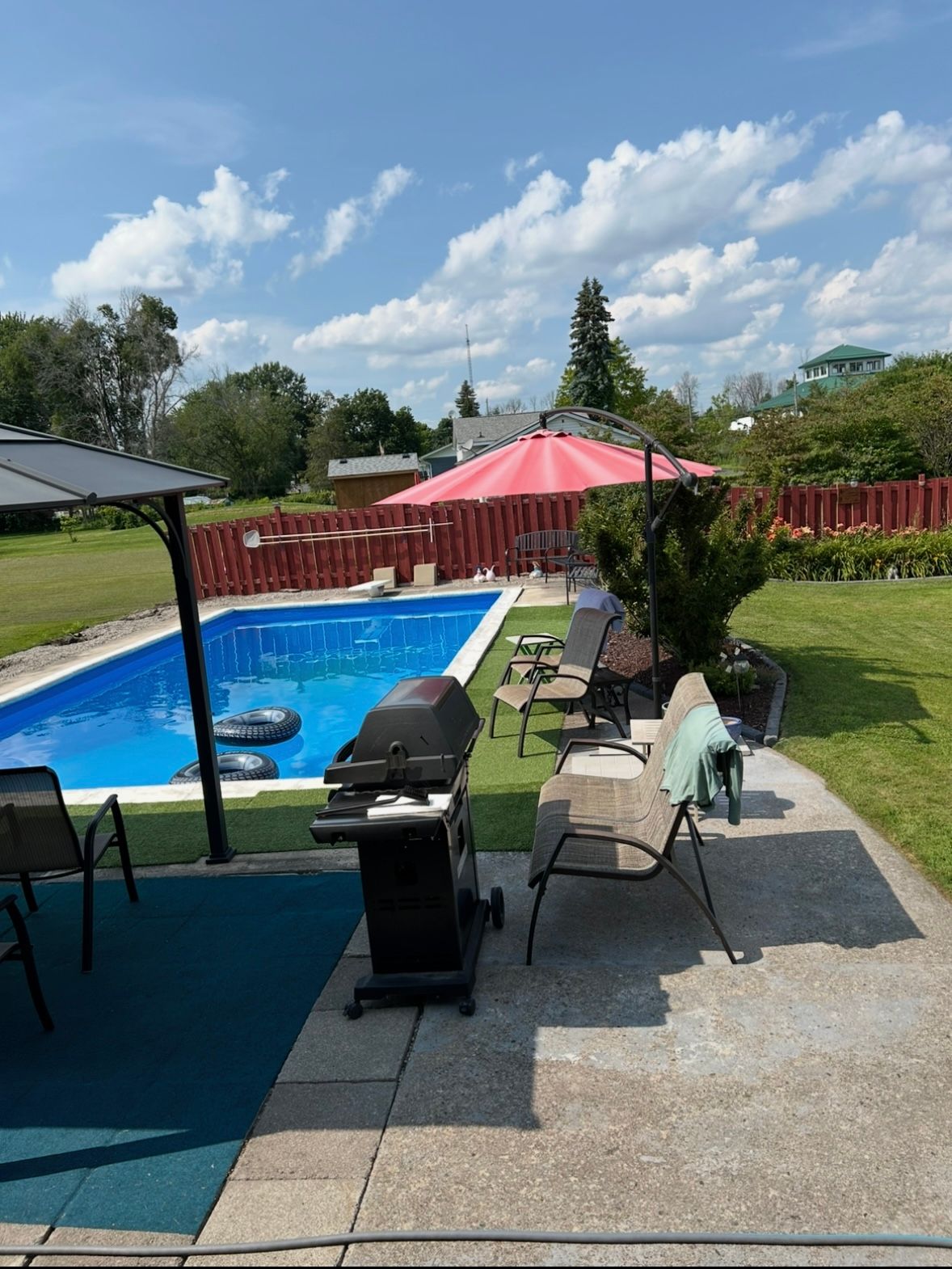 • Fenced backyard with a large inground pool, perfect for summer fun.