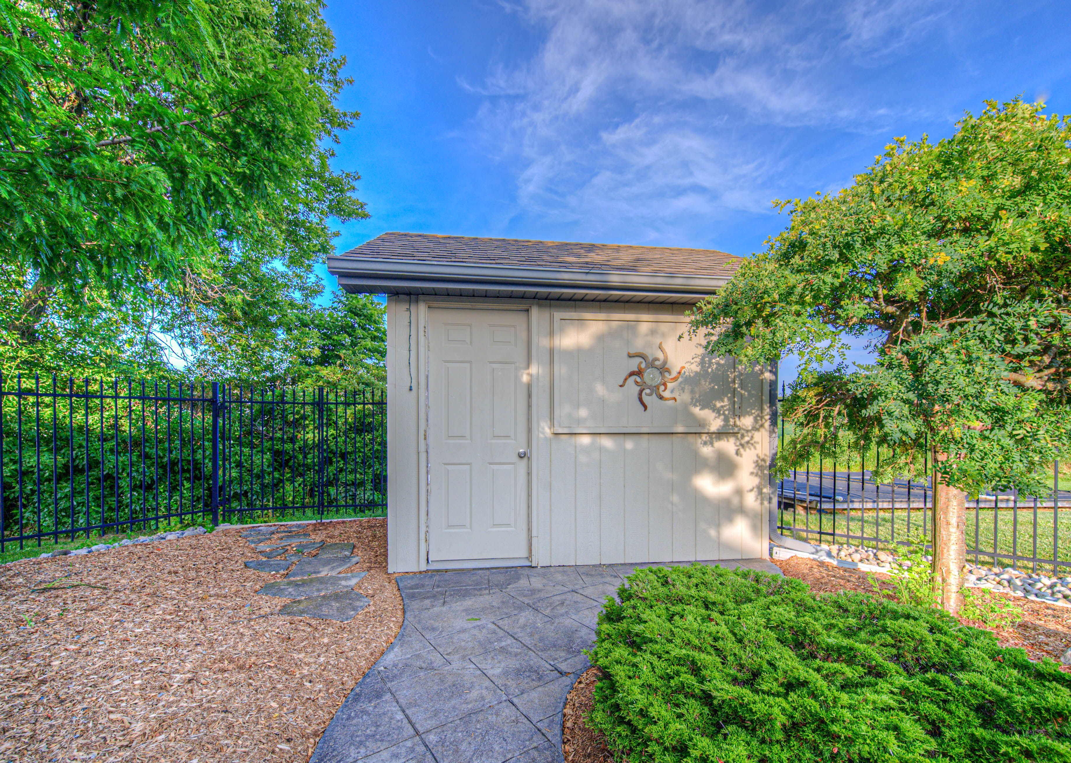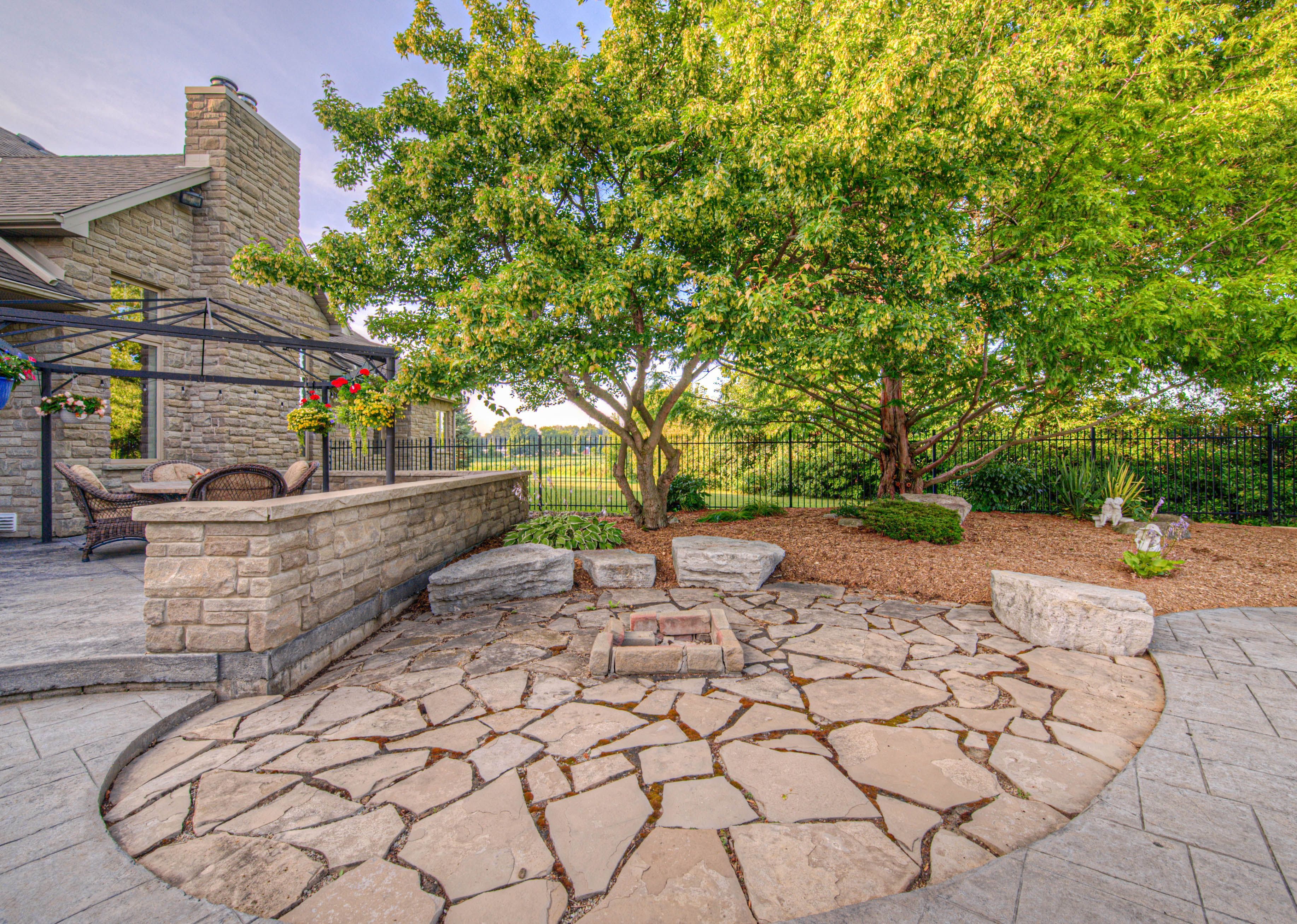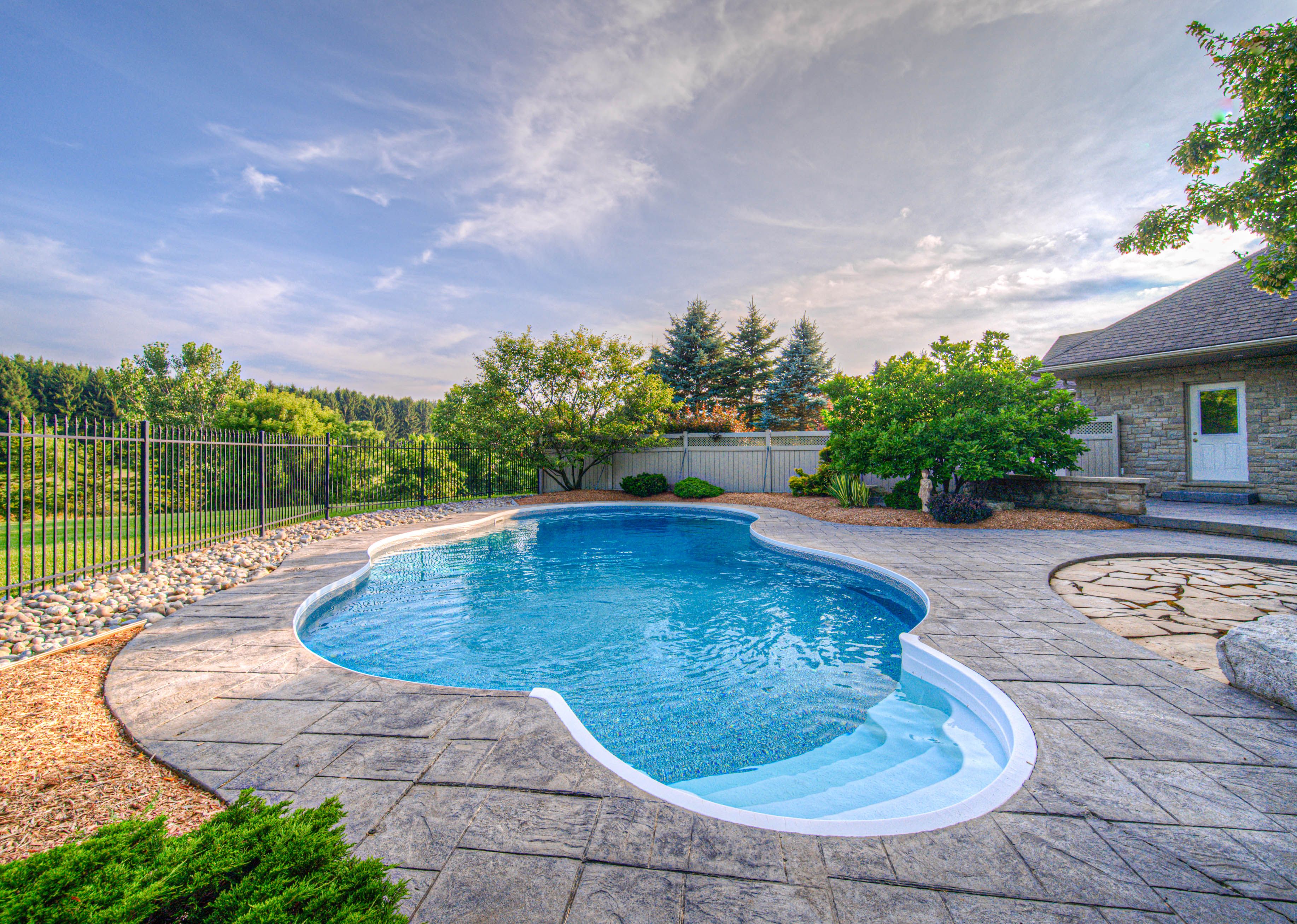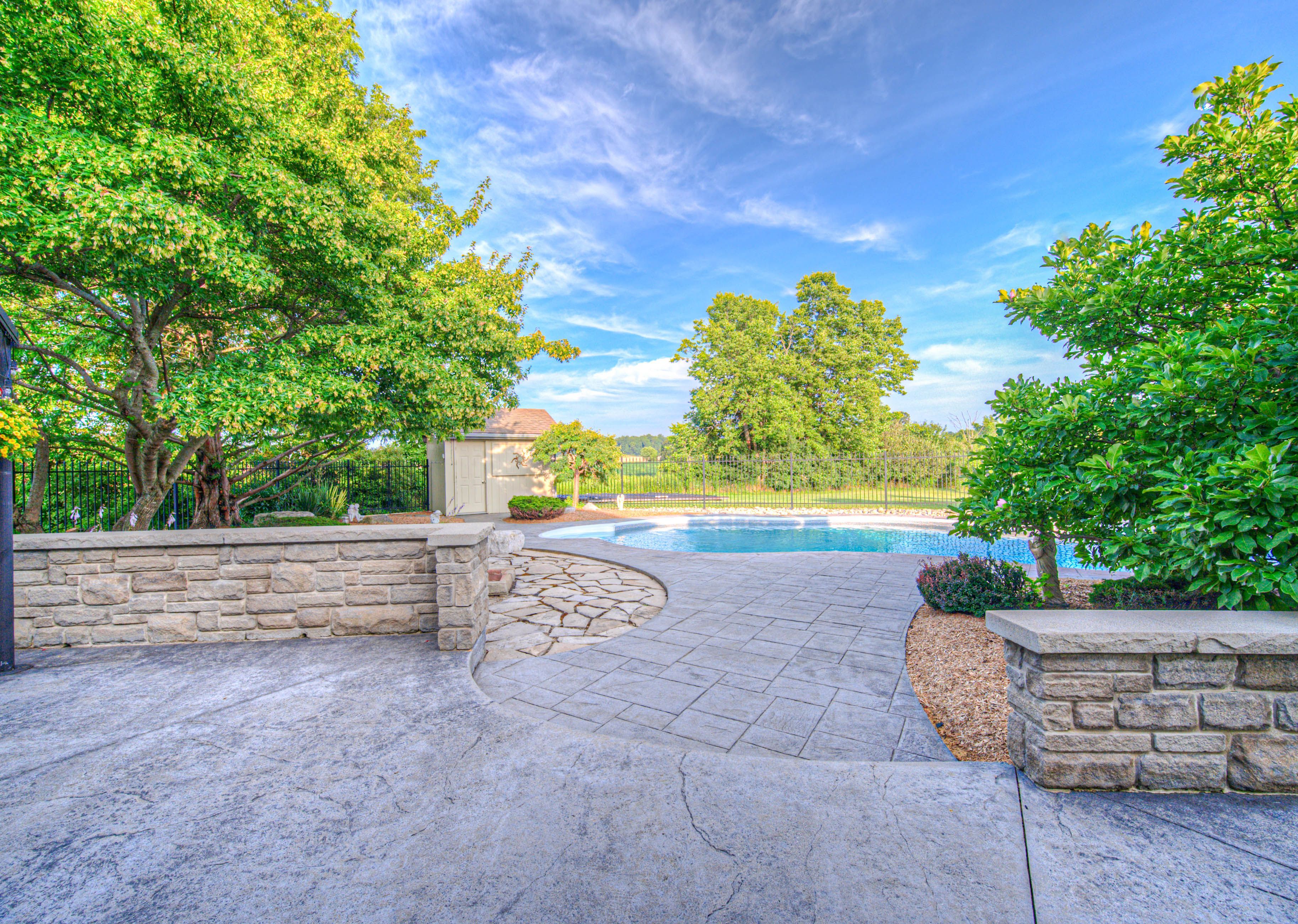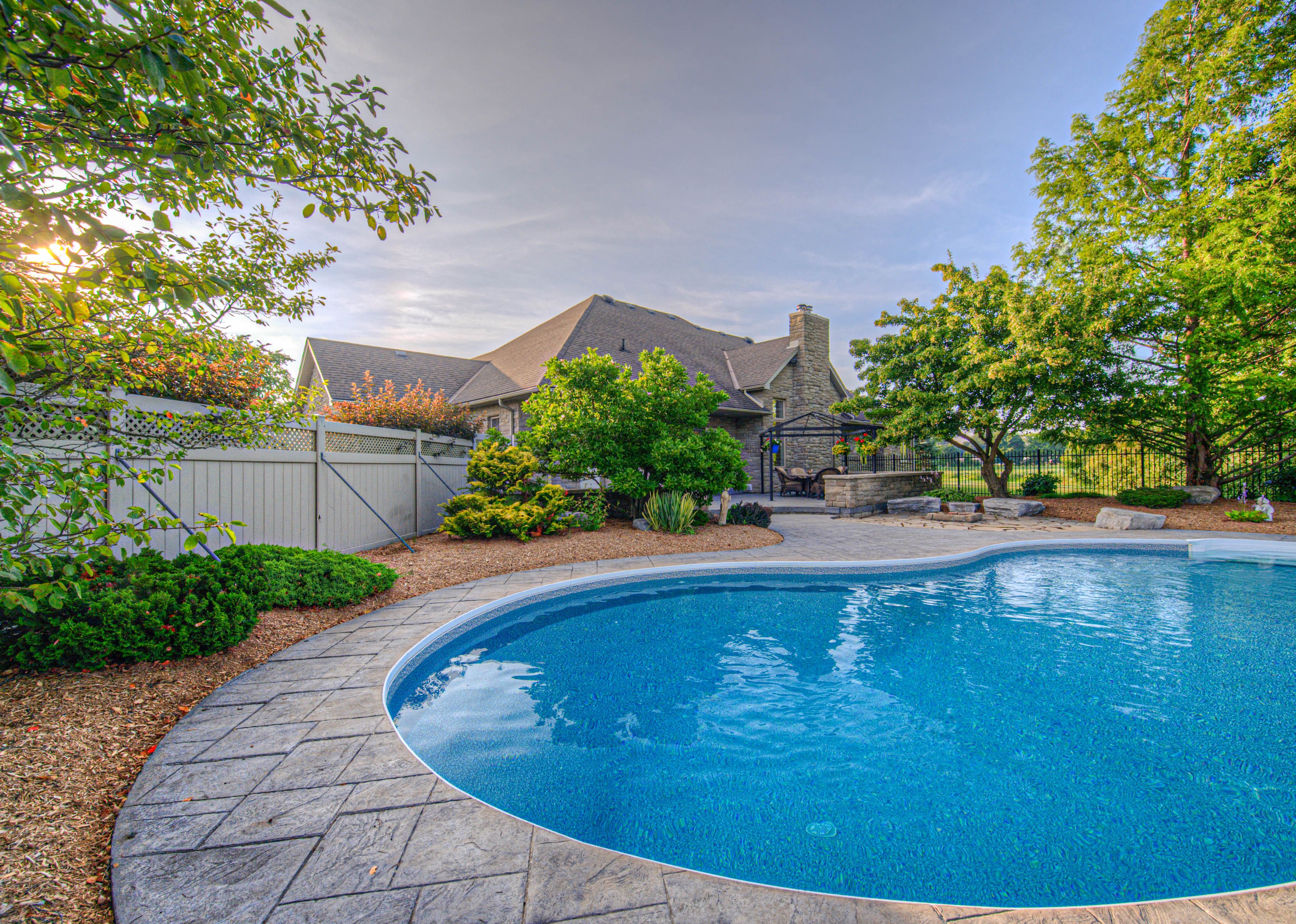 • In-ground pool surrounded by mature landscaping and stamped concrete patio.