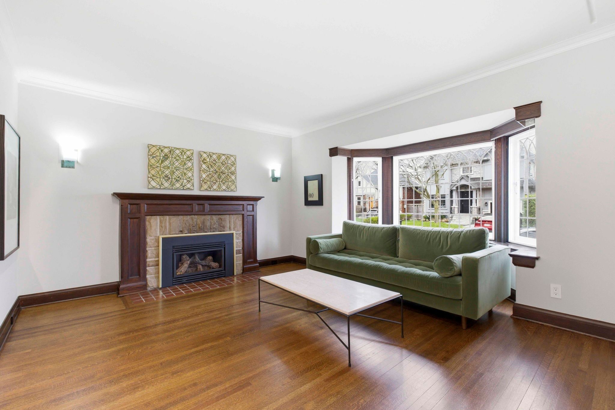 • Bright living room features a classic gas fireplace and hardwood floors.