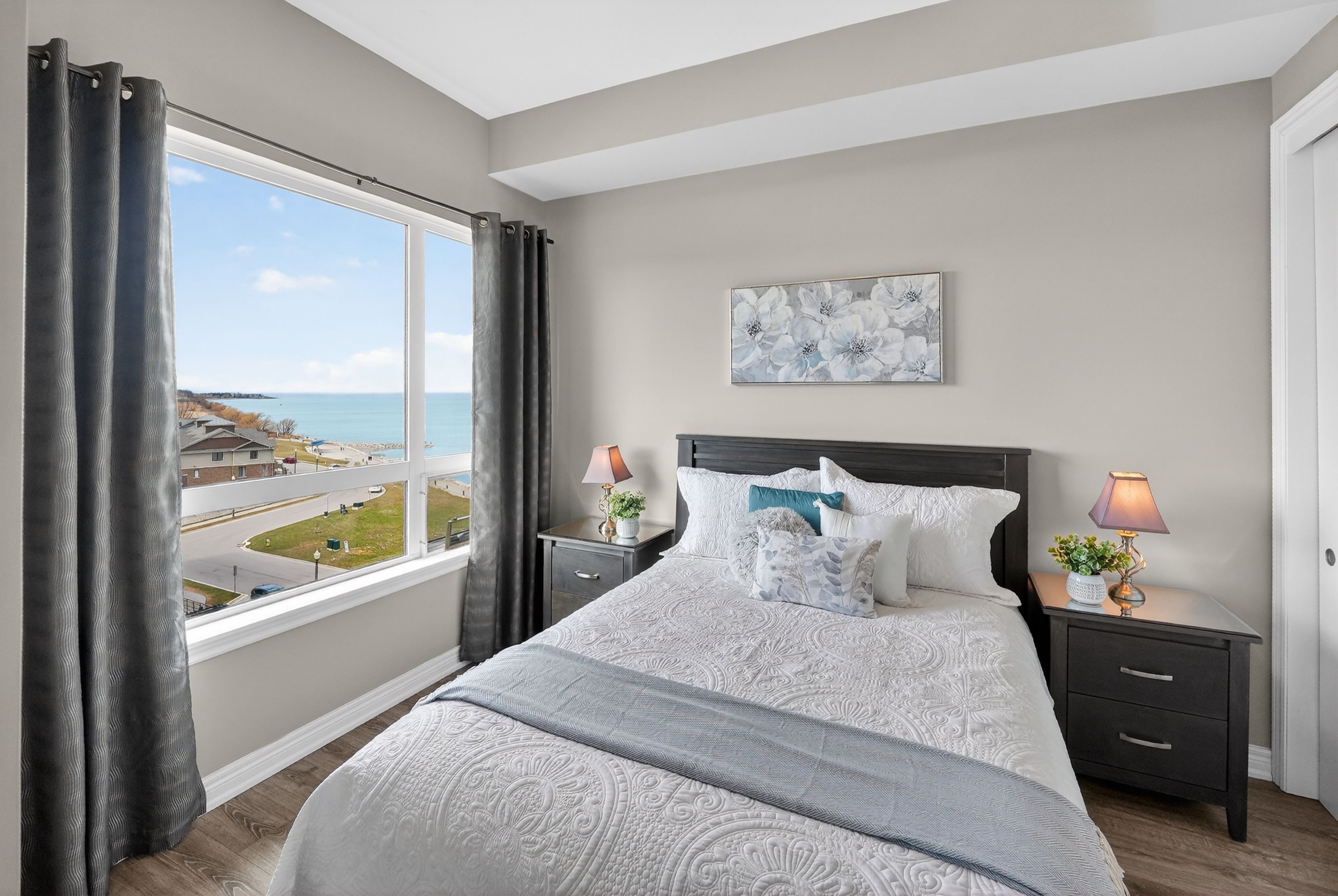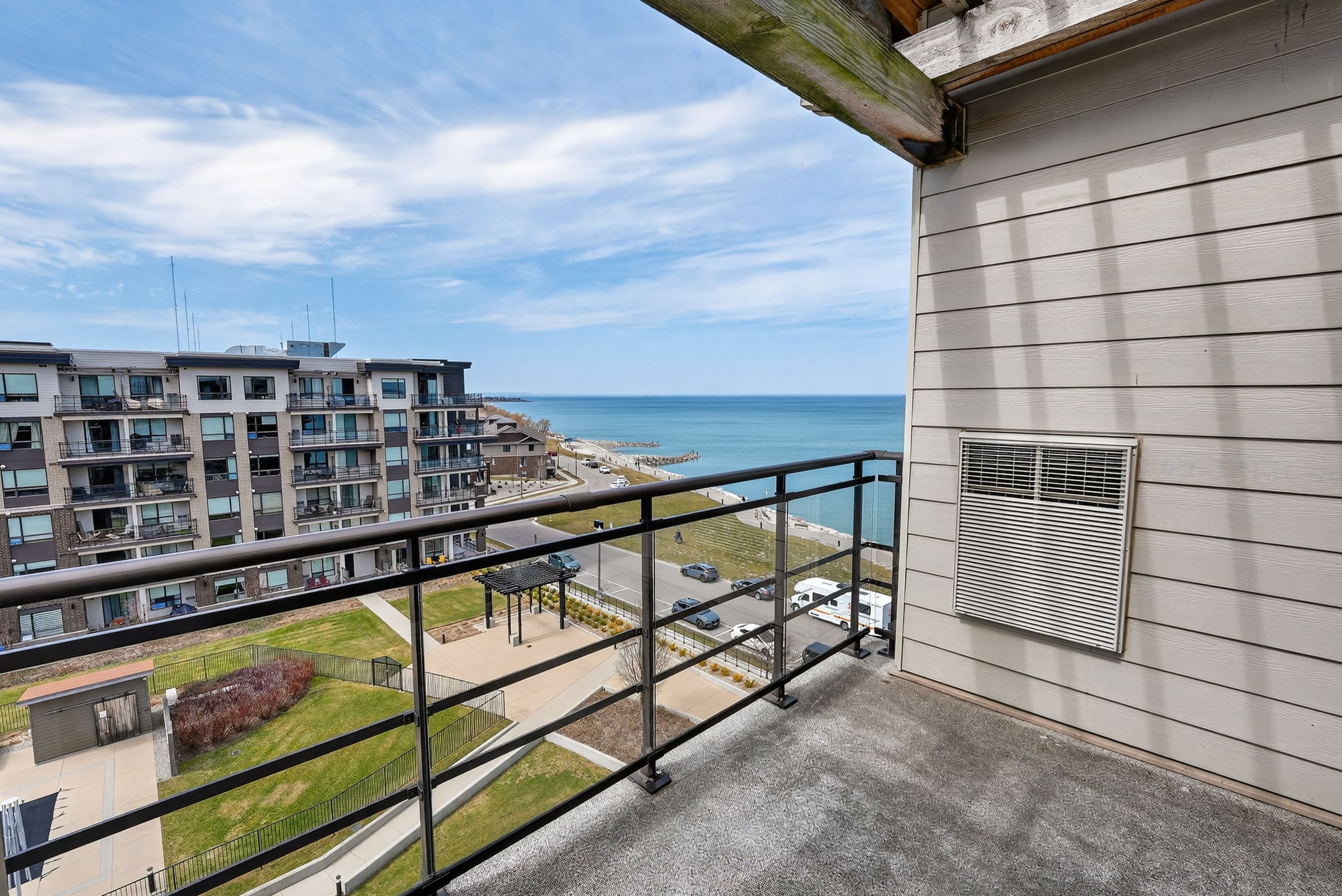 Elegant penthouse living ... Perched on the top floor, this stunning lakeside condo at 602-10 esplanade place captures the essence of effortless, carefree, waterfront living in the heart of grimsby. With 10' ceilings and an abundance of natural light, this thoughtfully designed 1-bedroom plus den layout offers both comfort & style complemented by a 65 sq ft private balcony showcasing breathtaking pool & lake views. The open-concept living space is finished with sleek vinyl flooring and anchored by a modern kitchen featuring built-in appliances, quartz countertops, tile backsplash, under-cabinet lighting, and potlights - creating a clean, contemporary feel ideal for everyday living or entertaining. The spacious primary bedroom is complete with double closets and lake views, while the versatile den offers flexibility for a home office or guest space. Convenience is key with in-suite stackable laundry, a well-appointed 4-pc bath, and ample storage solutions including locker (#198) and dedicated underground bike storage. Parking is a breeze with an underground space (#128). Beyond the unit, residents enjoy access to a full suite of amenities, including a fitness centre, dog wash, party room, pool, plus visitor parking - enhancing the lifestyle experience this building has to offer. Set just steps from the waterfront, scenic trails, grimsby public beach, and a vibrant mix of boutique shops & restaurants, this location balances relaxation with everyday convenience. With highway access just one minute away, commuting is seamless while still enjoying the charm of lakeside living. A rare opportunity to own a penthouse-level suite in one of grimsby's most desirable waterfront communities. Click on multimedia for virtual tour, floor plans, drone photos & more.