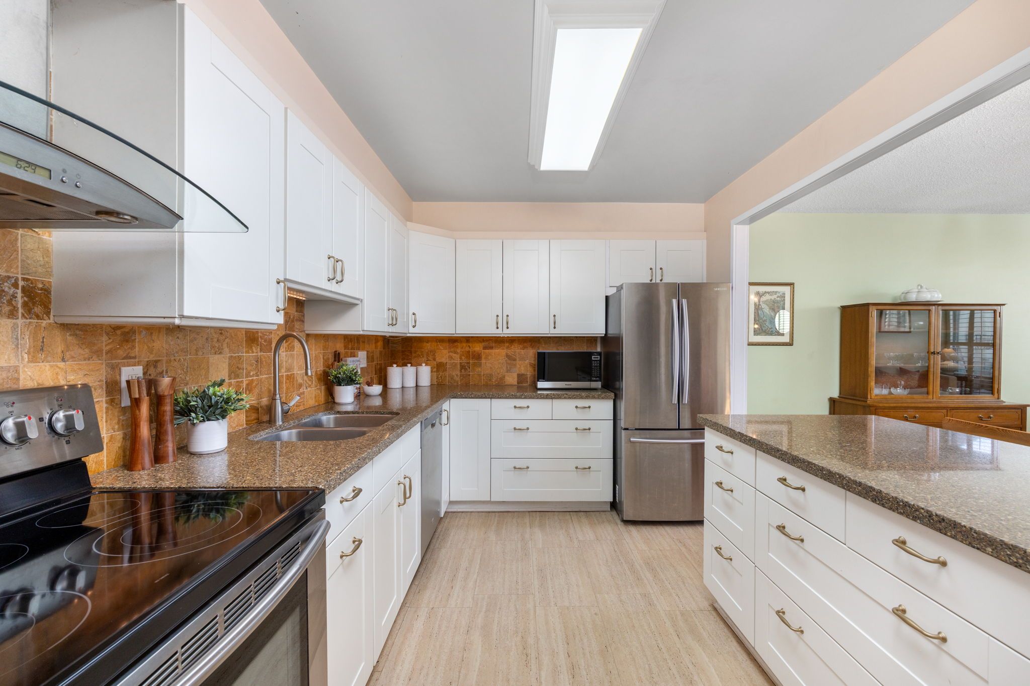 • Updated eat-in kitchen with breakfast bar and ample storage.