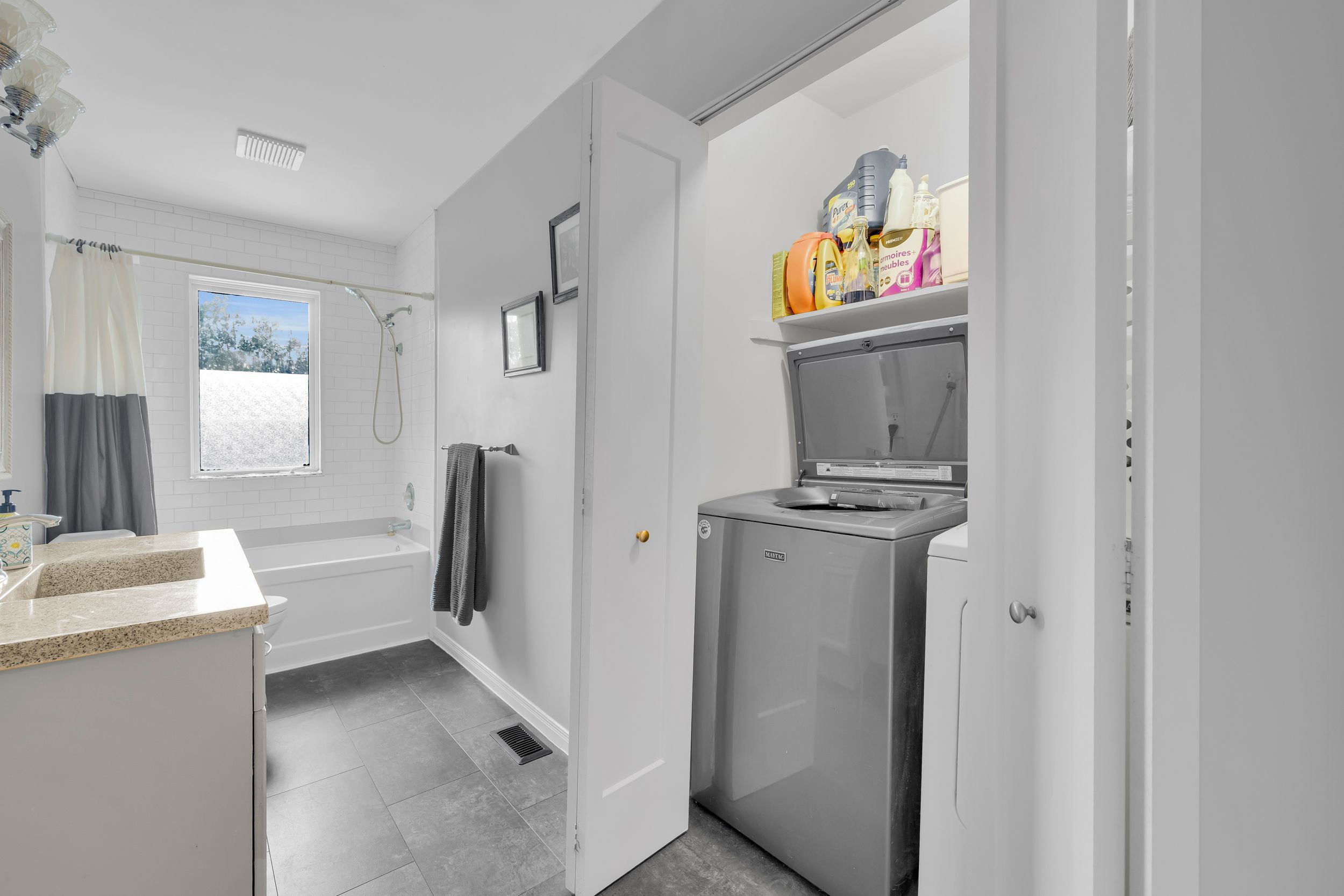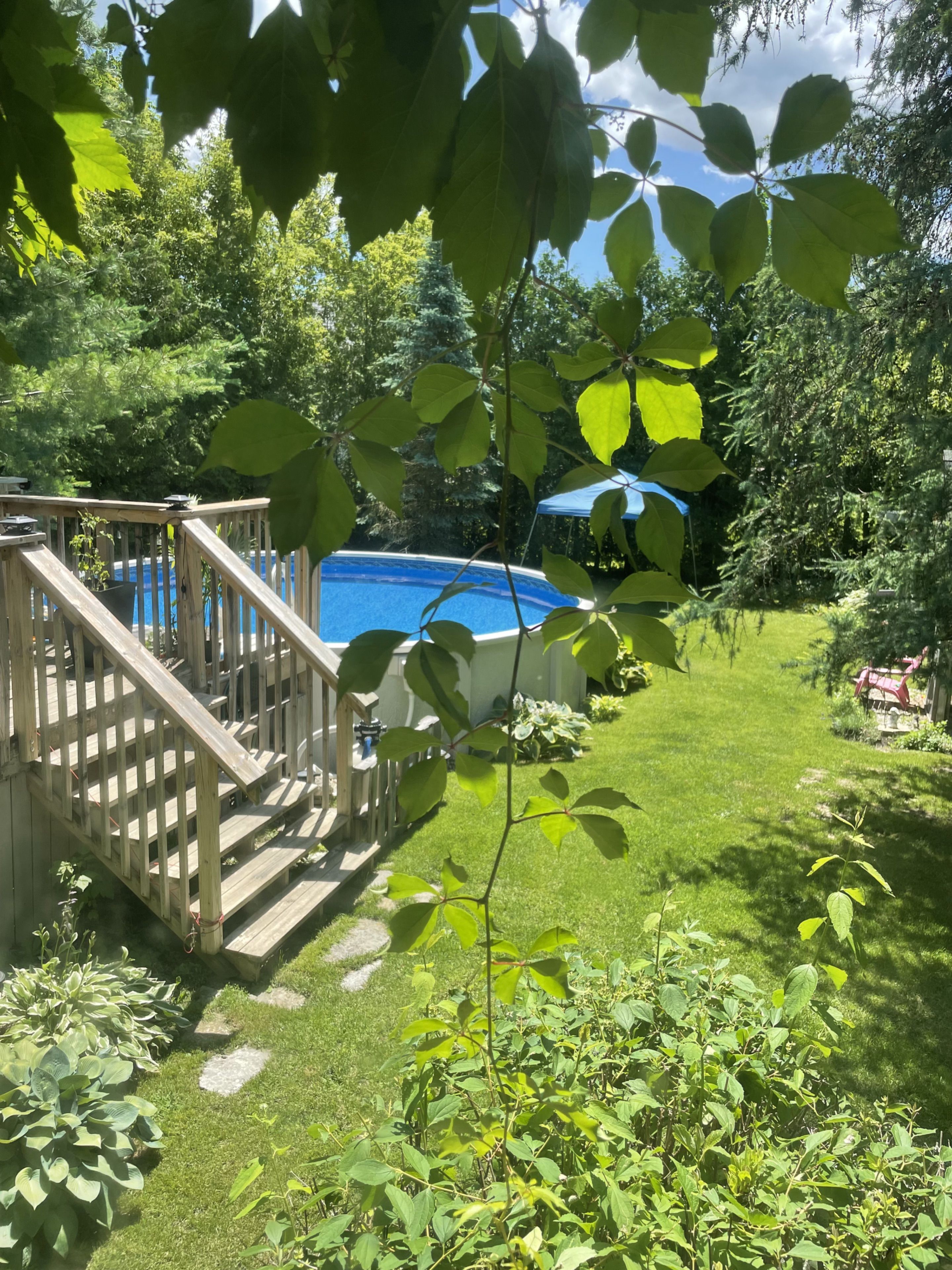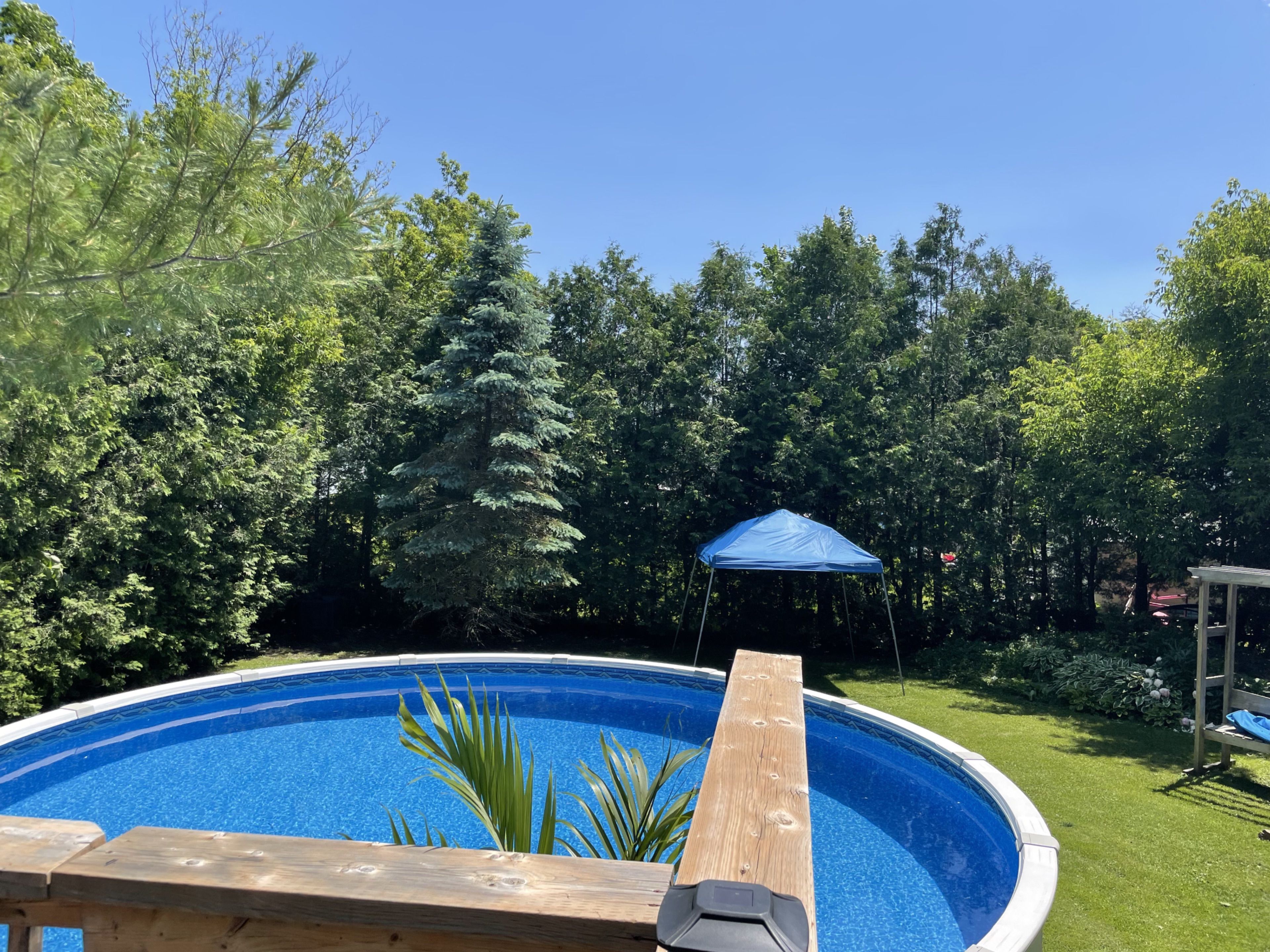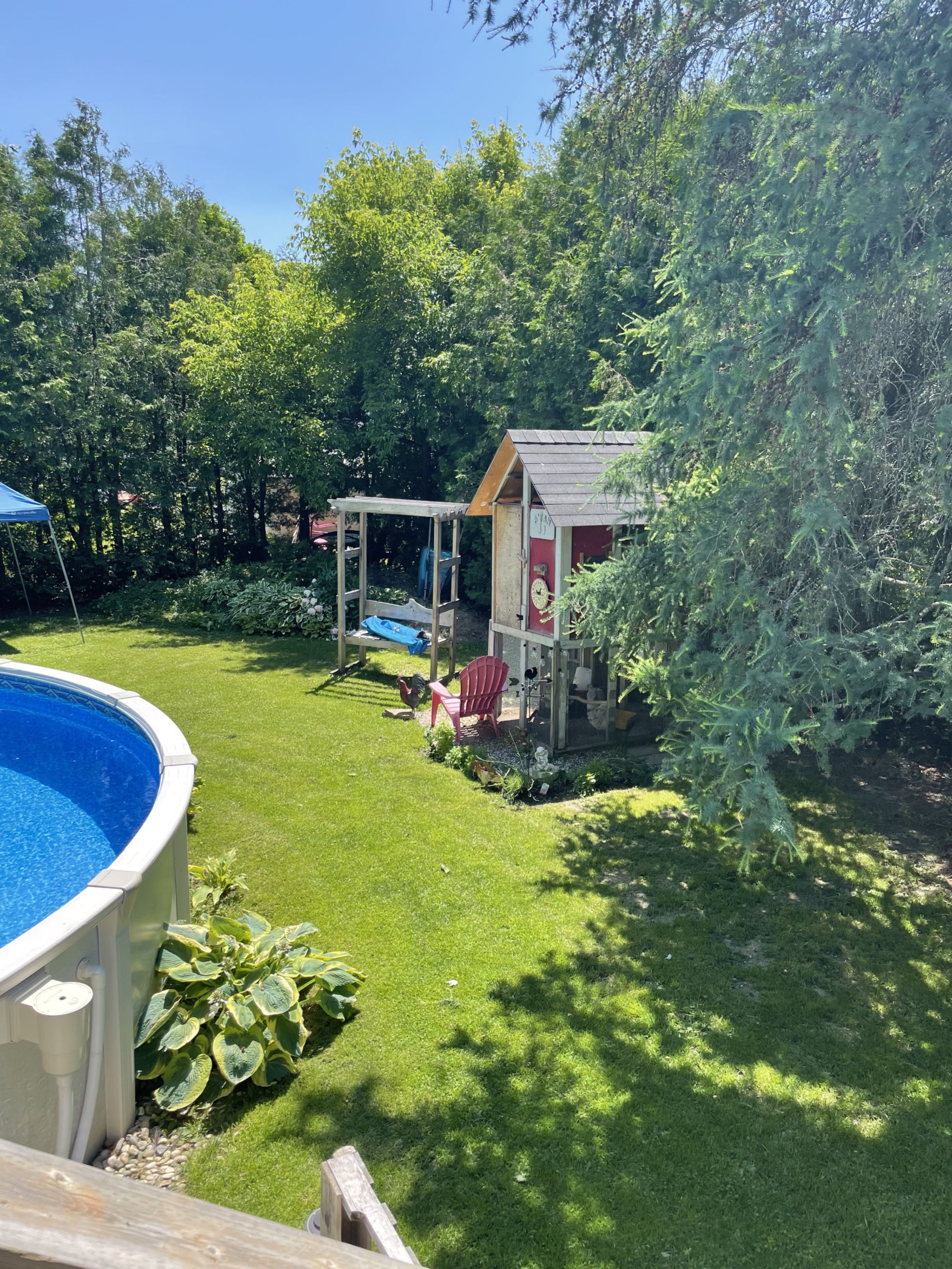 • Private backyard with tall trees, above-ground pool, and ample space.