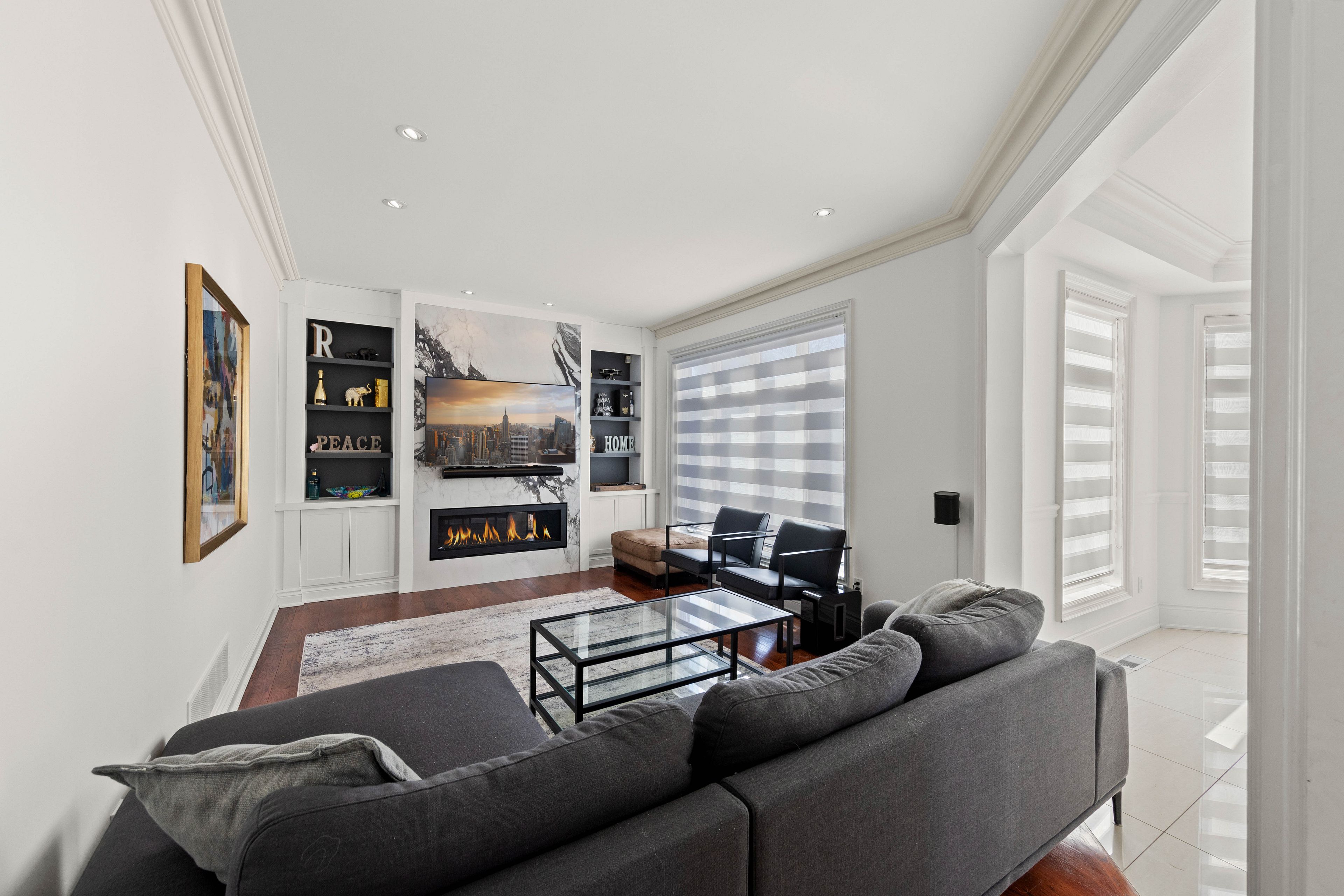 • Cozy family room with a gas fireplace and custom built-ins.