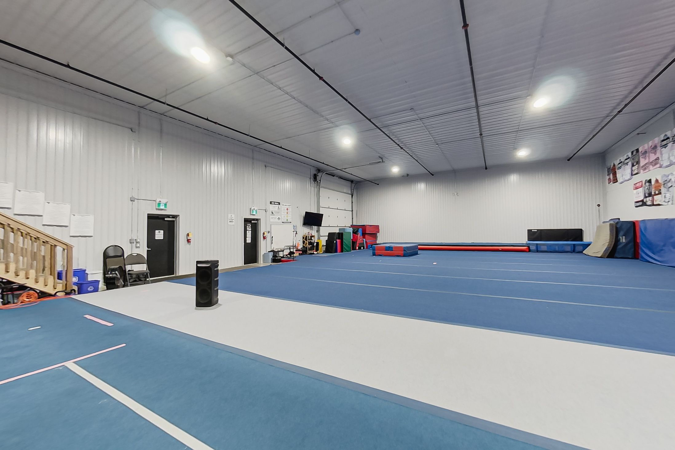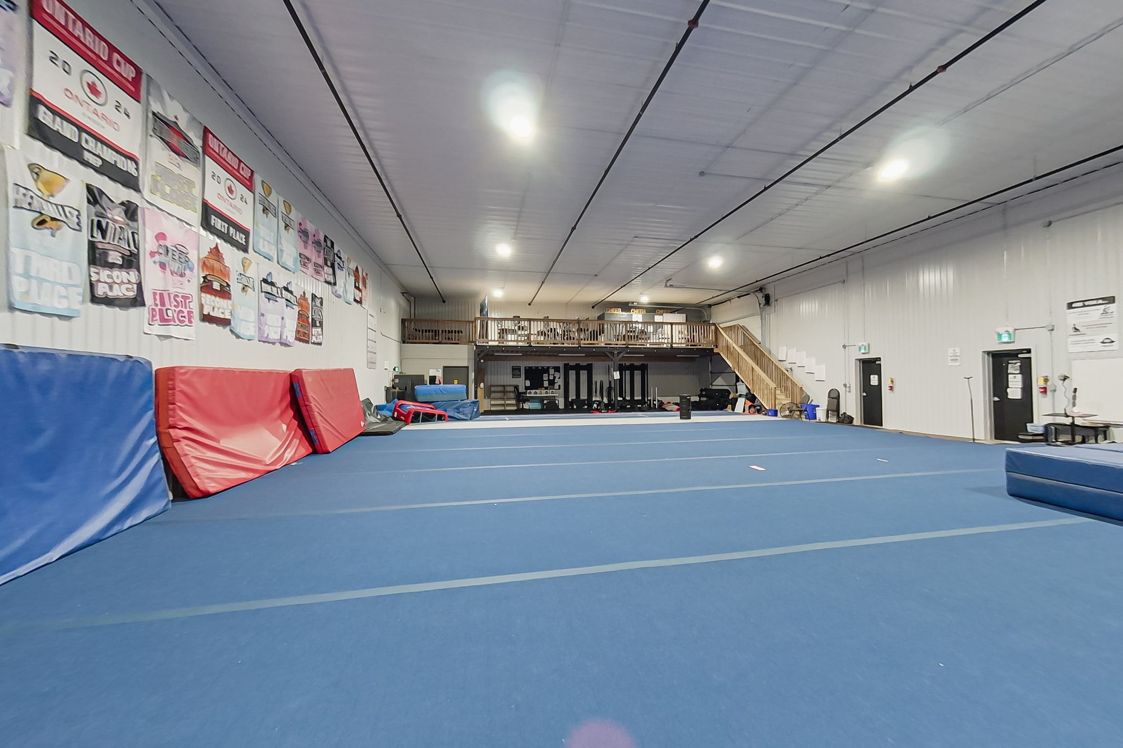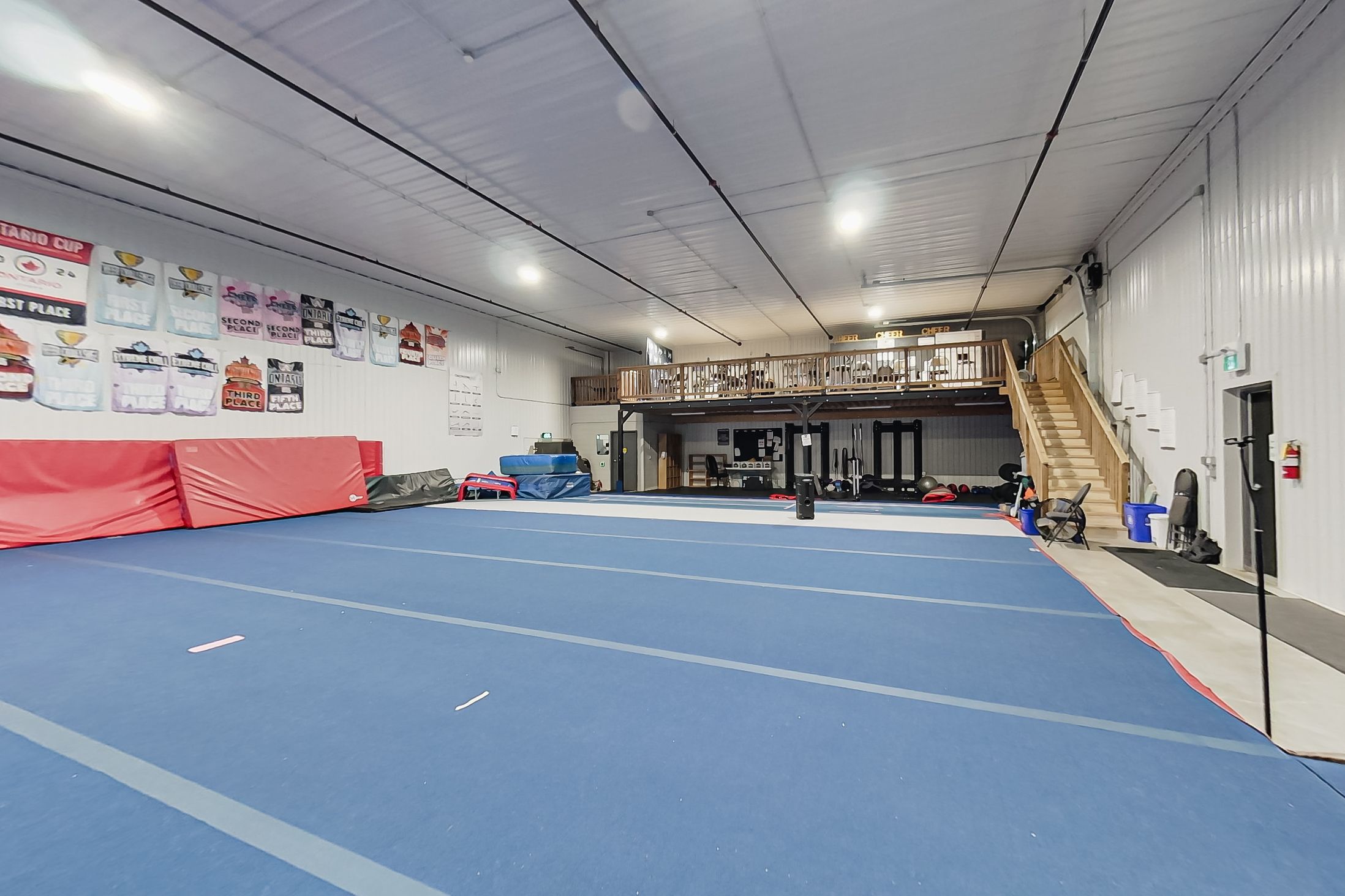 Available for lease from millgar developments, this premium industrial unit is ideally located on the highly sought-after greco court, just off mountain road in collingwood, offering excellent accessibility and professional appeal for a wide range of permitted uses under flexible m5 zoning. The unit features 4,191. 81 square feet of main-floor industrial space with 18-foot clear ceilings, two 14' x 14' drive-in bay doors, two man-door entrances, and energy-efficient in-floor heating. Currently configured as a large open-concept gymnasium, the main space remains largely untouched and ready to accommodate a variety of business visions. A functional layout supports efficient operations, while an additional 715. 19 square feet @18. 50 /sq ft on the second-level mezzanine offers versatile space suitable for a viewing area, office, or other business needs. Other available option is to take half the unit and owners would build division wall.