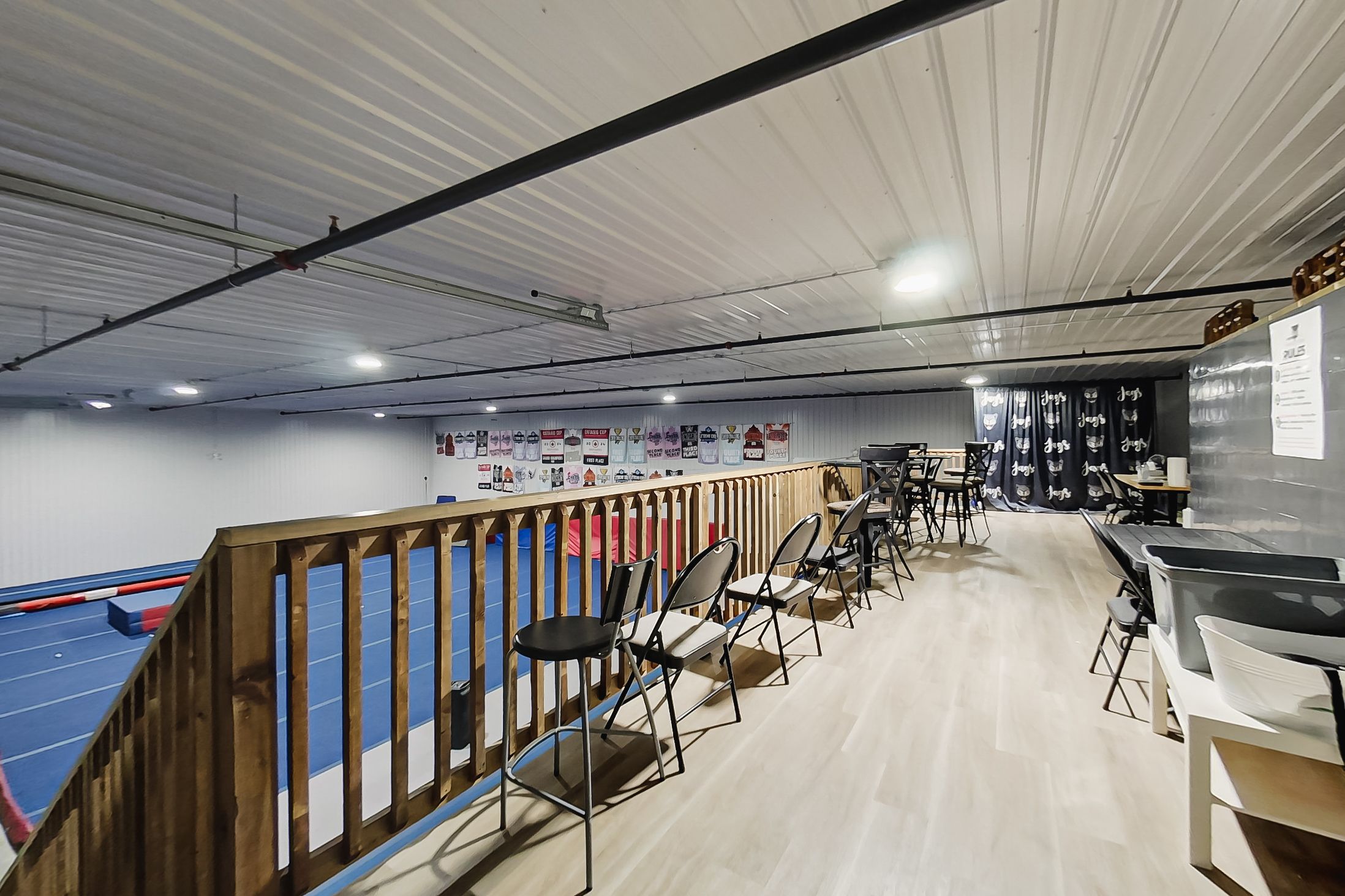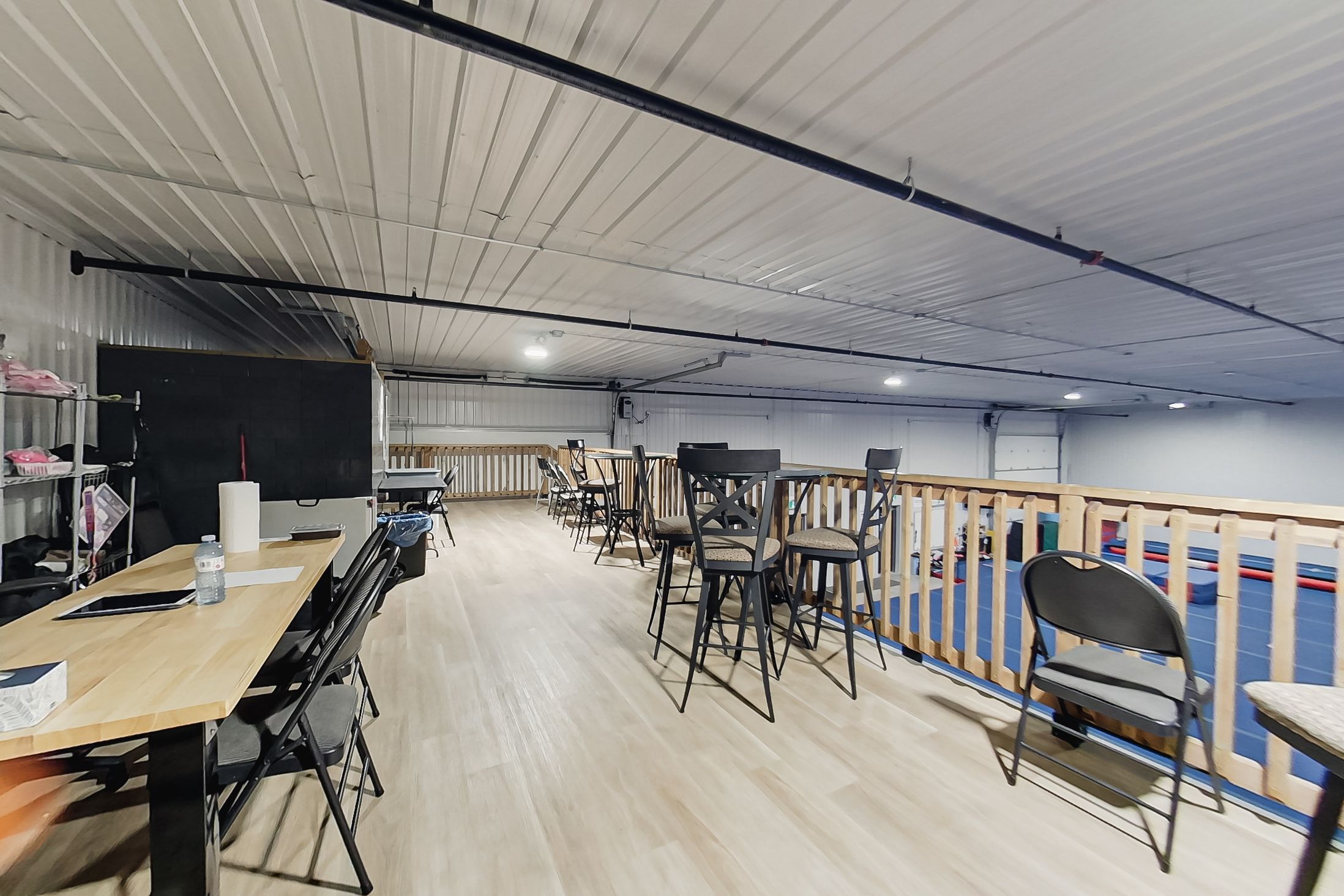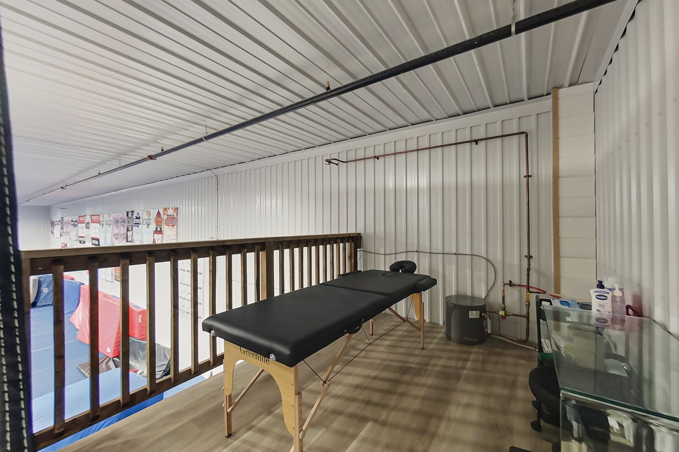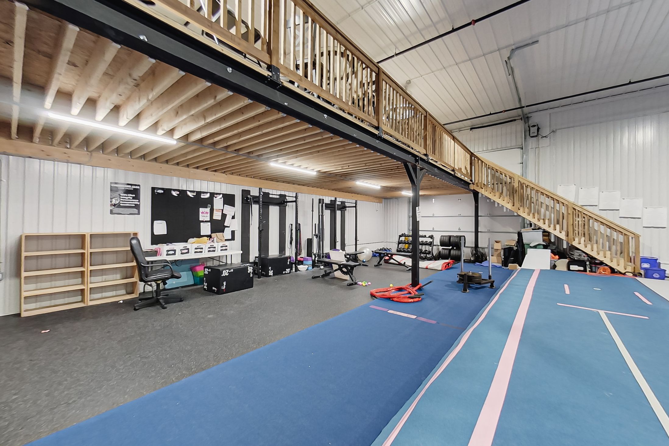 Available for lease from millgar developments, this premium industrial unit is ideally located on the highly sought-after greco court, just off mountain road in collingwood, offering excellent accessibility and professional appeal for a wide range of permitted uses under flexible m5 zoning. The unit features 4,191. 81 square feet of main-floor industrial space with 18-foot clear ceilings, two 14' x 14' drive-in bay doors, two man-door entrances, and energy-efficient in-floor heating. Currently configured as a large open-concept gymnasium, the main space remains largely untouched and ready to accommodate a variety of business visions. A functional layout supports efficient operations, while an additional 715. 19 square feet @18. 50 /sq ft on the second-level mezzanine offers versatile space suitable for a viewing area, office, or other business needs. Other available option is to take half the unit and owners would build division wall.
